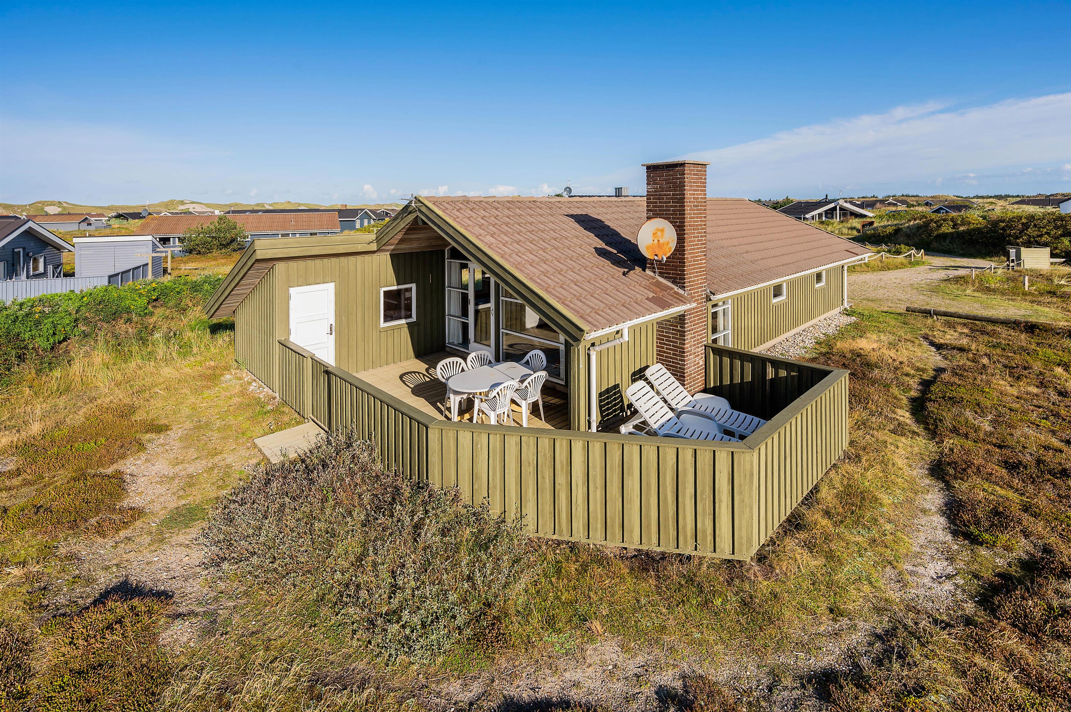 Det hyggelige sommerhus ligger i Bjerregård og kun 450 meter fra den kilometerlange sandstrand. Vesterhavet, stranden og det gode stisystem indbyder til lange gåture i området, som er præget af et skønt hede- og klitlandskab.