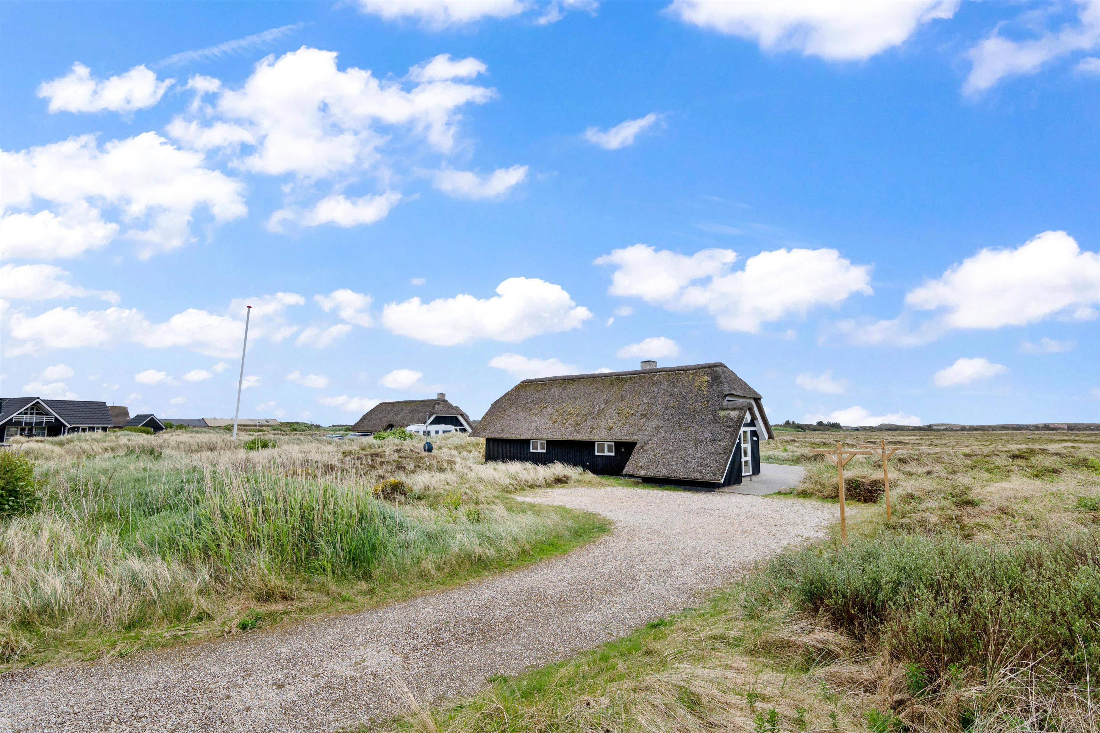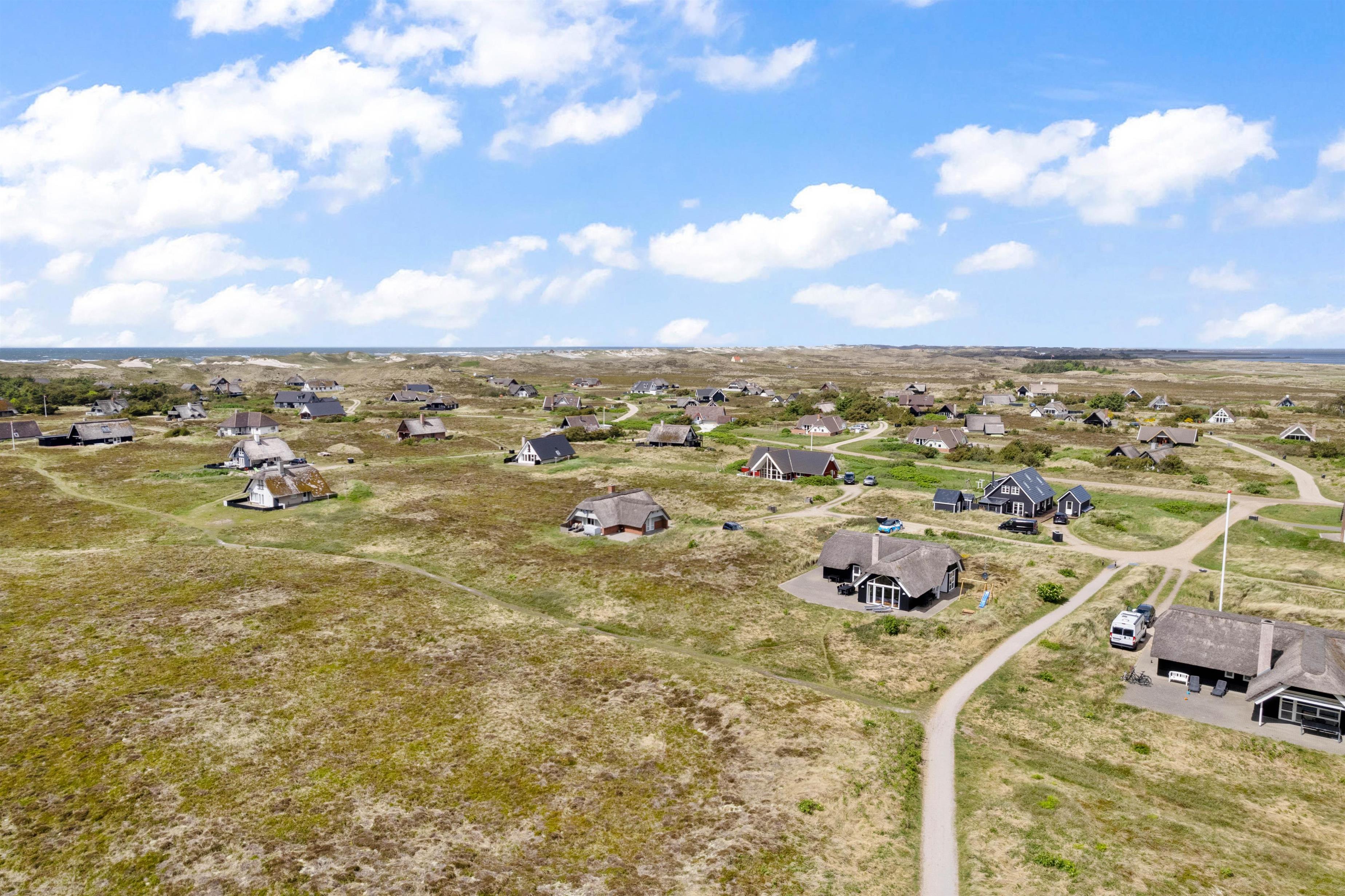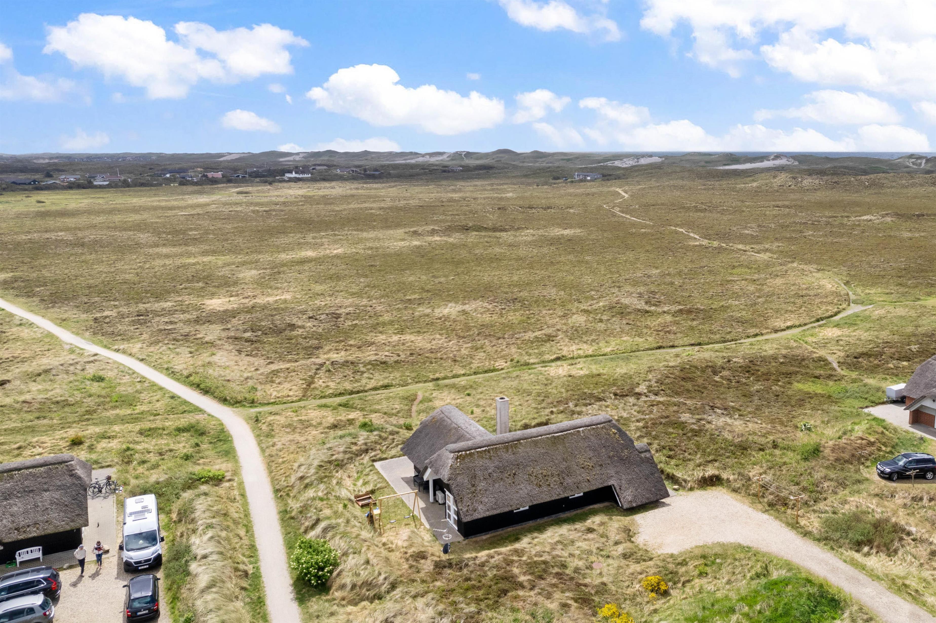 Huset ligger på en stor naturgrund dækket af lyng og marehalm direkte ud til det fredede lynglandskab. Omkring huset er der flere terrasser på i alt 150 m2 samt et legeområde til de mindste. Tæt på huset løber den gamle natursti som fører direkte ned til Vesterhavet over klitterne og gennem det unikke naturområde. Det smukke træhus er bygget i en for egnen traditionel stil med stråtag og som en særlig detalje er tagrygningen af lokal lyng.