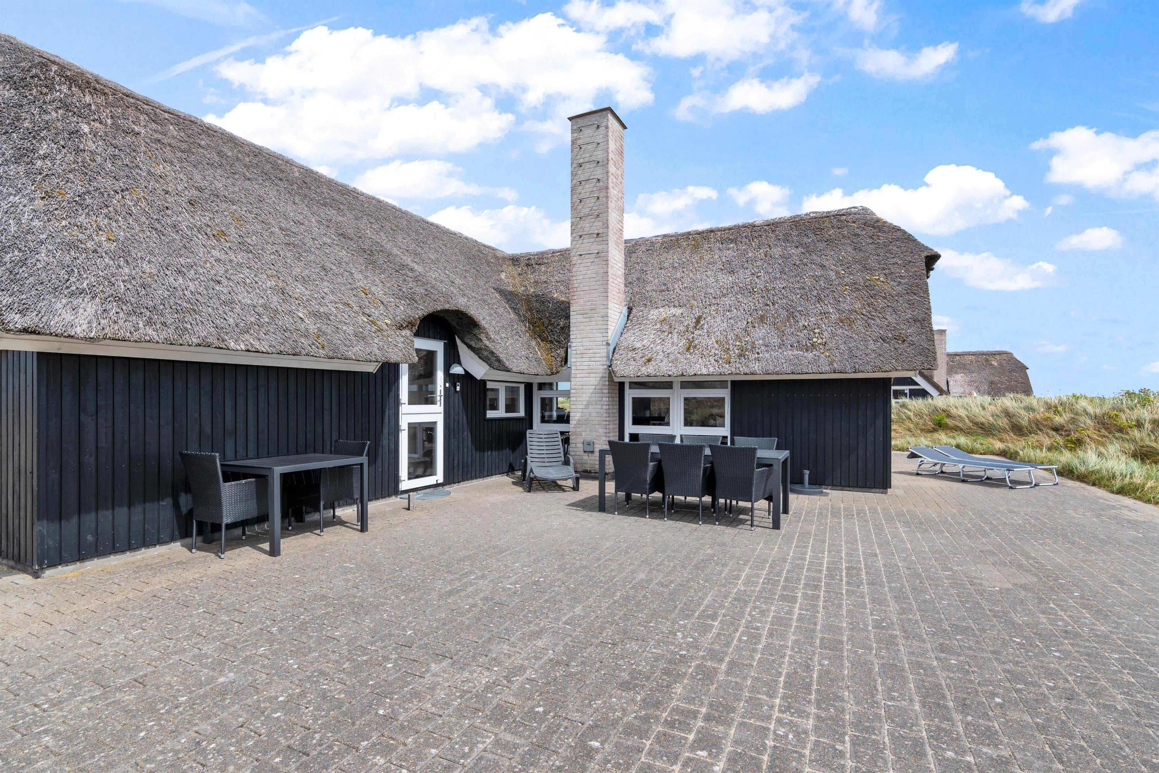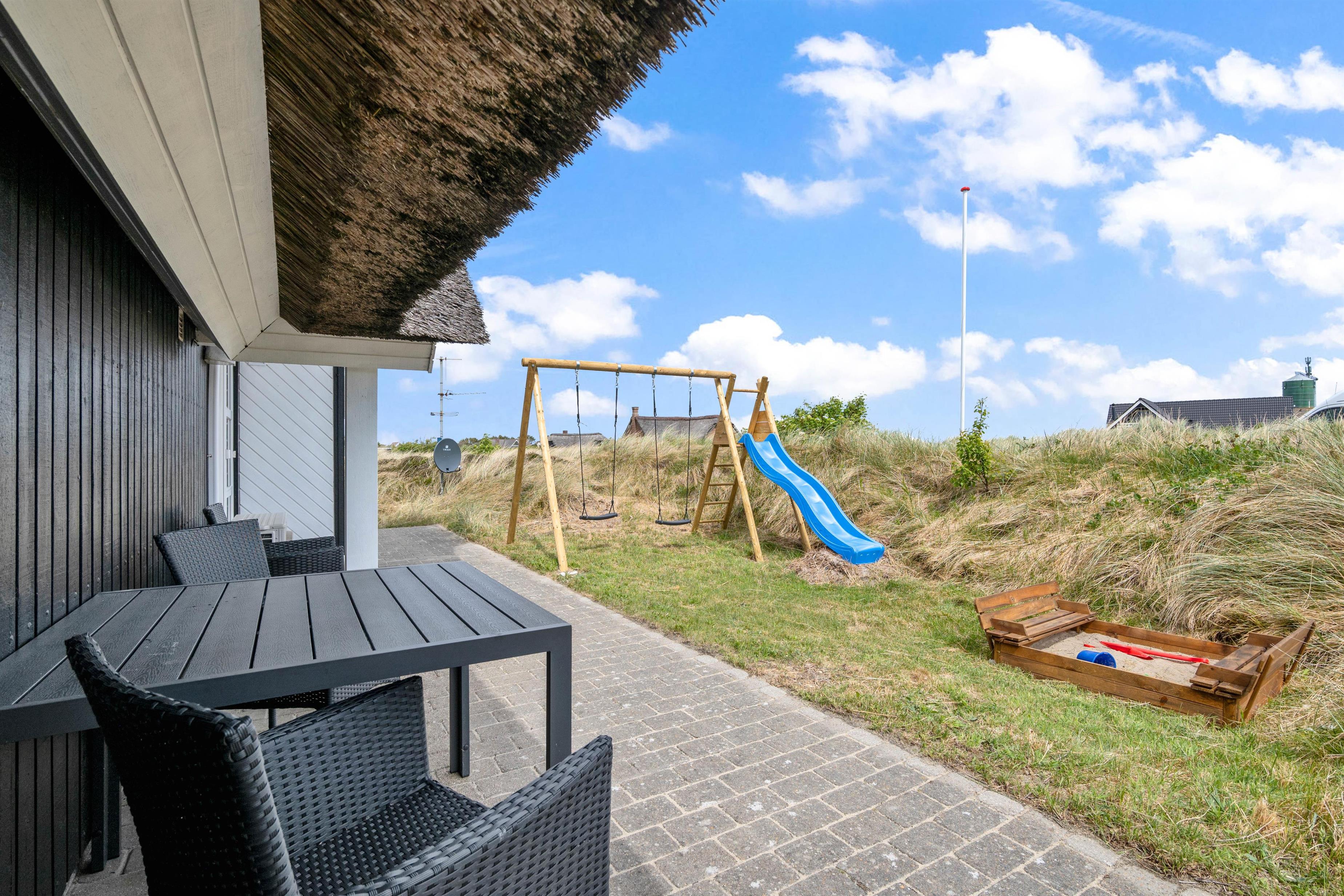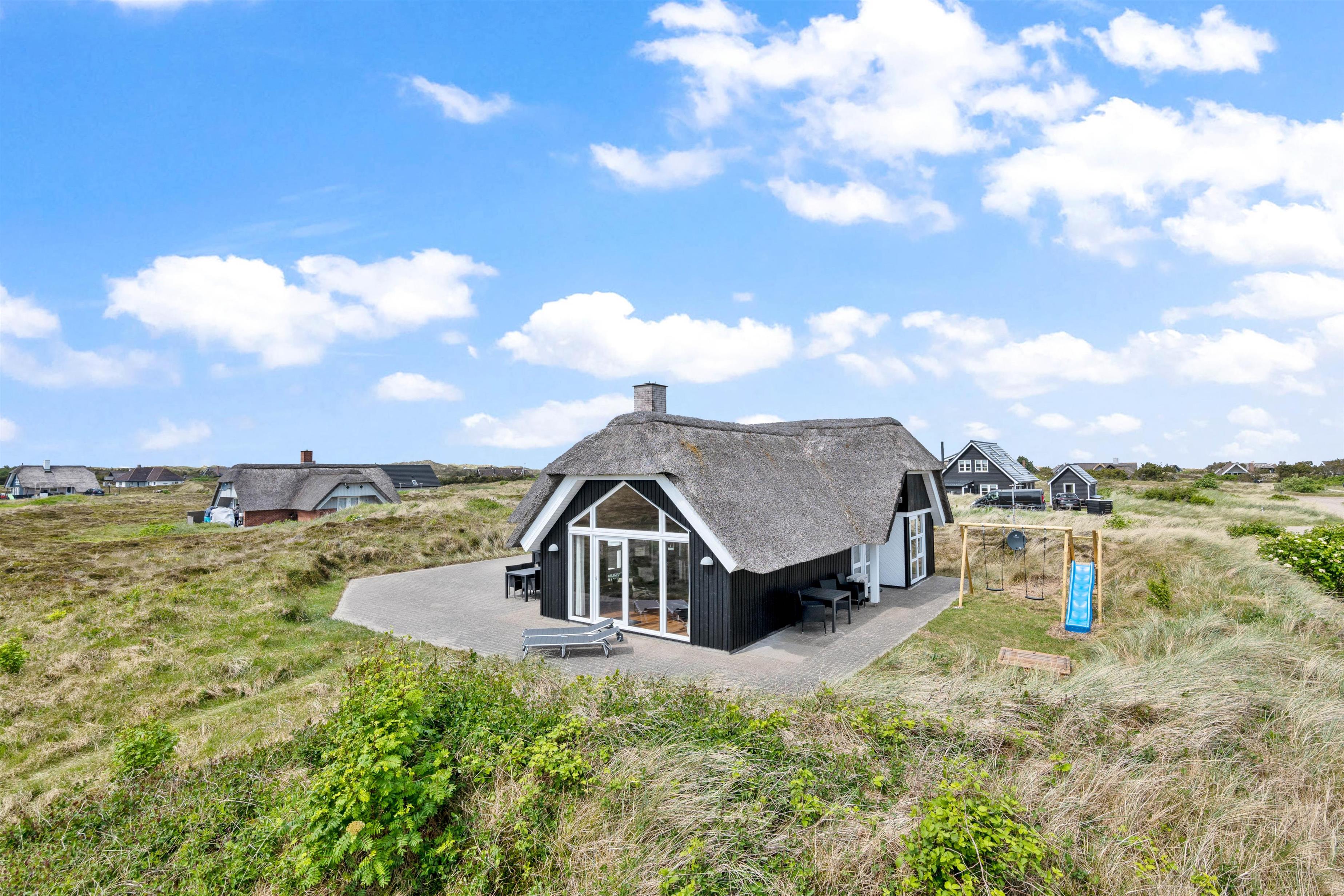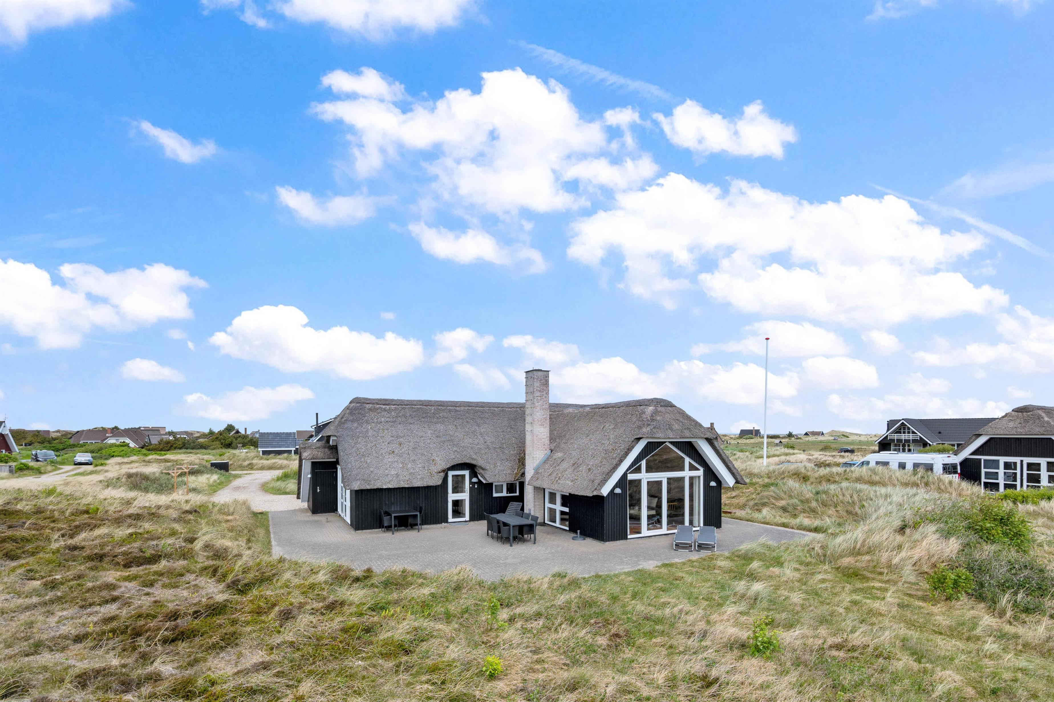 Huset ligger på en stor naturgrund dækket af lyng og marehalm direkte ud til det fredede lynglandskab. Omkring huset er der flere terrasser på i alt 150 m2 samt et legeområde til de mindste. Tæt på huset løber den gamle natursti som fører direkte ned til Vesterhavet over klitterne og gennem det unikke naturområde. Det smukke træhus er bygget i en for egnen traditionel stil med stråtag og som en særlig detalje er tagrygningen af lokal lyng.