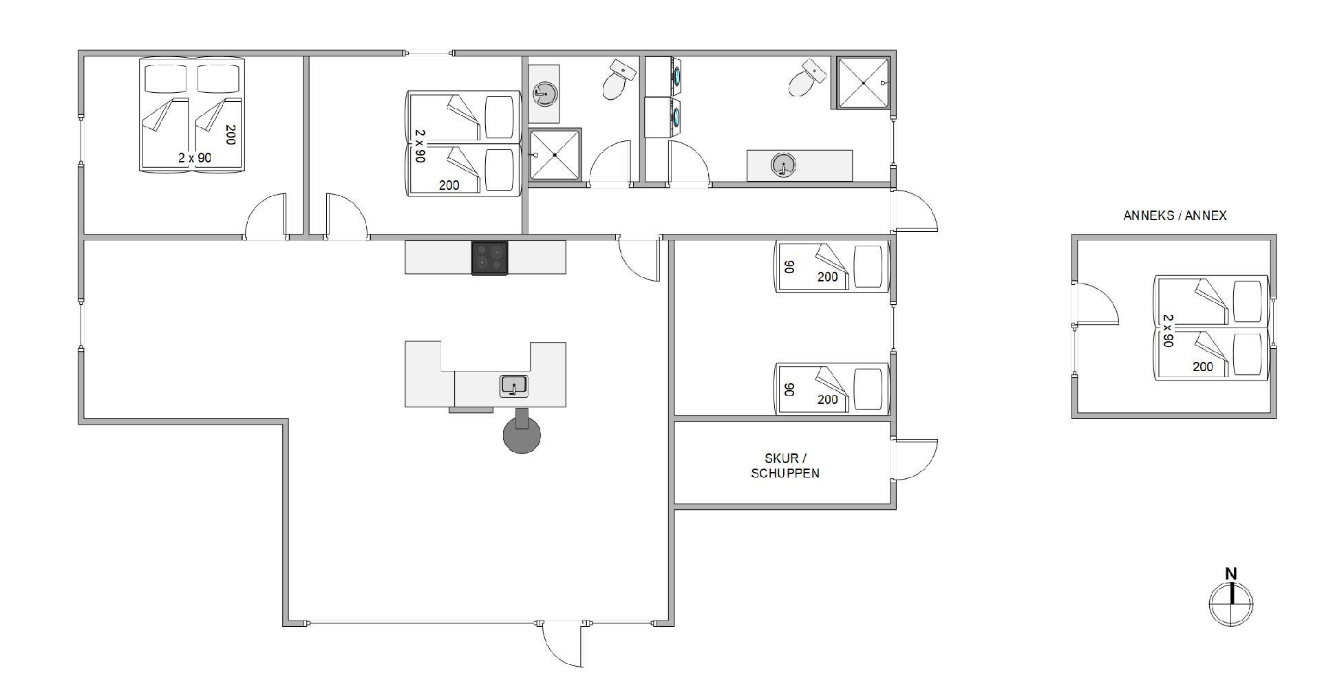 I feriehuset finder I 3 gode soveværelser; 2 med dobbeltsenge og det sidste med 2 enkeltsenge. De sidste 2 sovepladser er i annekset.