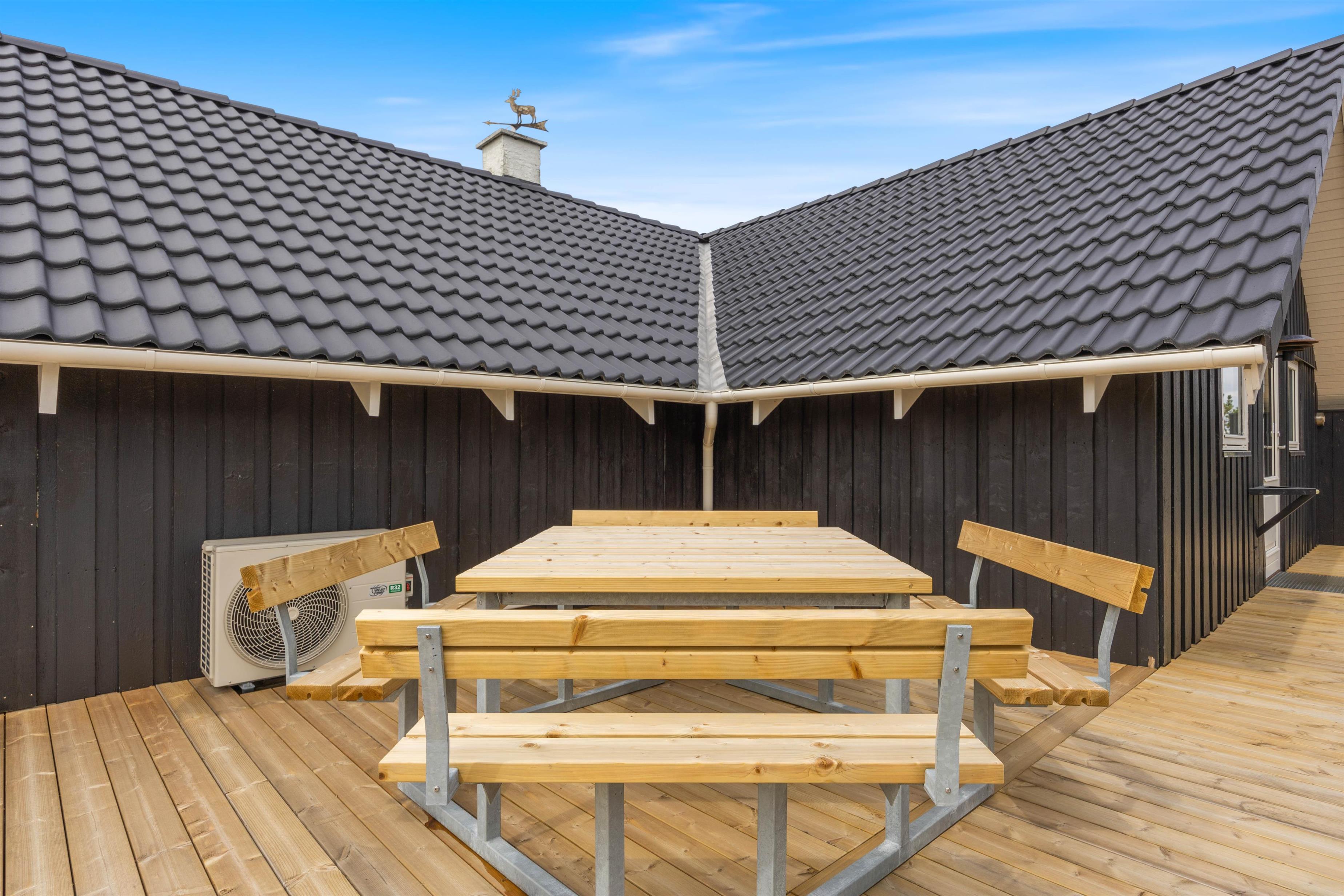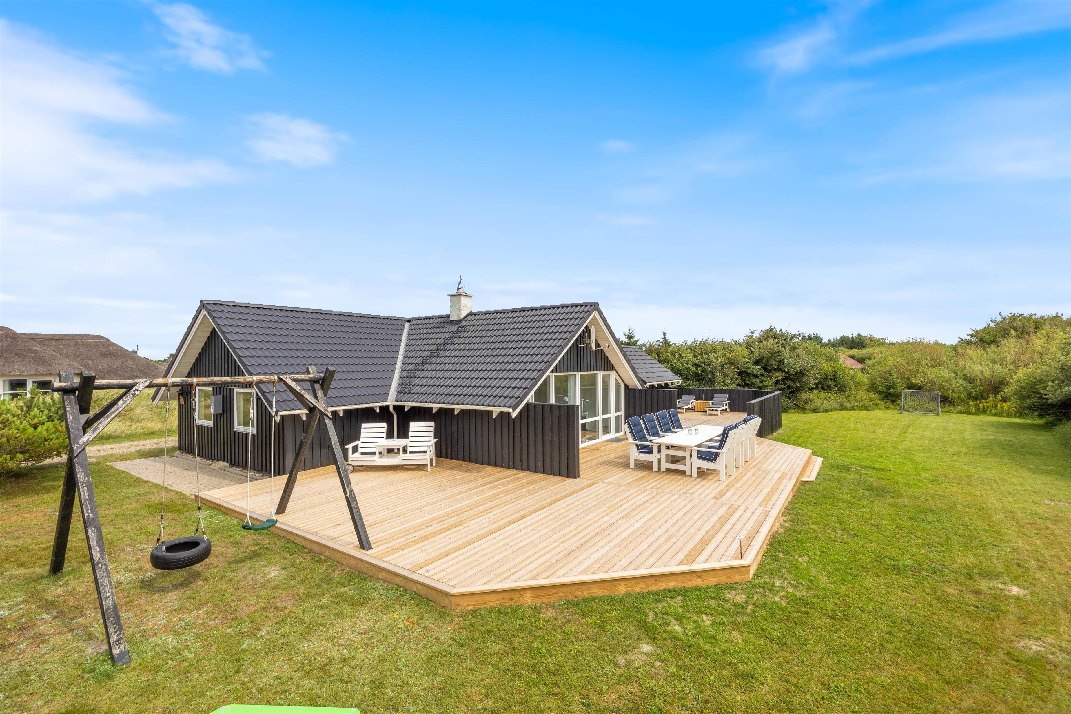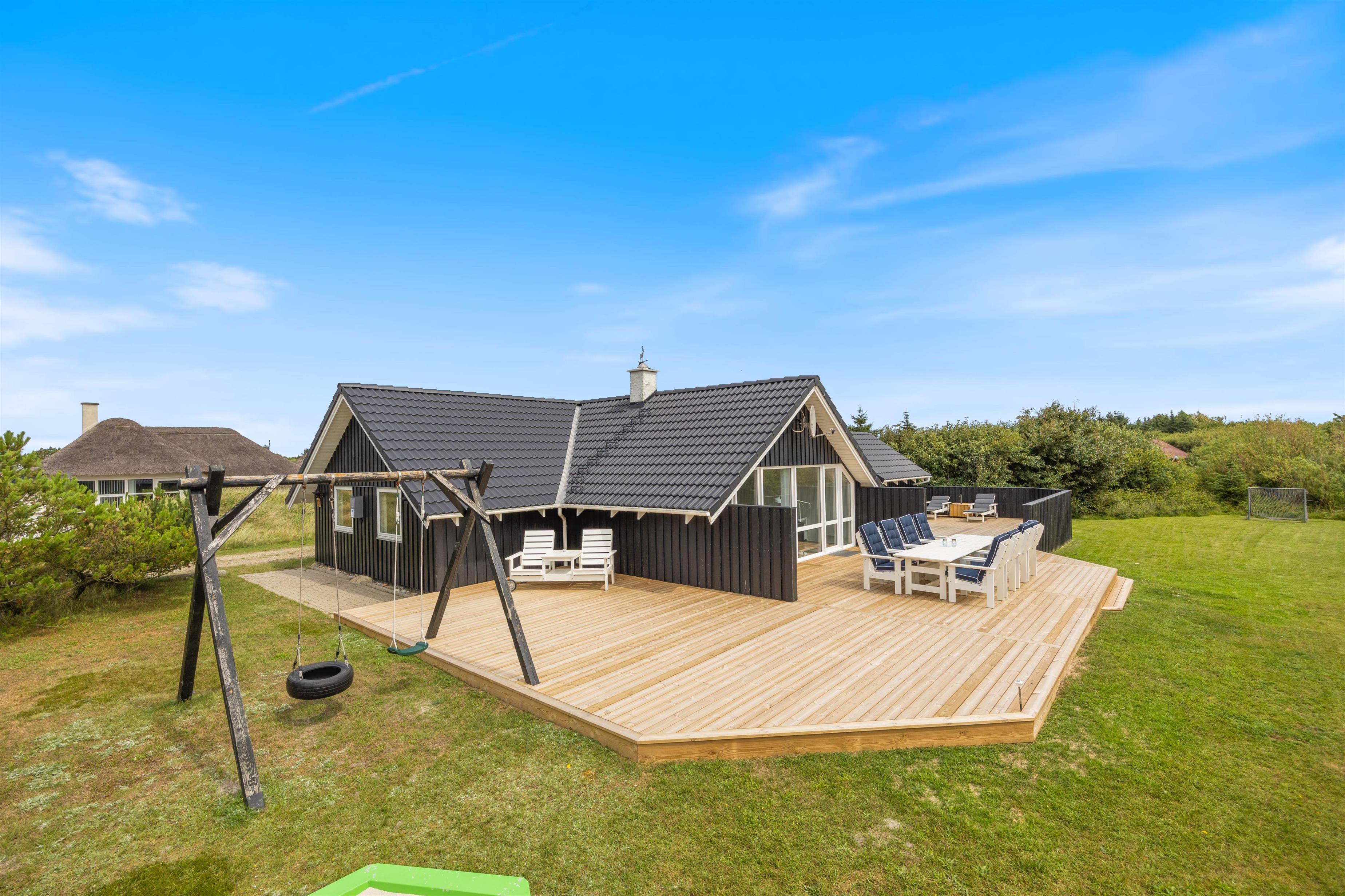 Rundt om hele ferieboligen er der anlagt en skøn fliseterrasse, og der er mange dejlige kroge, der giver mulighed for at nyde solen fra den smukke solopgang mod øst til den lige så betagende solnedgang mod vest. Fra opholdsstuen er der udgang til den sydvendte del af terrassen, og her kan I slappe af, mens børnene leger på den store plænegrund med gynger og sandkasse inden for synsvidde.