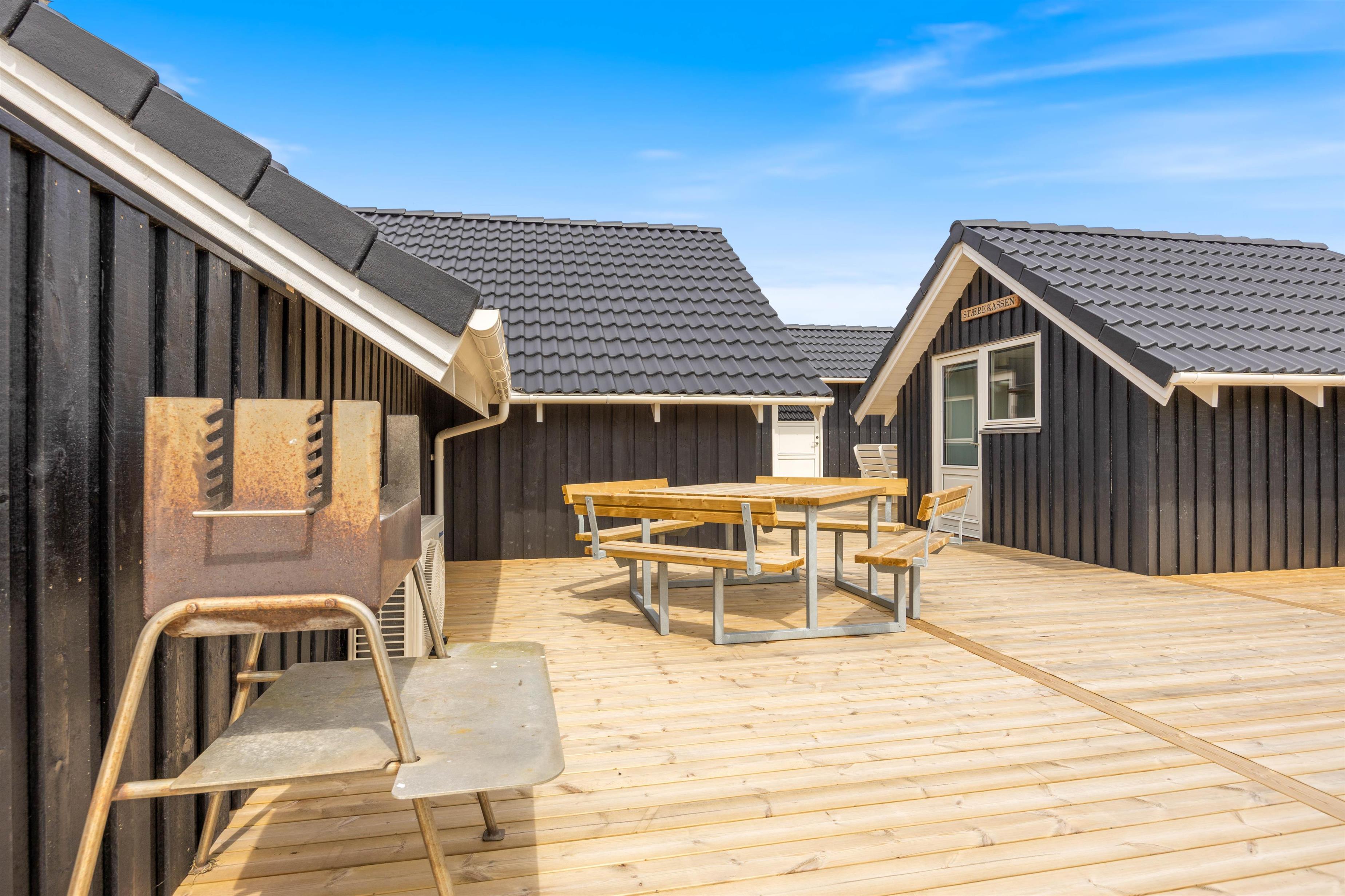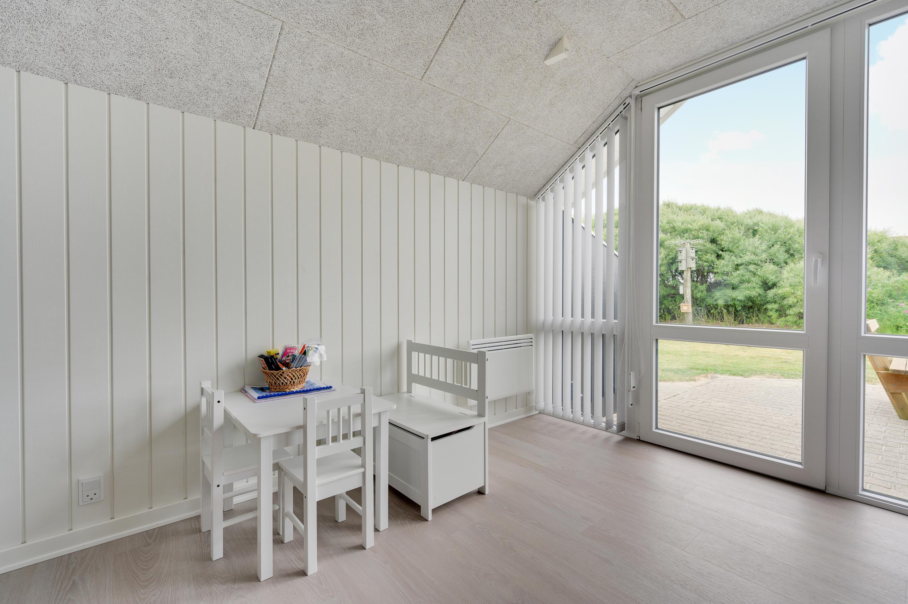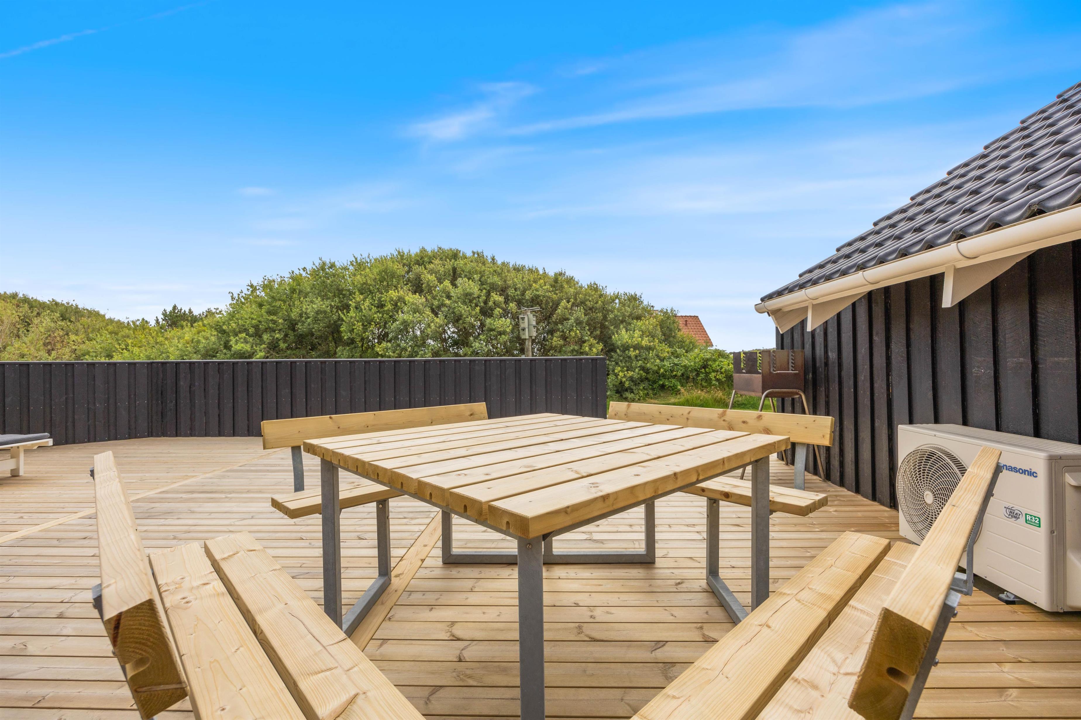 Rundt om hele ferieboligen er der anlagt en skøn fliseterrasse, og der er mange dejlige kroge, der giver mulighed for at nyde solen fra den smukke solopgang mod øst til den lige så betagende solnedgang mod vest. Fra opholdsstuen er der udgang til den sydvendte del af terrassen, og her kan I slappe af, mens børnene leger på den store plænegrund med gynger og sandkasse inden for synsvidde.