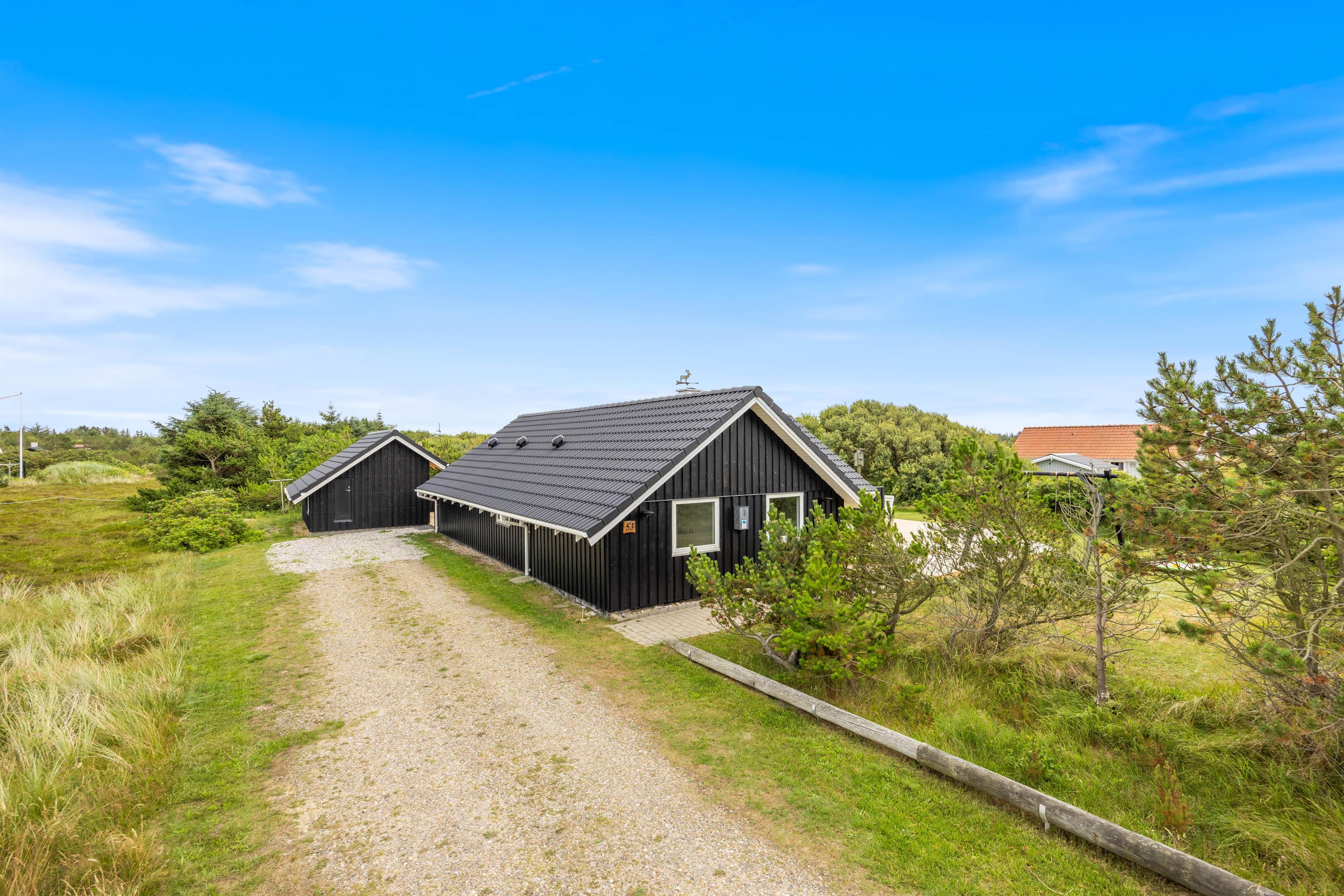 Det charmerende sommerhus er placeret midt på en stor grund omgivet af vildthegn, og der er forholdsmæssigt langt til naboerne, så I kan nyde at være sammen som familie i fred og ro. Det fantastiske Vesterhav ligger i en gåafstand på bare 450 meter fra sommerhuset.