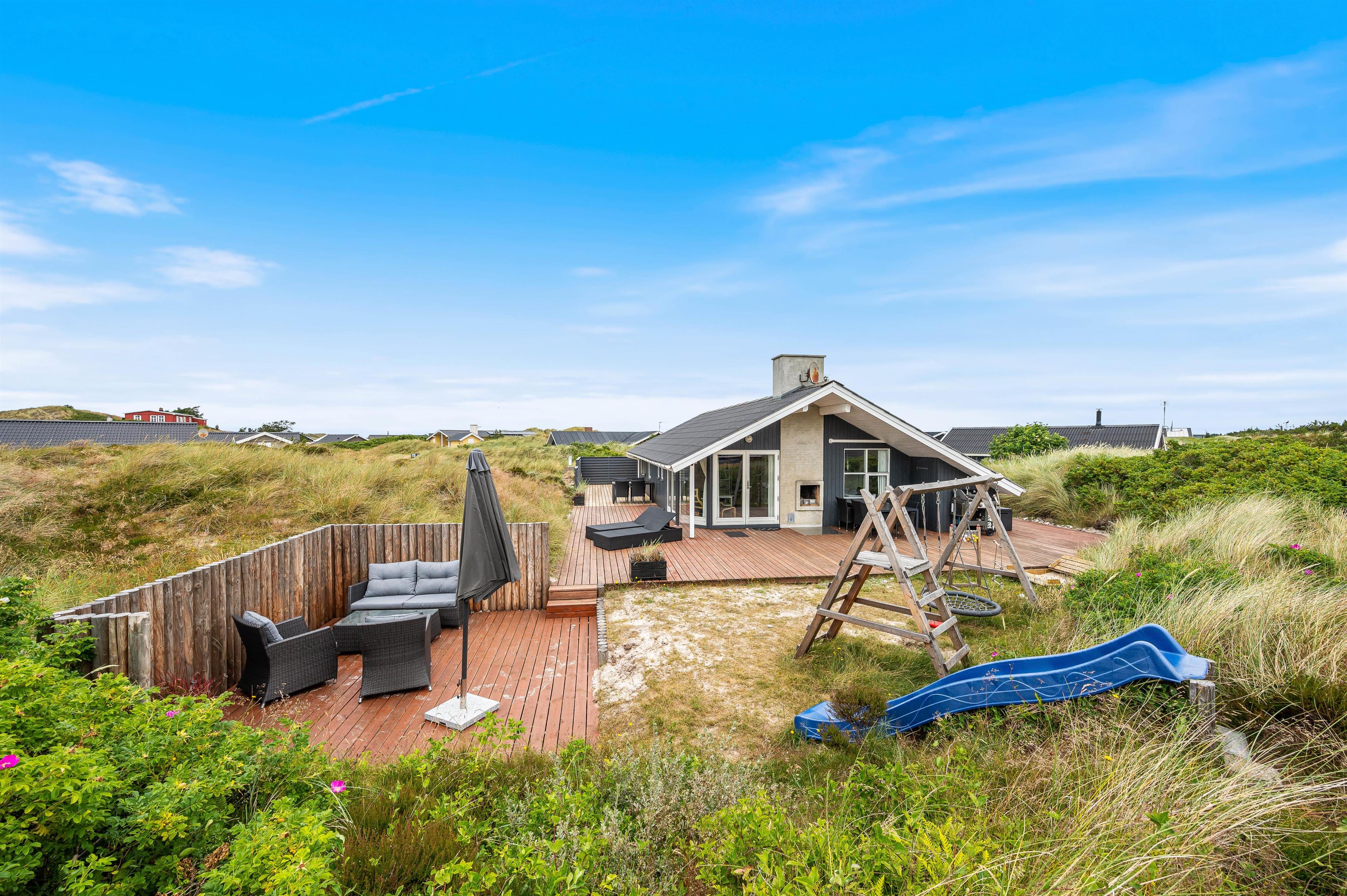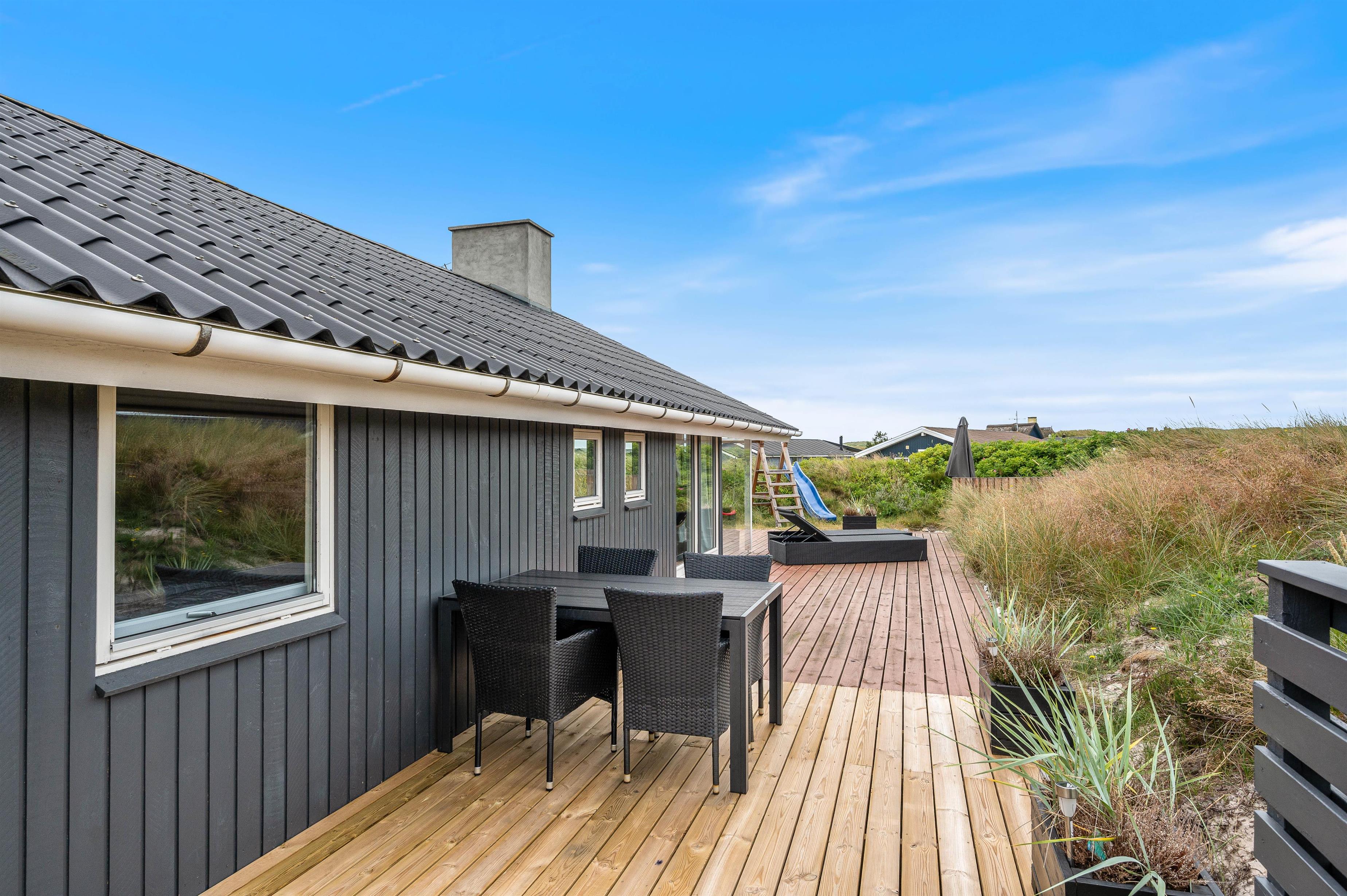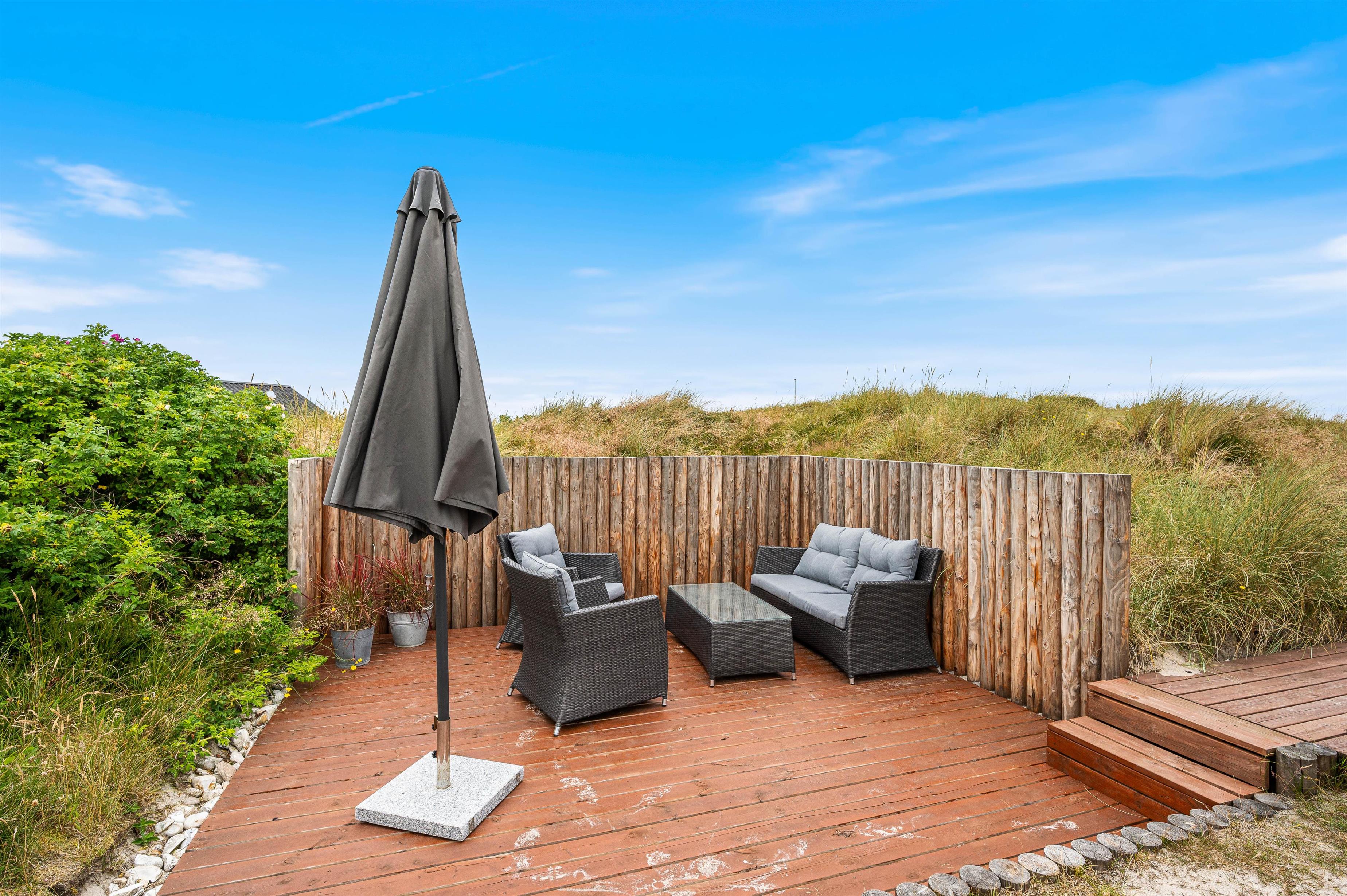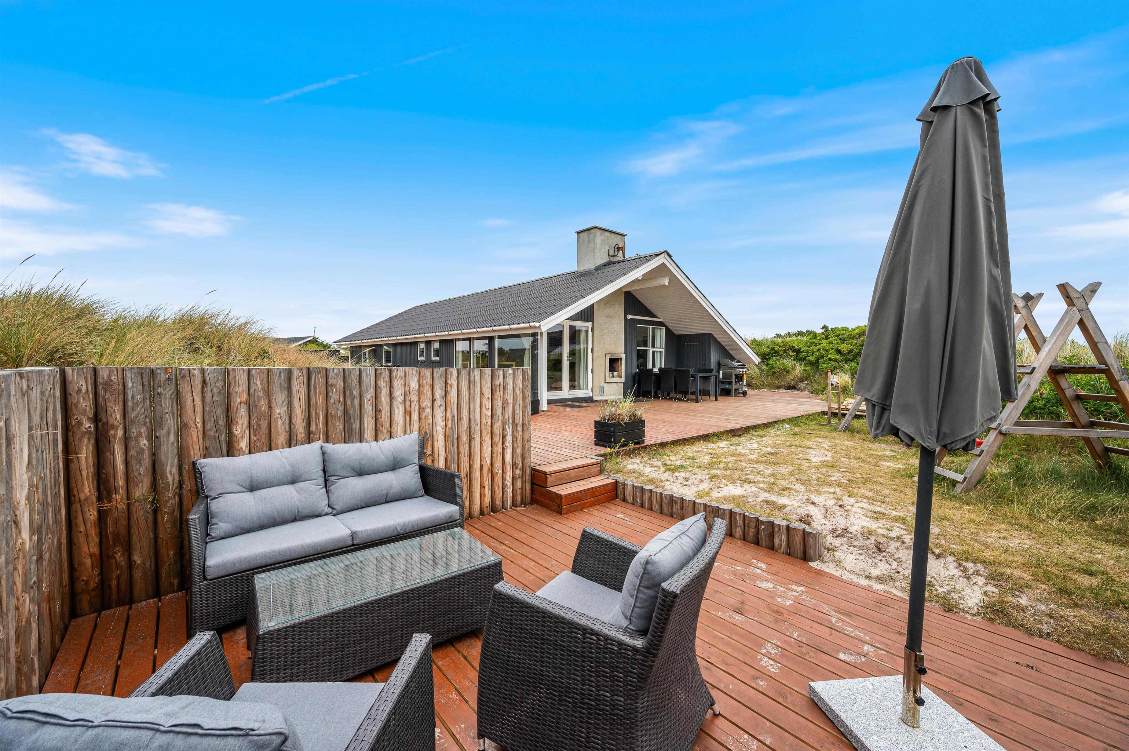 Terrassen er afskærmet og delvist overdækket, så I næsten altid kan sidde ude. Og på de hyggelige grillaftener kan I tænde op i den åbne pejs, som er bygget ind i skorstenen, og på den måde holde varmen efter solen er gået ned bag klitterne.