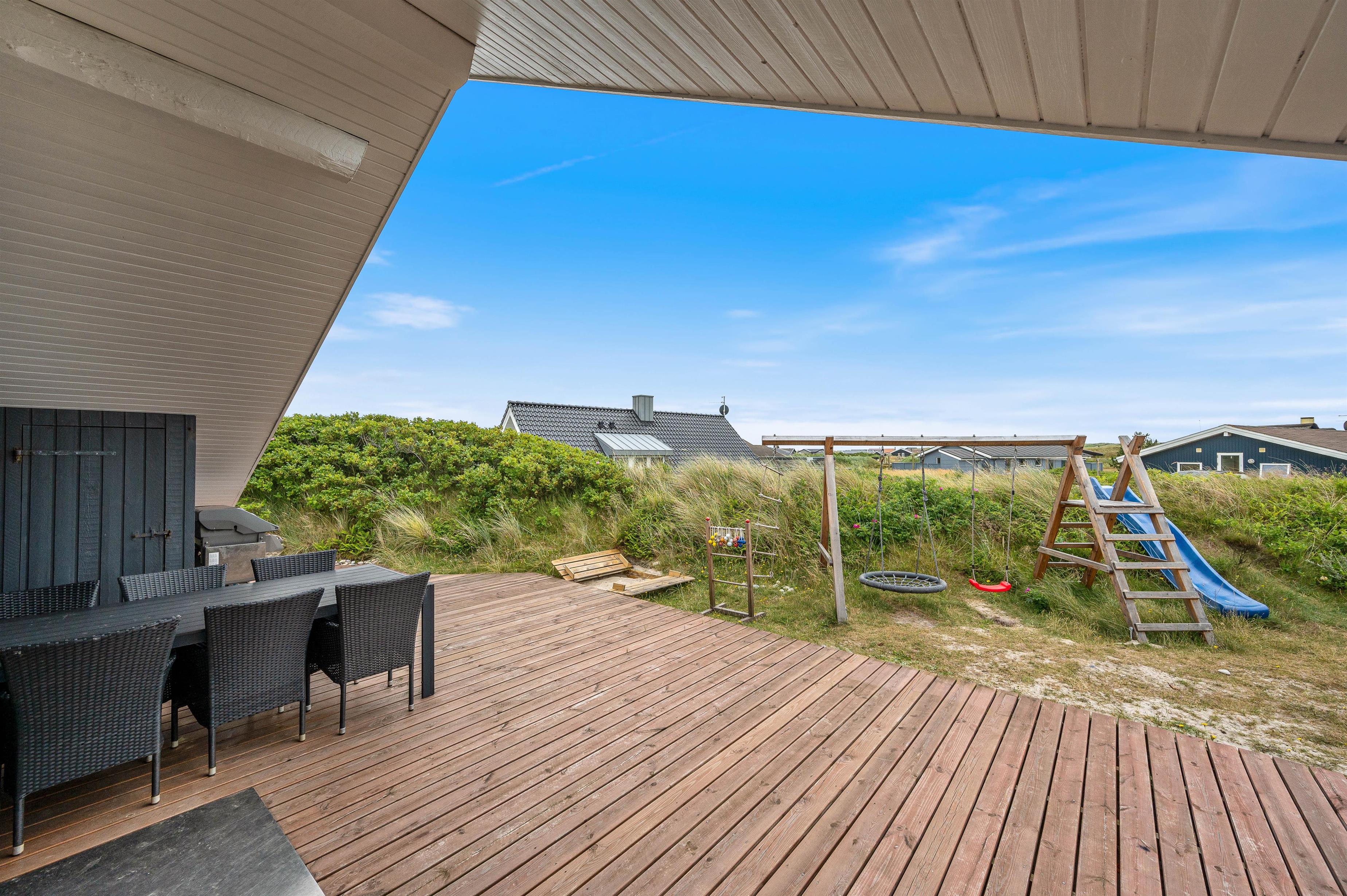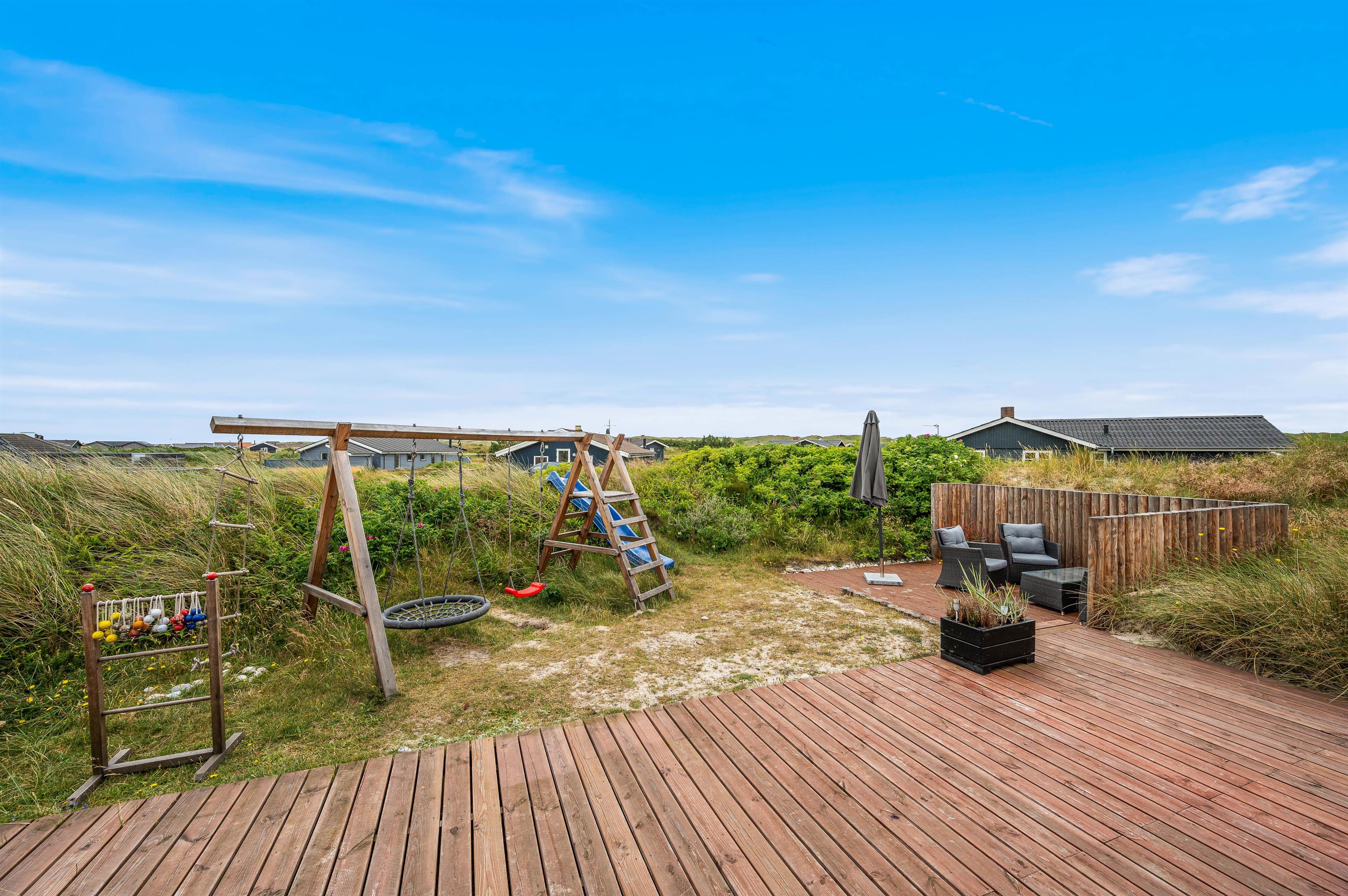 Mod sydvest har feriehuset en rigtig dejlig stor terrasse, hvor I kan sidde og nyde den friske luft og de smukke omgivelser, mens børnene leger på gyngerne og i sandkassen lige ved siden af. På terrassen er der et glasværn, som afskærmer mod vestenvinden.