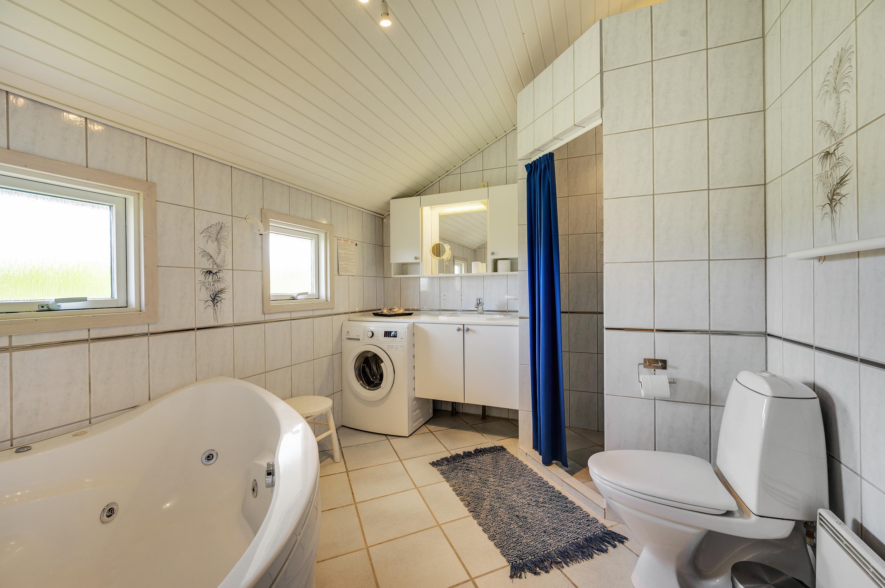 Og trænger I til at blive varmet rigtig godt igennem, kan I nyde et par afslappende stunder i saunaen eller spabadet, som står til rådighed på det store lyse badeværelse.