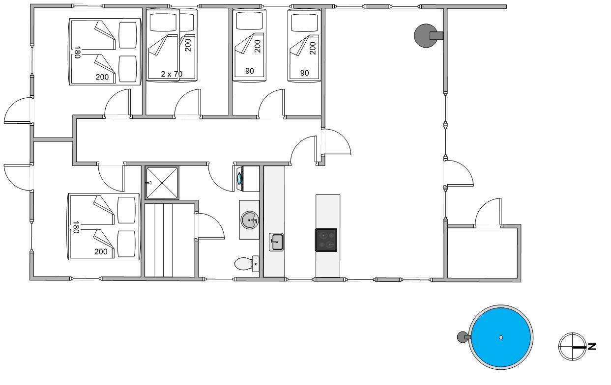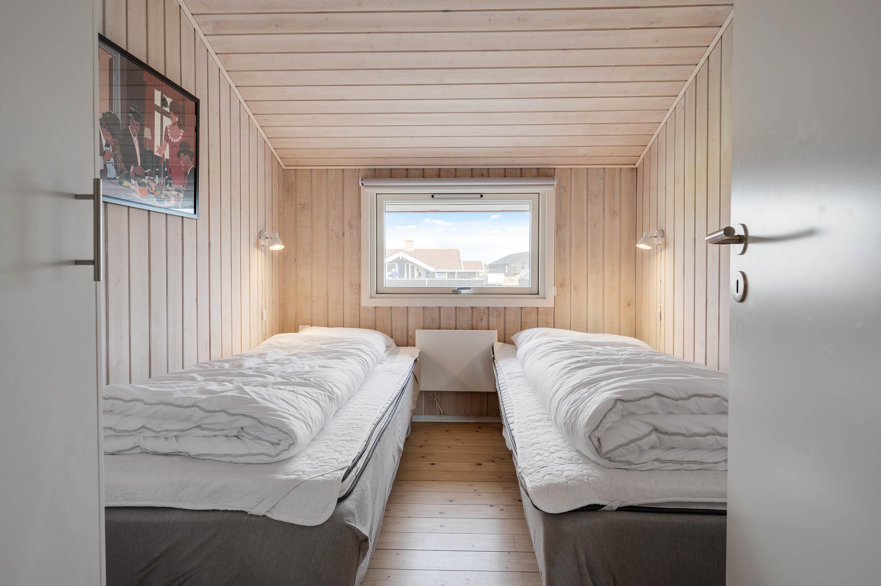 Ferieboligen kan huse op til 8 gæster, og hundene er også velkomne. Sovepladserne fordeler sig på fire gode soveværelser, to med dobbeltseng og et med enkeltsenge. Børnefamilien vil elske det sidste soverum, der er indrettet til børneværelse med køjeseng og legekøkken - her er god plads til leg.