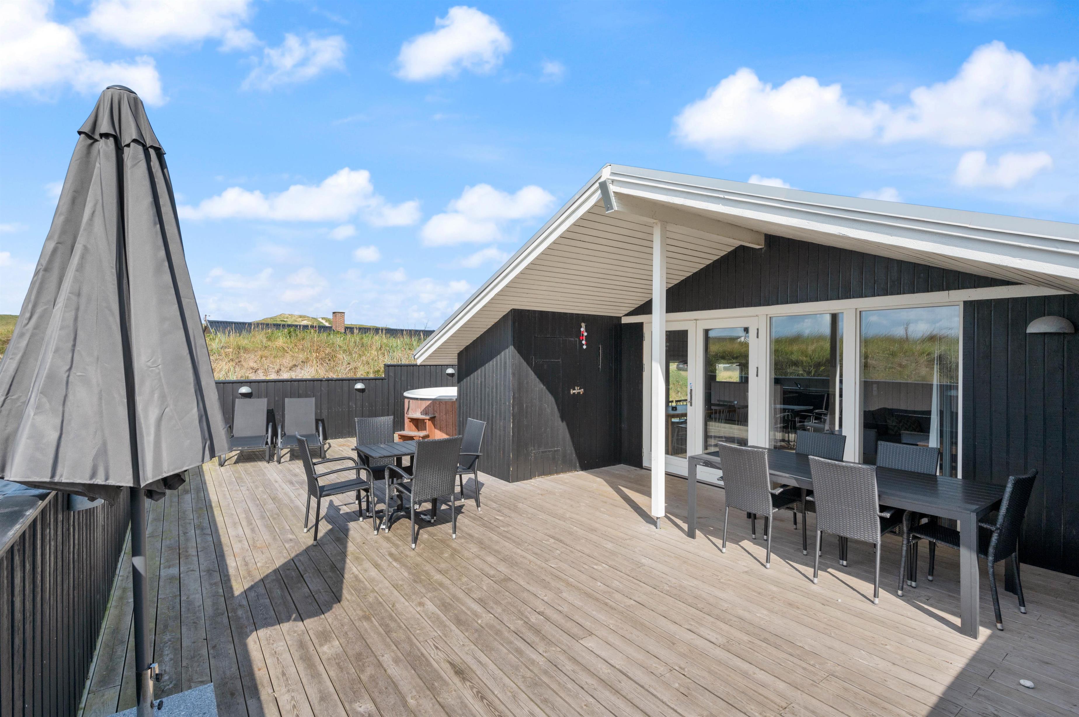 Fra alrummet træder I ud på den store, nordvendte terrasse, der er delvist overdækket og lukket hele vejen rundt. Her har I de bedste forudsætninger for at nyde den friske havluft og den flotte, vestjyske natur; gode havemøbler, liggestole, grill og ikke mindst vildmarksbadet, hvor I kan give ferien endnu et ekstra wellness-touch.