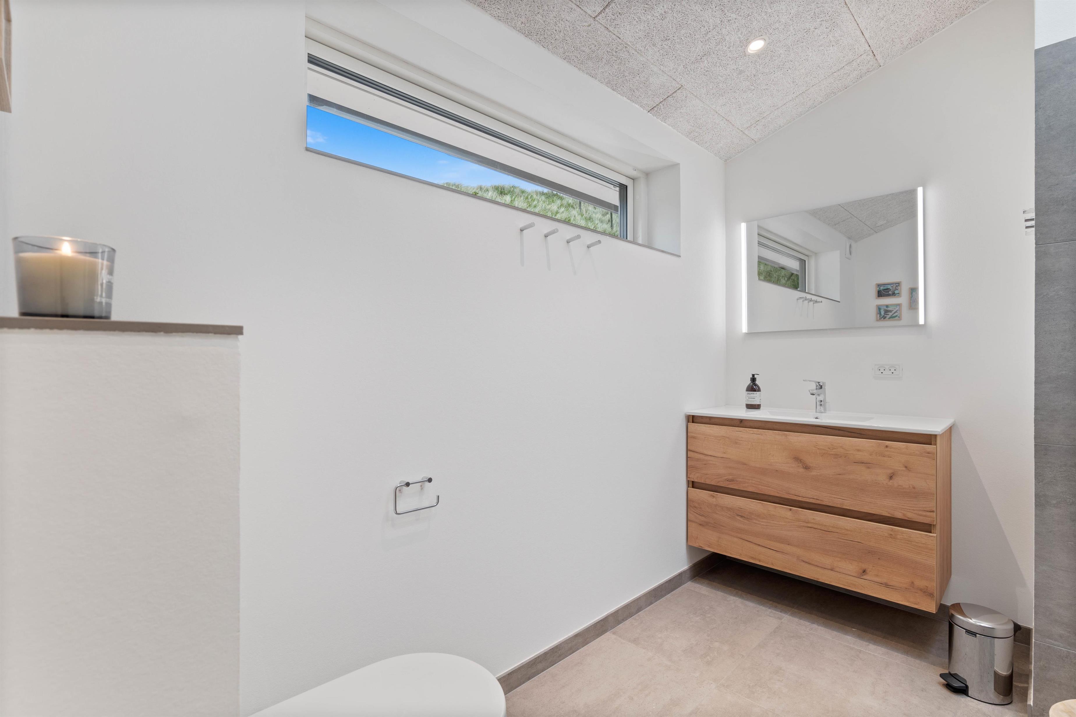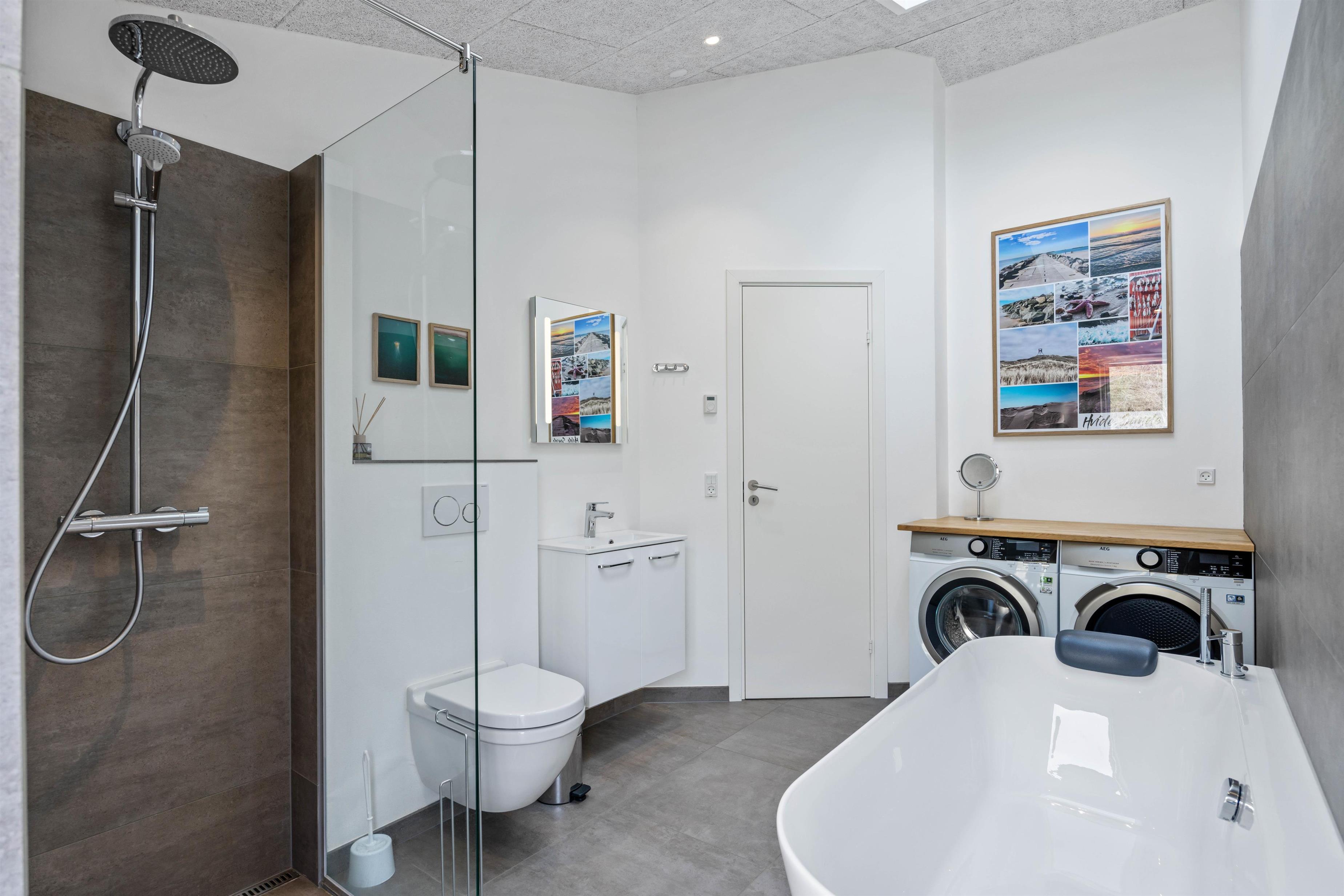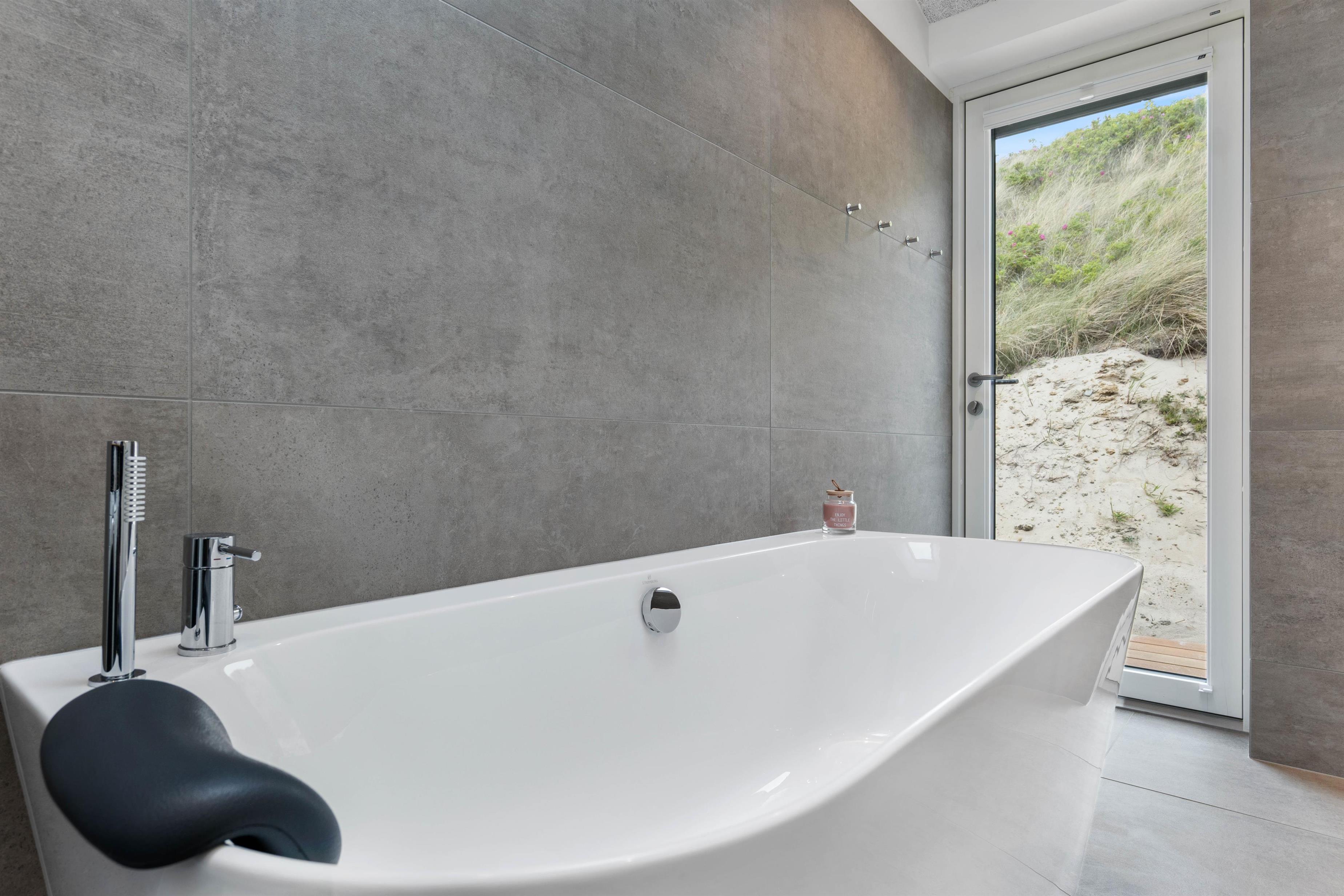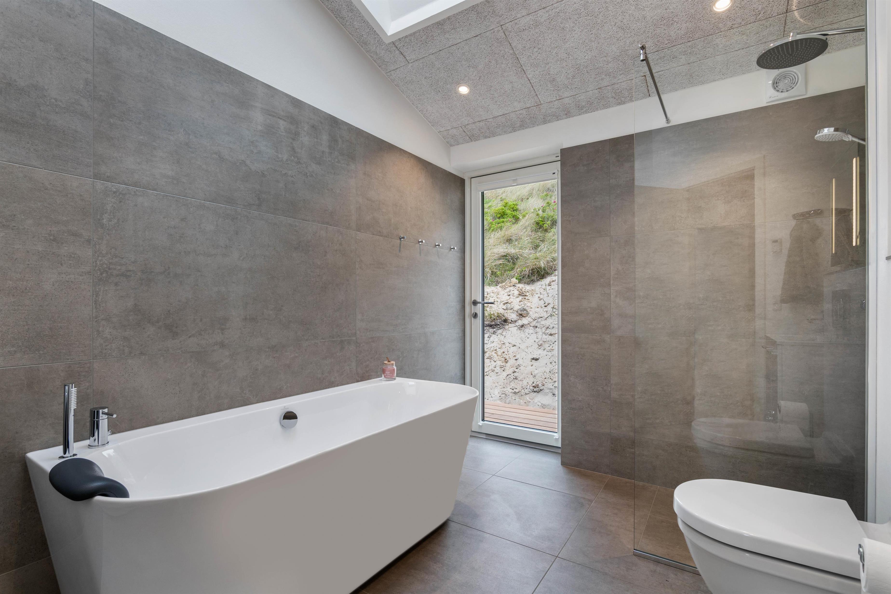 Feriehusets to badeværelser er begge med behagelig gulvvarme og ovenlysvinduer. På det ene badeværelse indbyder badekarret til varme afslappende stunder, hvor musklerne bliver løsnet og hverdagens stress glemmes. Her finder I også to brusere og en 195 L varmtvandsbeholder, god til de lange bade.