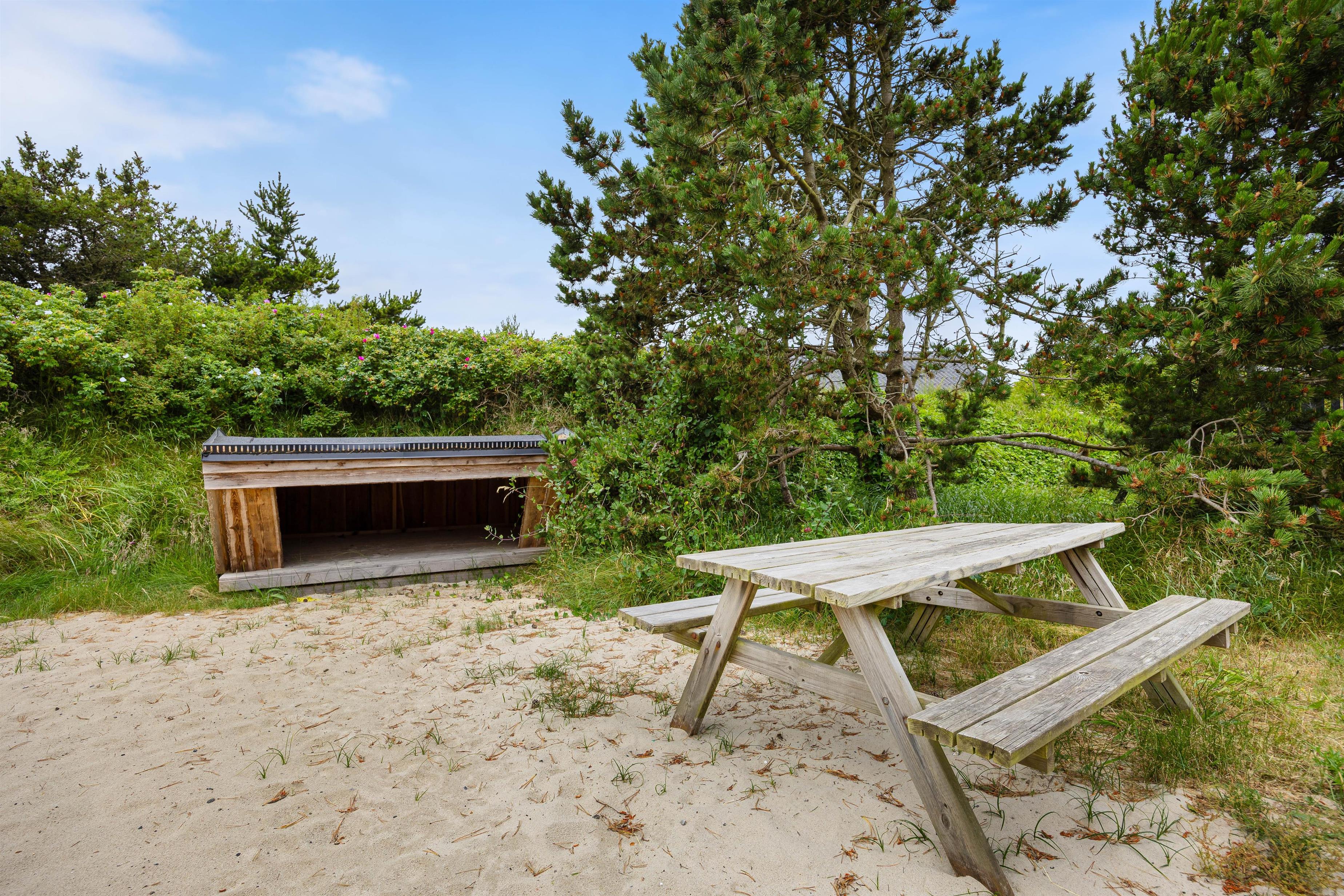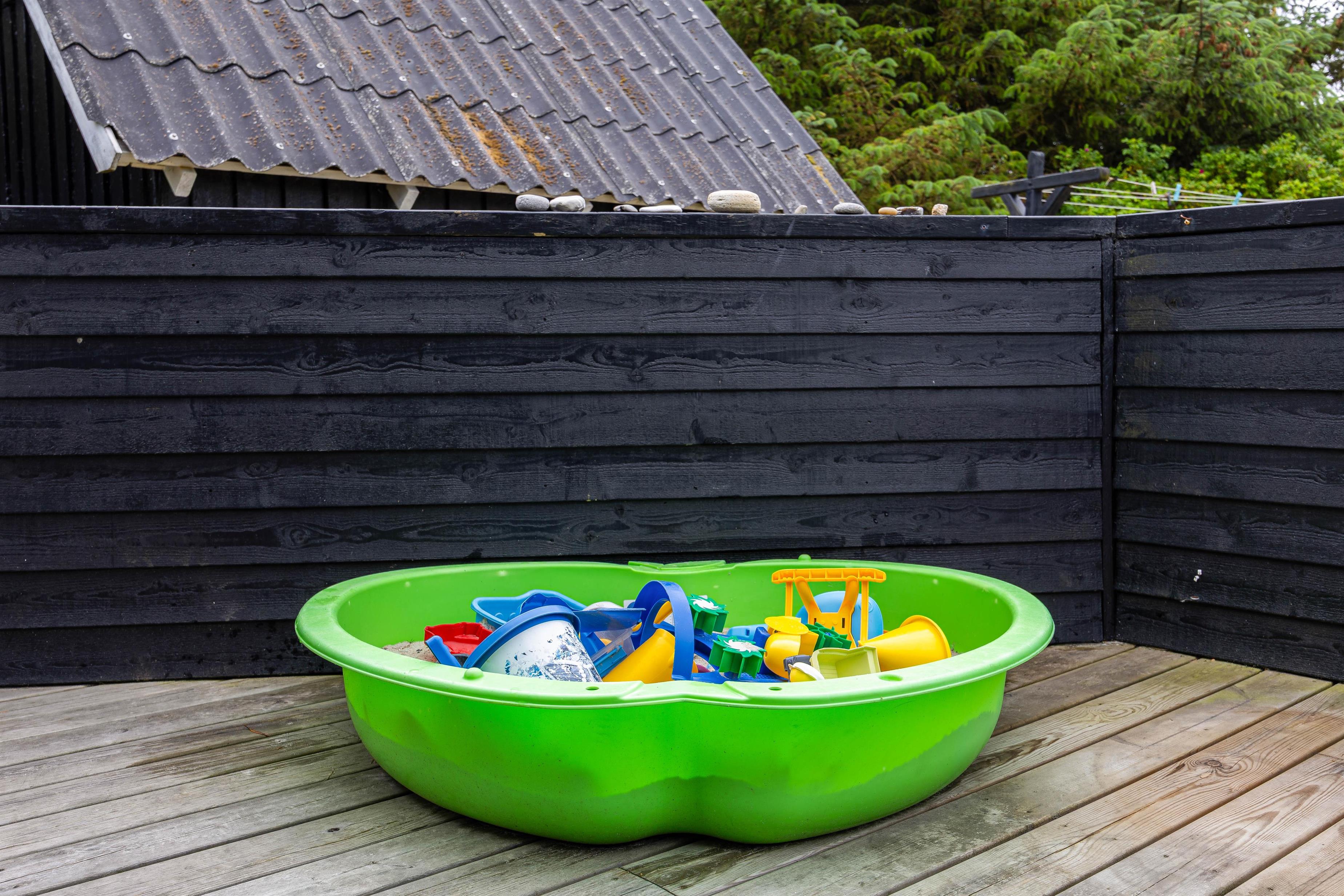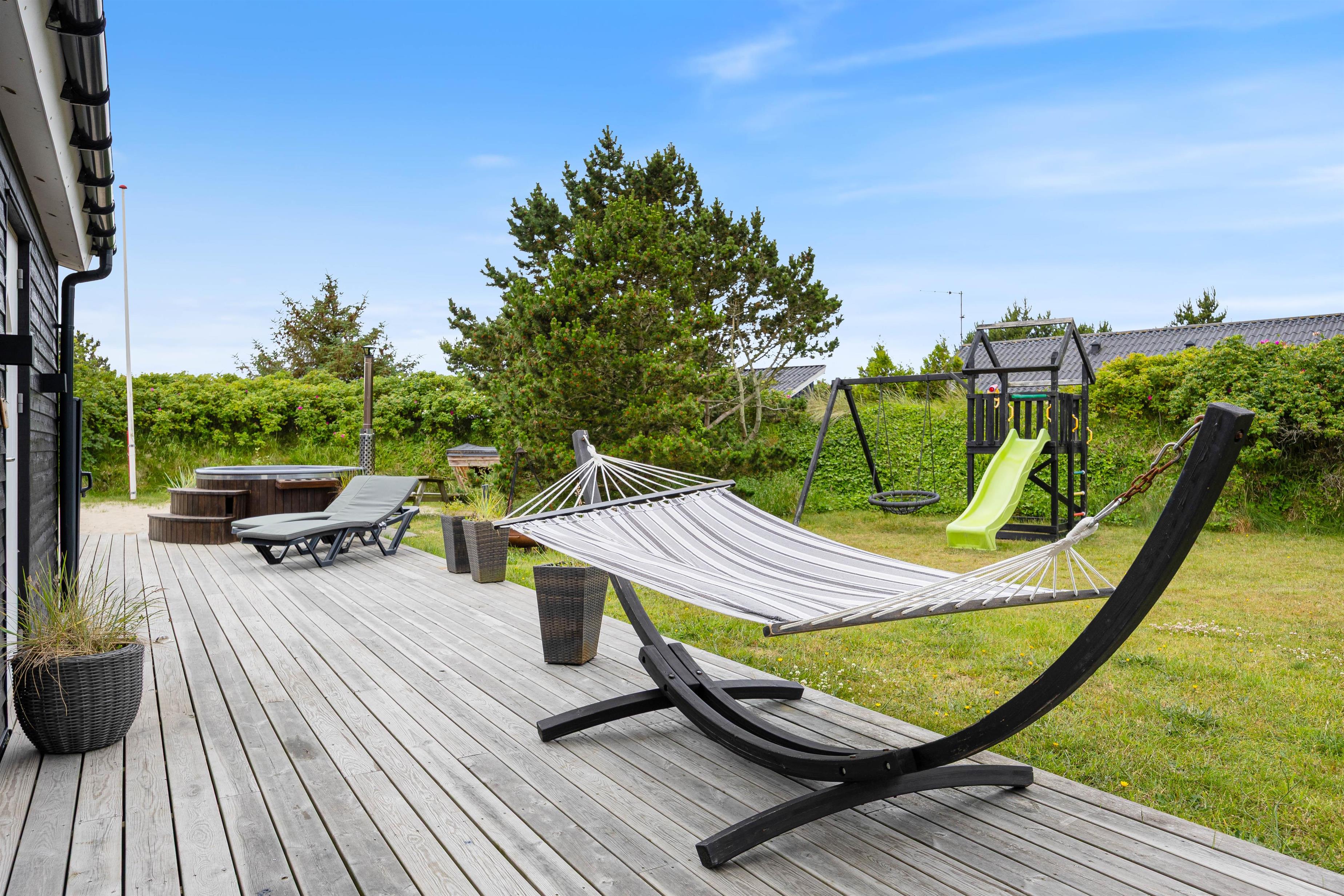 Sommerhusets udendørsområde strækker sig over 1200 kvadratmeter græsplæne. Et legetårn, en shelter, mål og en beachvolleybane giver masser af udendørs underholdning og mulighed for sjove aktiviteter. Slap af på den delvist overdækkede terrasse med komfortable havemøbler samt liggestole og lav lækre grillmåltider på gasgrillen, imens skyggerne bliver lange.