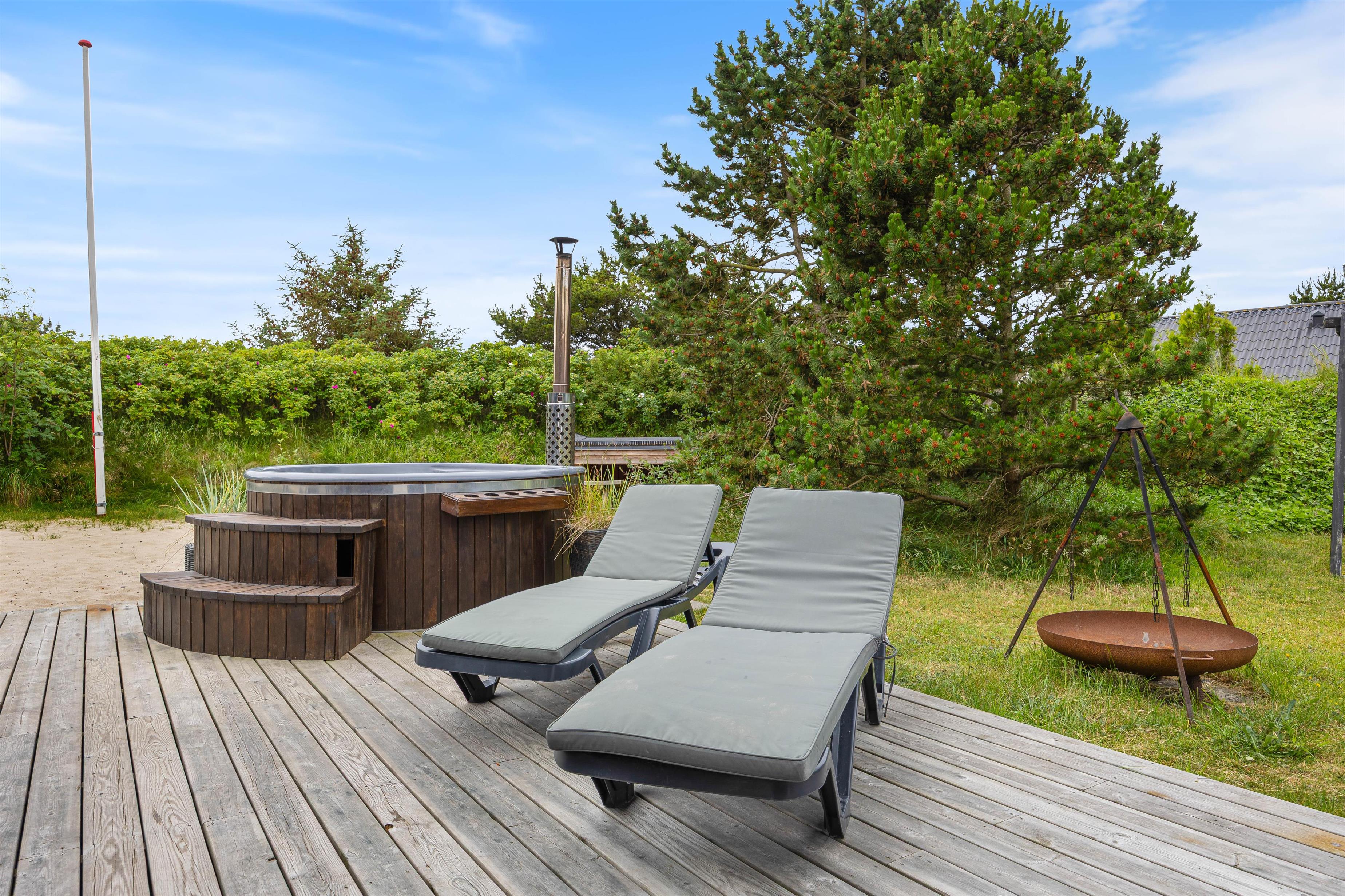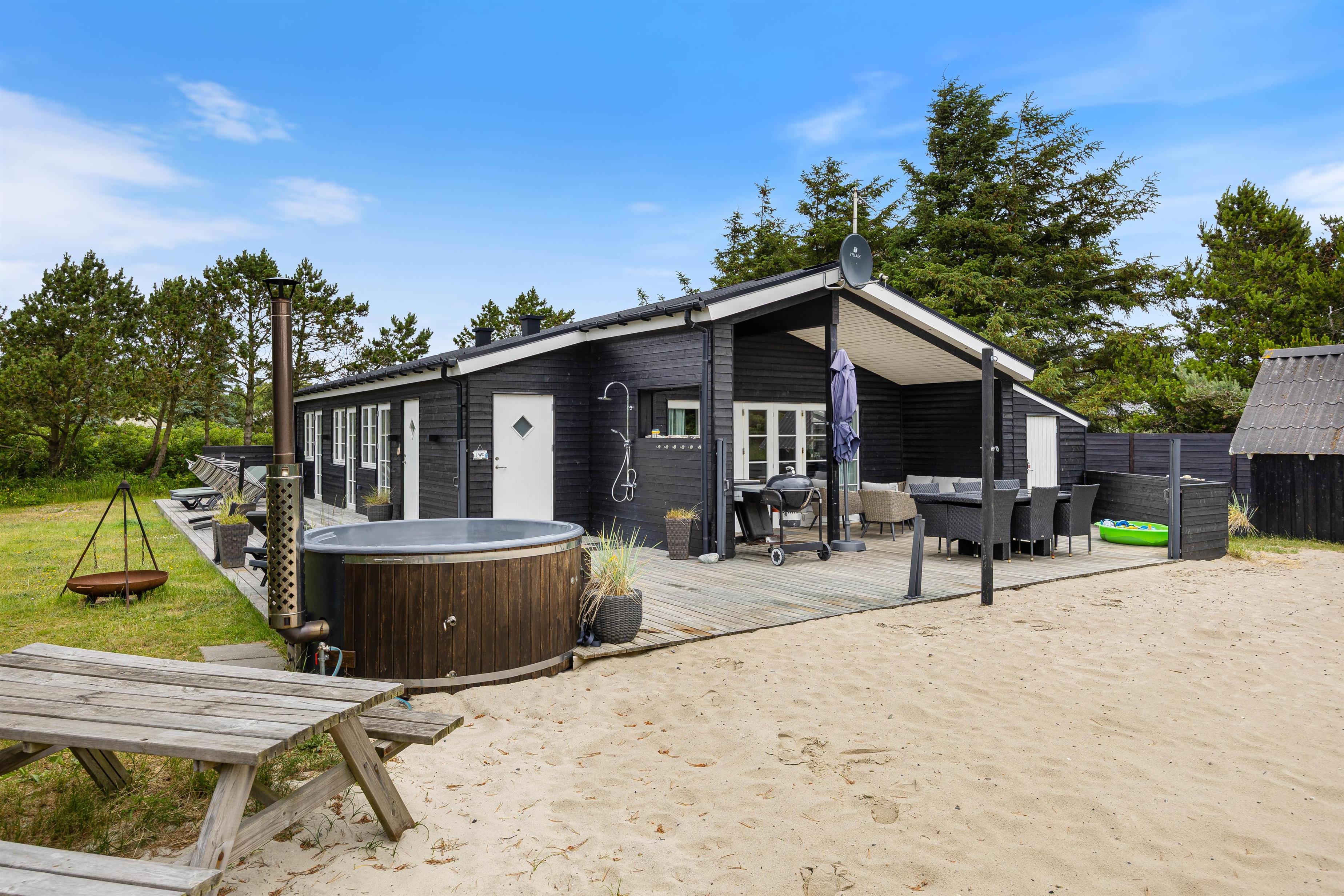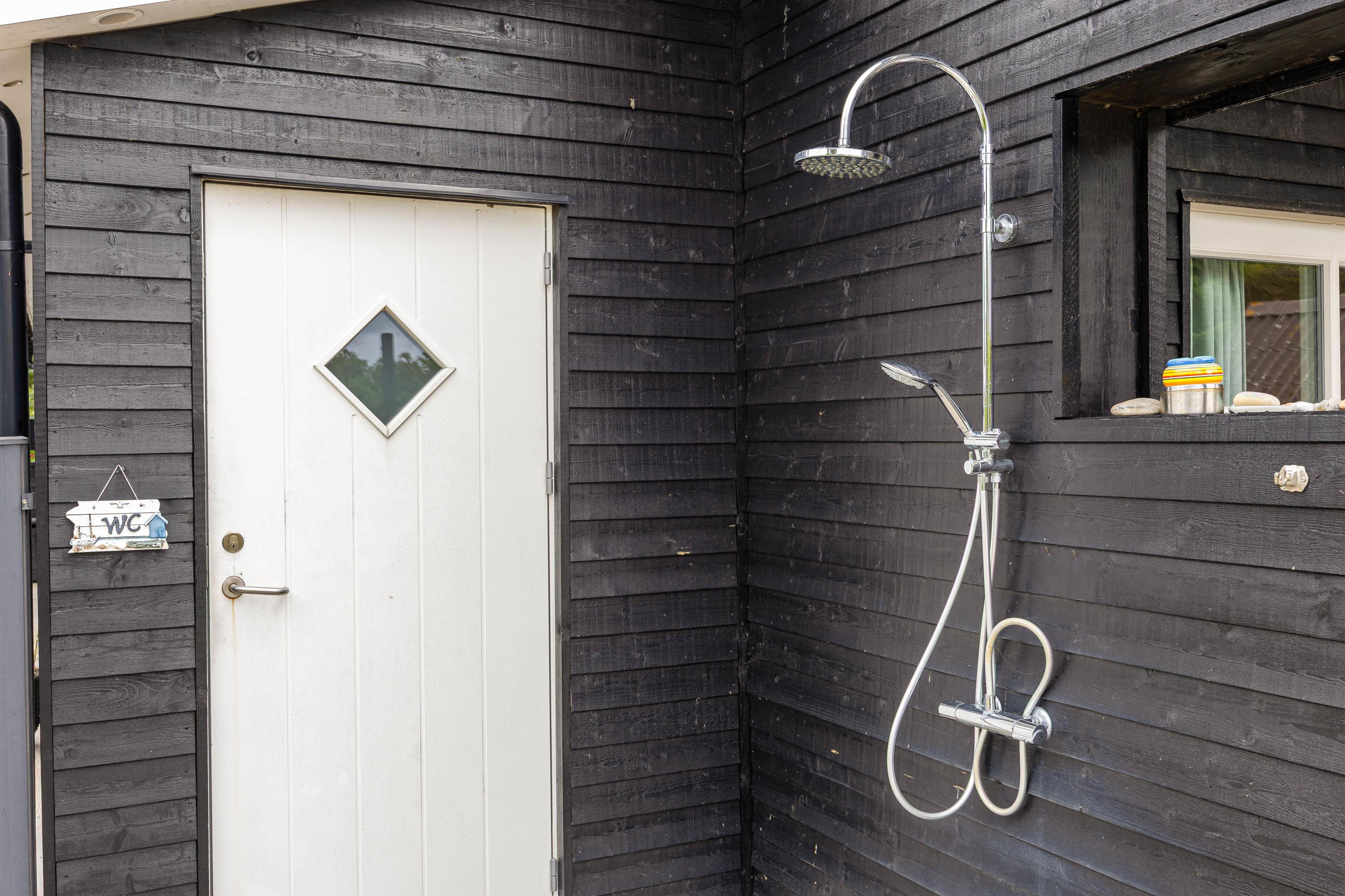 Sommerhusets udendørsområde strækker sig over 1200 kvadratmeter græsplæne. Et legetårn, en shelter, mål og en beachvolleybane giver masser af udendørs underholdning og mulighed for sjove aktiviteter. Slap af på den delvist overdækkede terrasse med komfortable havemøbler samt liggestole og lav lækre grillmåltider på gasgrillen, imens skyggerne bliver lange.