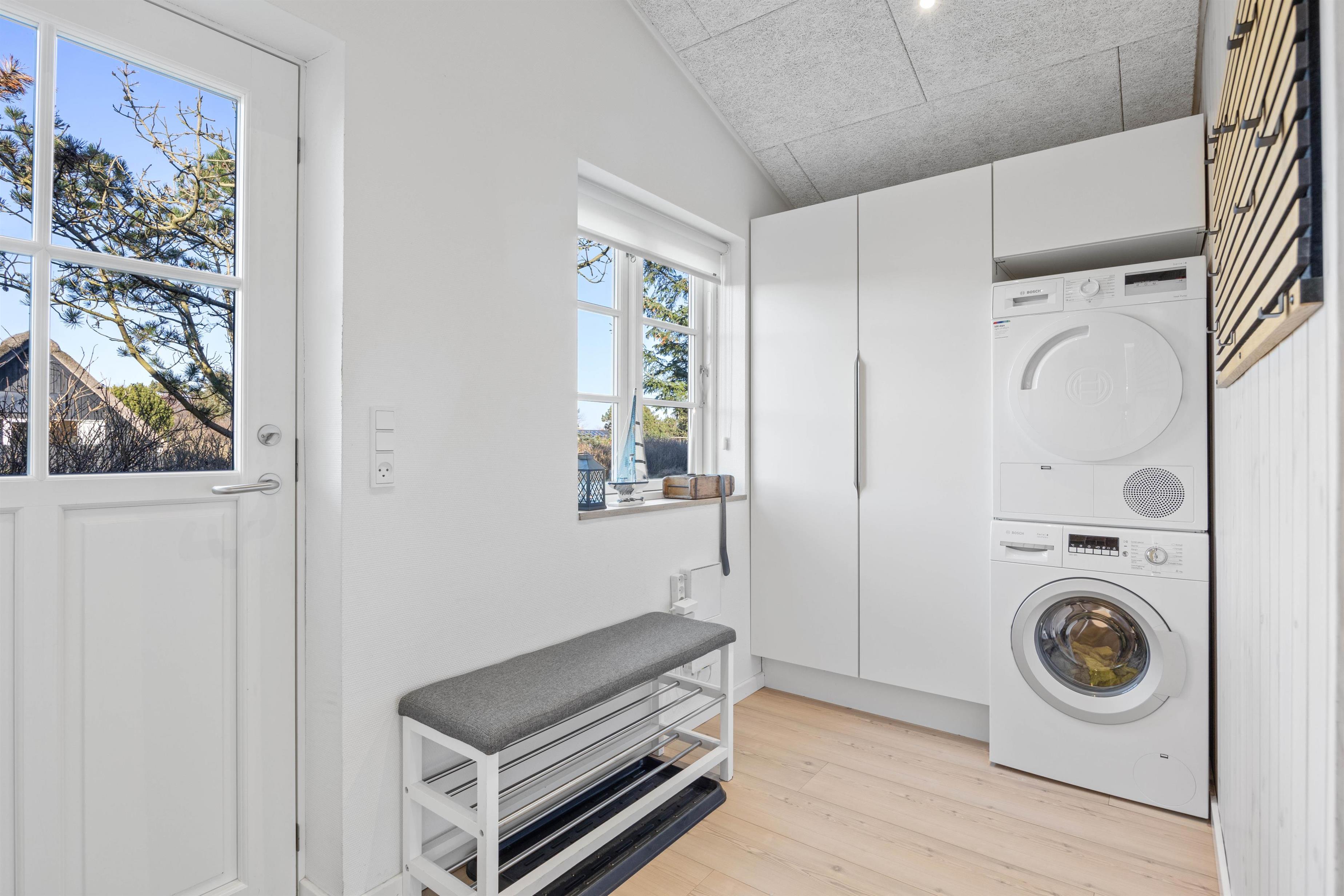 Det moderne, åbne køkken har alt, hvad I behøver for at forkæle hinanden med lækre, hjemmelavede måltider, herunder opvaskemaskine, mikroovn, køle-fryseskab og induktionskogeplade. Her er det sjovt at lave mad sammen. Det moderne badeværelse og det pæne gæstetoilet, begge med gulvvarme, bidrager til komforten. Sommerhusets sauna er et godt sted at slappe af efter en lang gåtur på stranden.