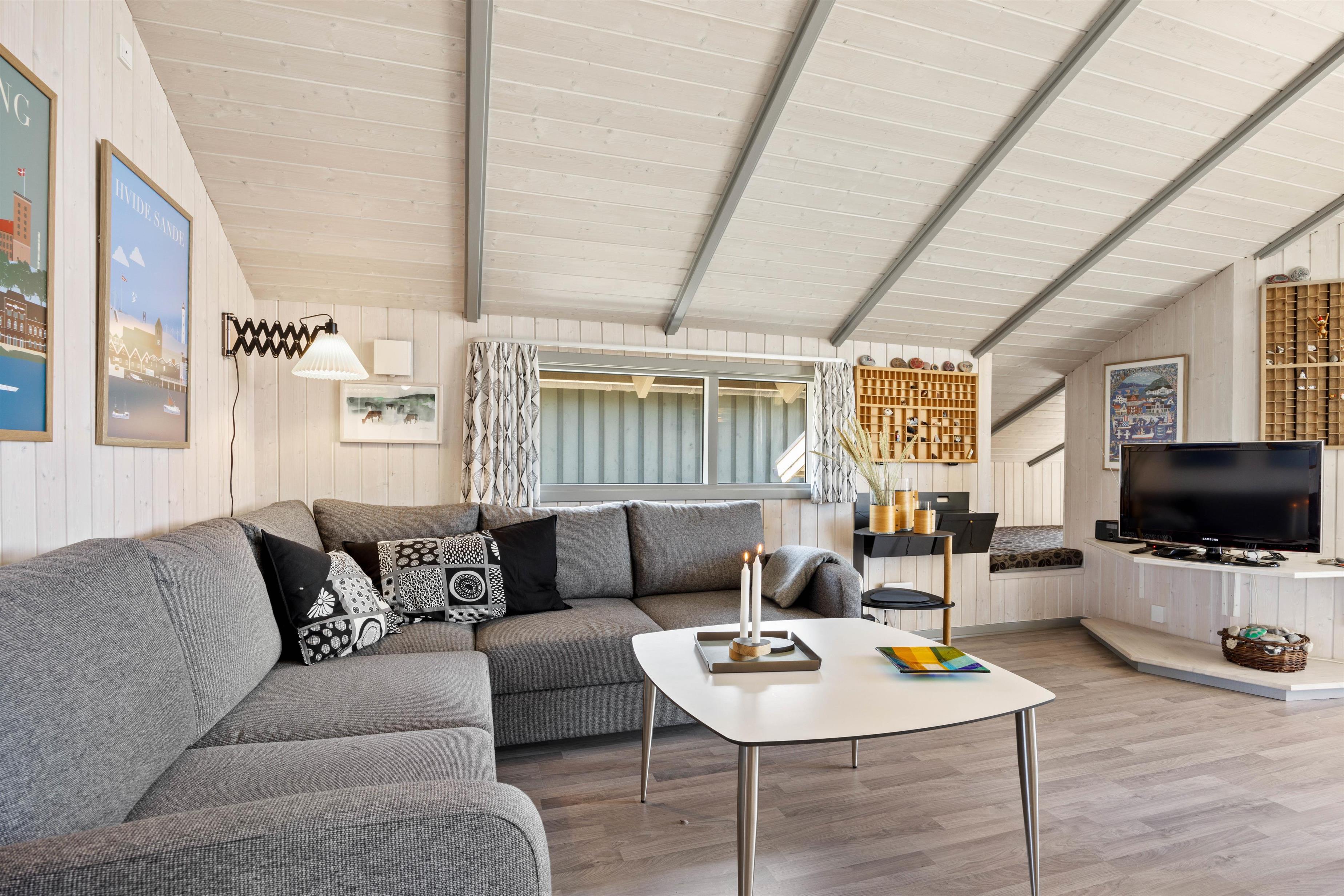 Den lyse træbeklædning, lysindfaldet og loft op i kip med synlige bjælker gør dette sommerhus lyst og venligt. Den hyggelige stue er indrettet med hjørnesofa og brændeovn, så her kan I samles om indendørslivet. Gæt en quiz, lav en spilleaften eller nyd roen og en snak ved varmen fra brændeovnen. Der er en hyggelig alkove i forbindelse med stuen, hvor børnene kan lege eller slappe af. Det tilstødende køkken er udstyret med opvaskemaskine, mikrobølgeovn, induktionskomfur og køle-fryseskab. Her finder du alt, hvad du behøver for at fremtrylle lækre måltider.