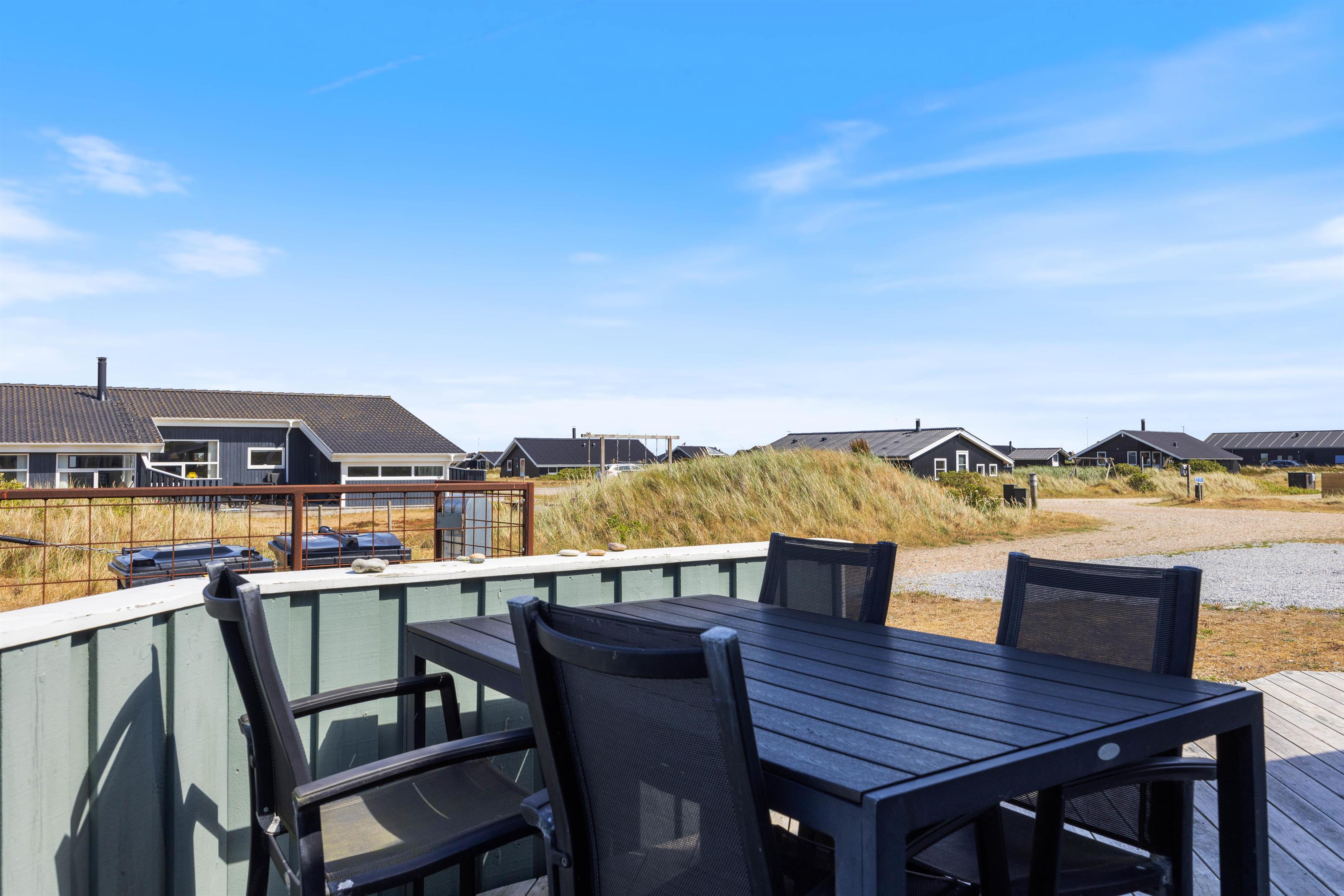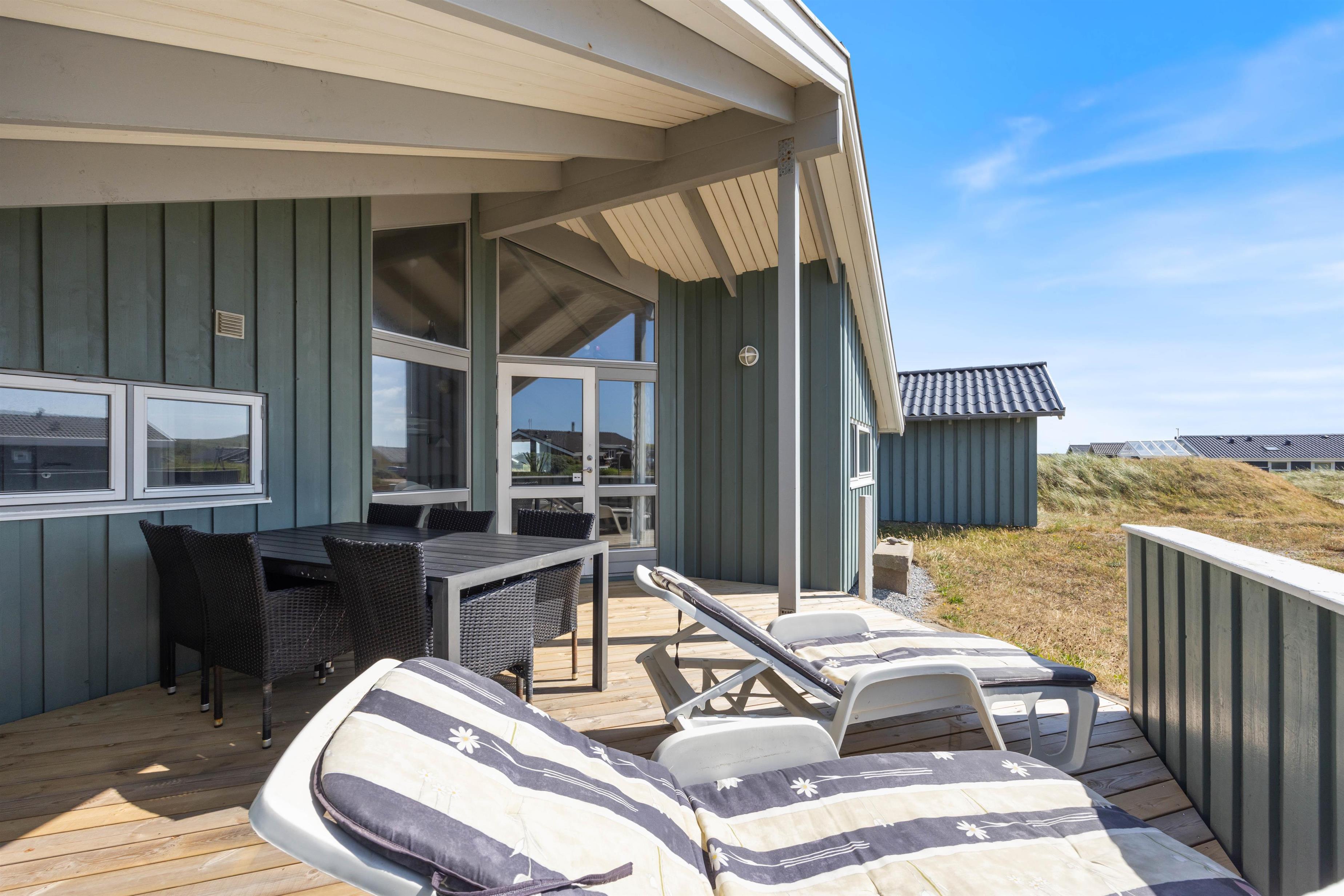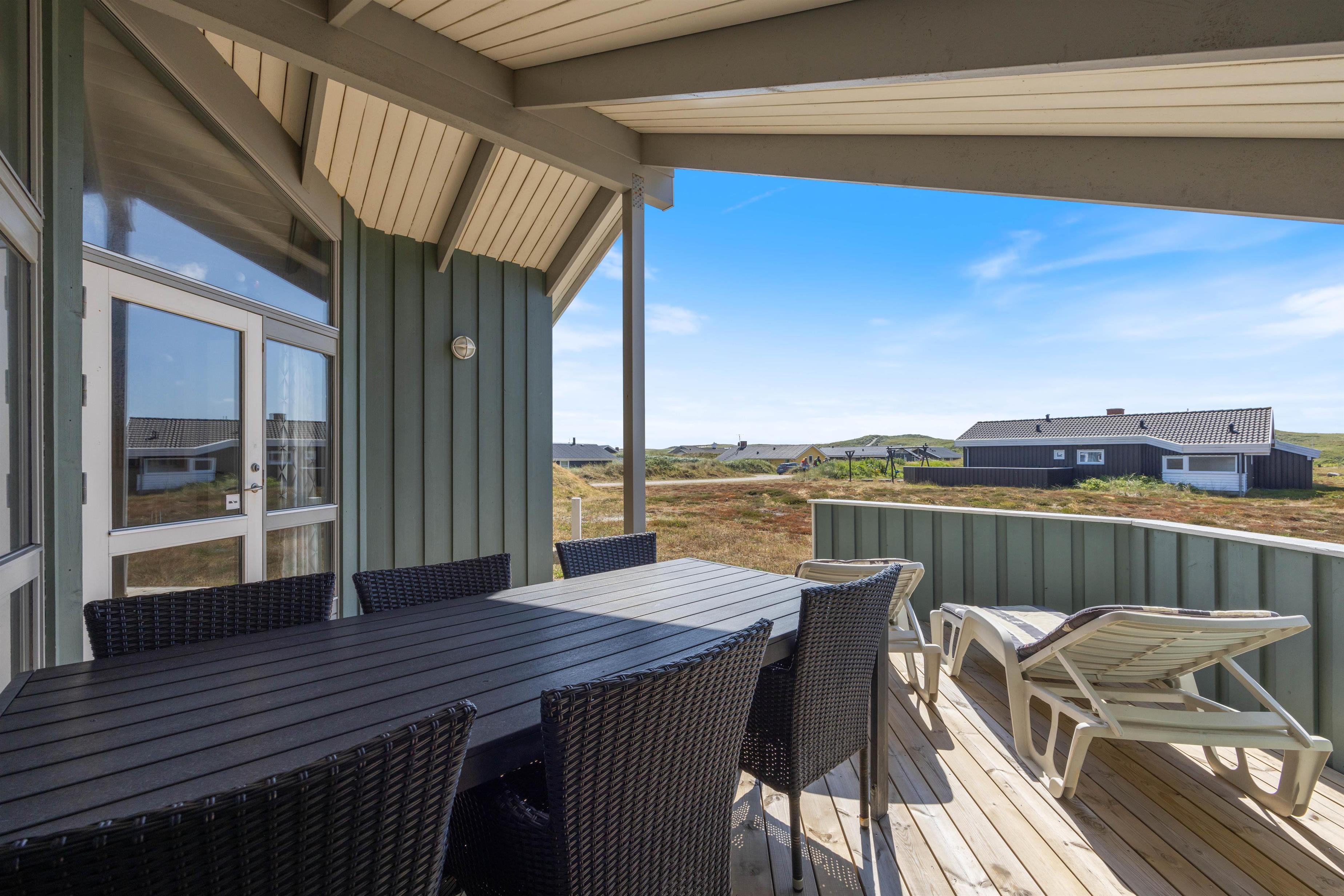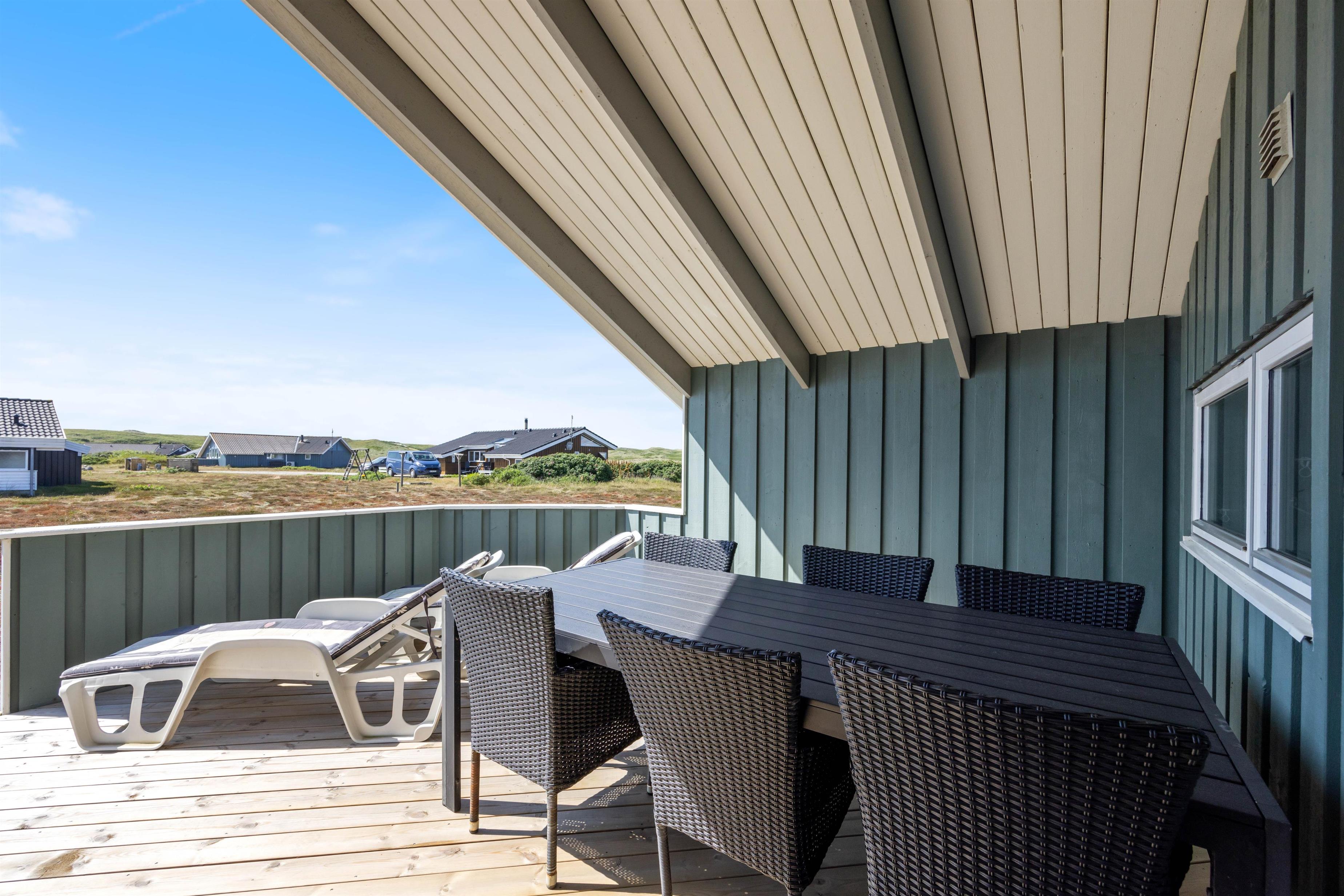 Det hyggelige feriehus omgives af 2 terrasser. Den ene er åben med praktisk afskærmning. Den anden er delvis lukket og delvist overdækket. Her kan I opholde jer i både sol, blæst og regn. Du kan finde en plads til børn eller hund, og du kan slappe af i havemøblerne, imens børnene gynger. Der er gasgrill til en lækker BBQ, og du kan trygt parkere din bil i carporten. Feriehuset ligger naturskønt, og du kan være heldig at se nogle af vestkystens vilde dyr, for eksempel rådyr, hare, ræv, hejrer og gæs.