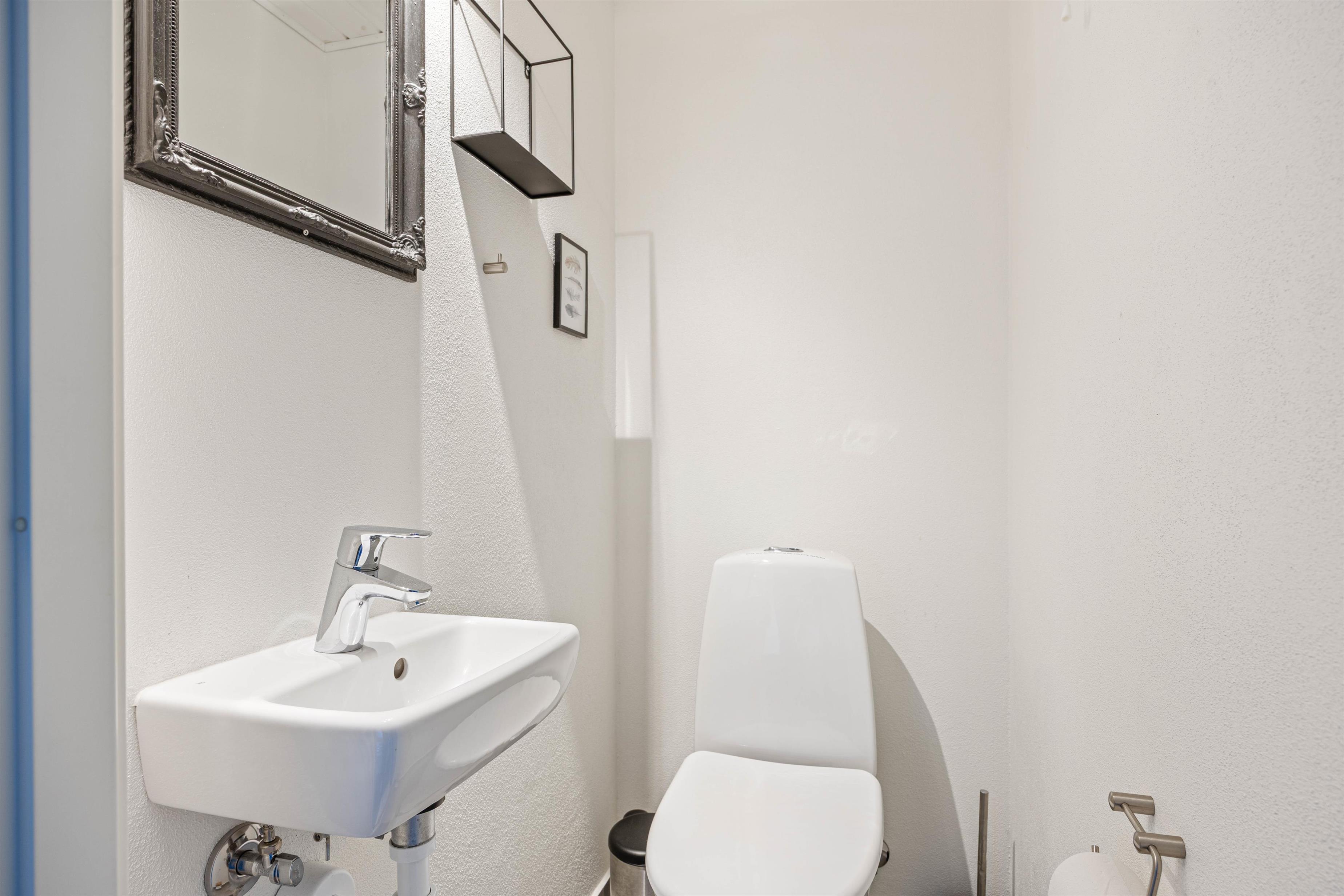 I sommerhuset er der et rummeligt badeværelse og også et gæstetoilet – begge med gulvvarme.