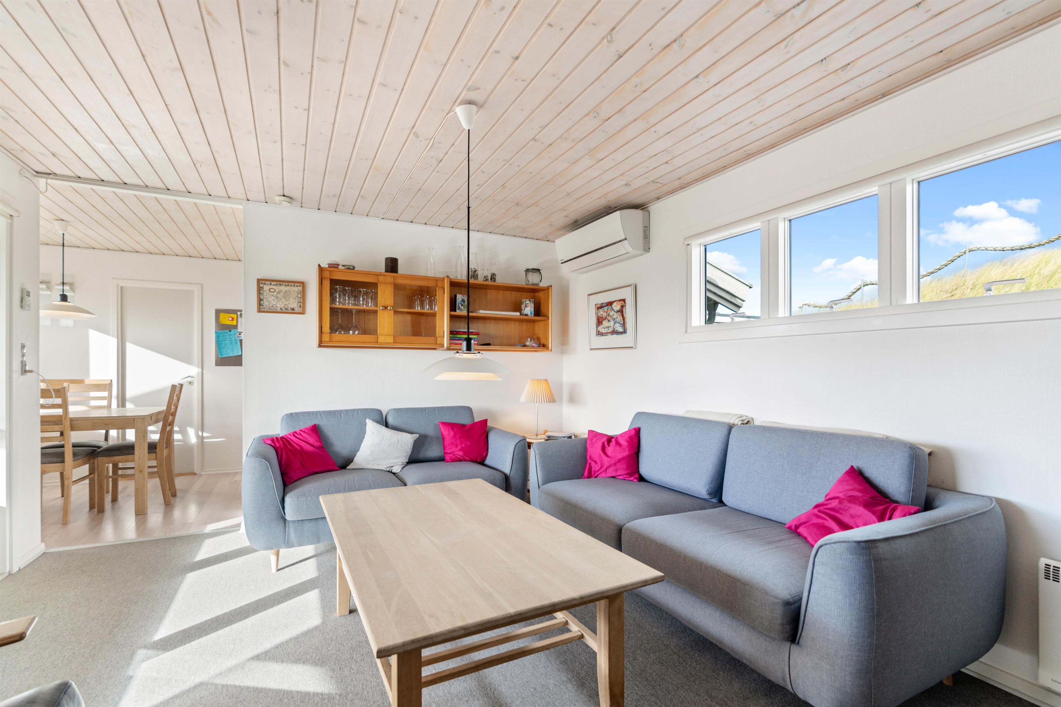På de solrige dage kan du sætte dig på terrassen med lidt koldt at drikke, mens børnene leger på den lille legeplads med sandkasse og gyngestativ, der er lavet lige ved siden af. Og på de køligere dage indbyder stuen med brændeovnen til afslapning og hygge med varm kakao, spil og en god film. Desuden er der en energibesparende varmepumpe i sommerhuset, som I med fordel kan benytte jer af til at holde en behagelig temperatur.