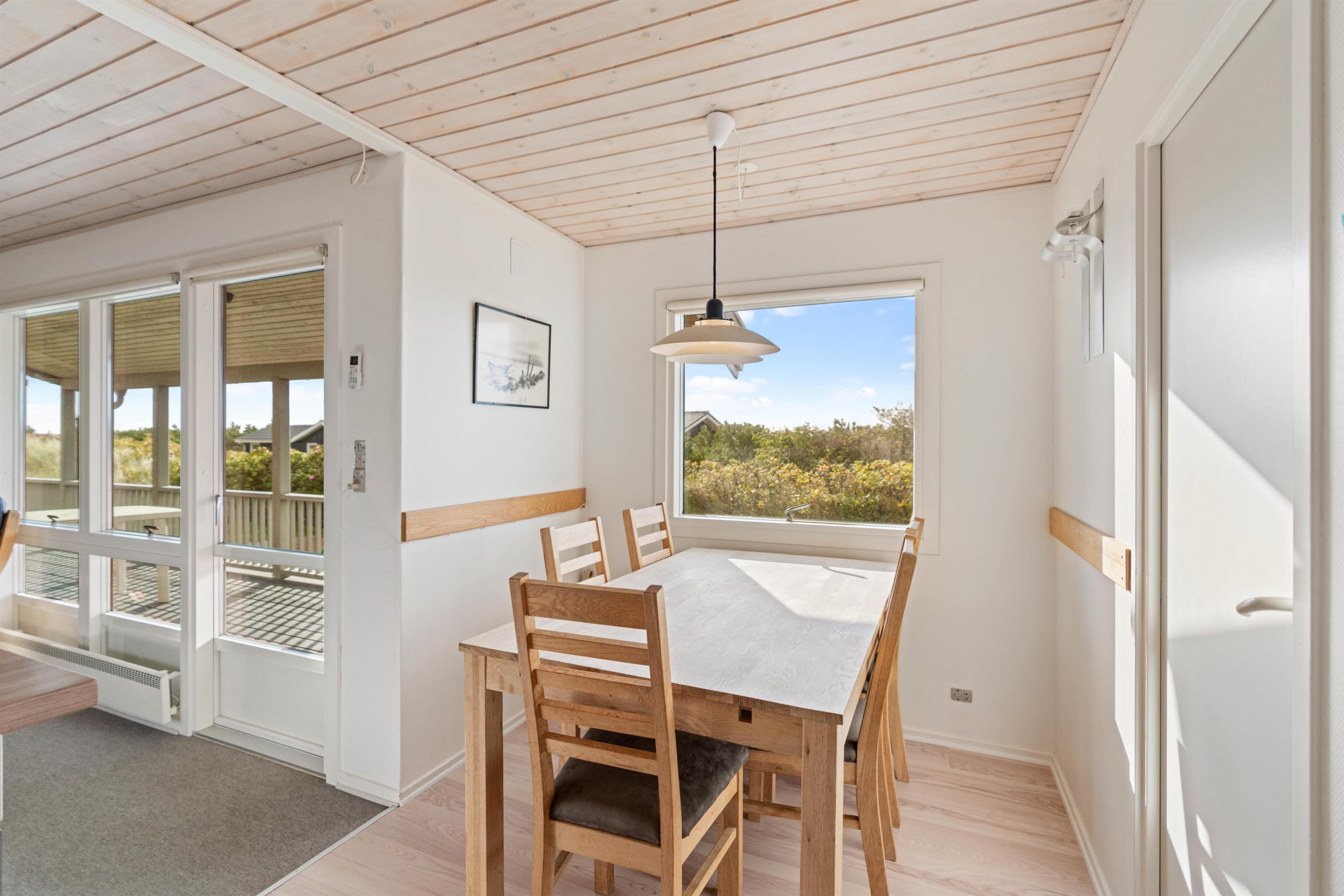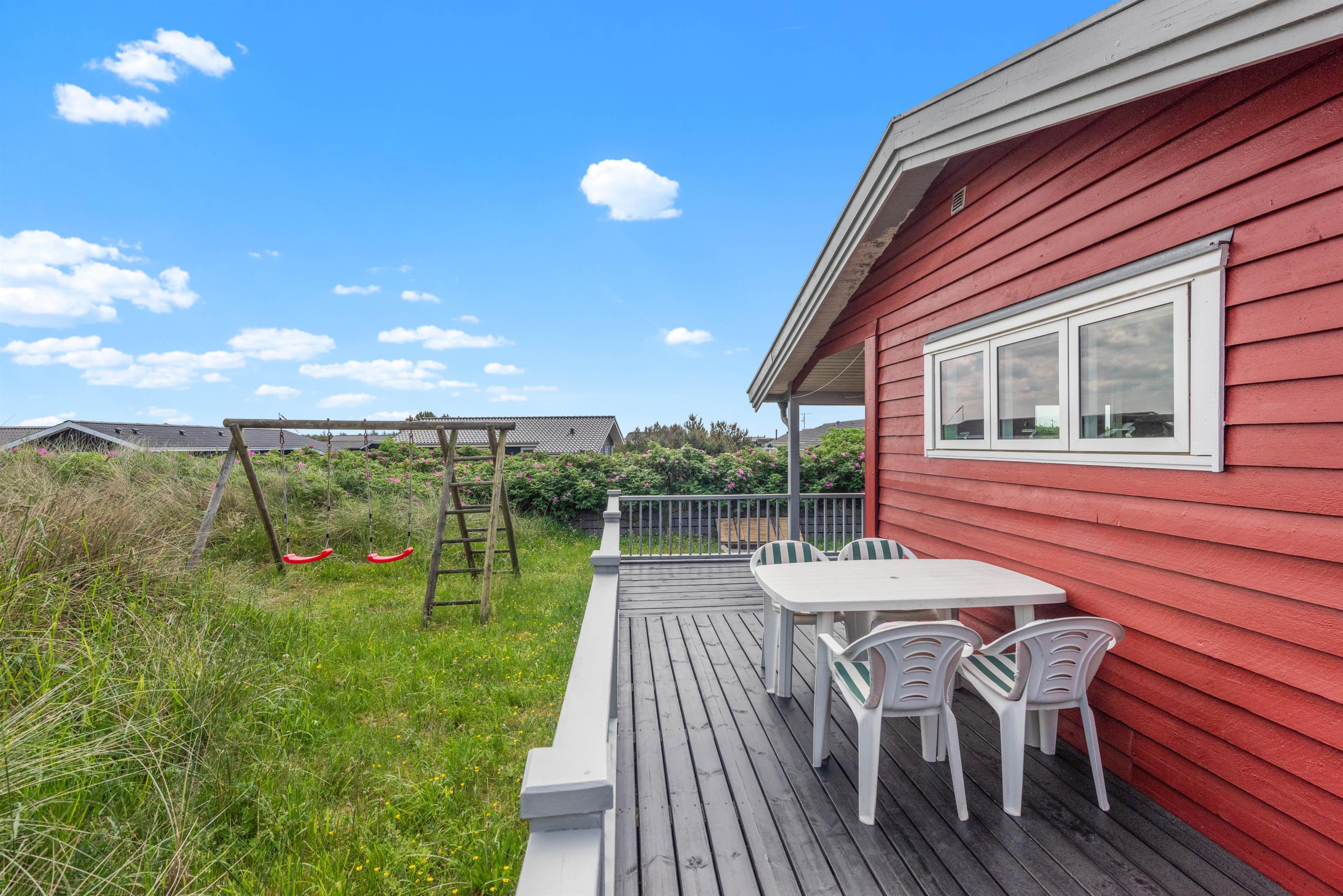 På Julianevej i Bjerregård ligger dette hyggelige feriehus, der oser af charme og feriehygge. Der er en stor afskærmet og delvist overdækket terrasse, så du kan sidde ude og nye den vestjyske natur. Samtidig kan du holde øje med de mindste, når de leger på den lille legeplads, der er opstillet ved siden af terrassen.