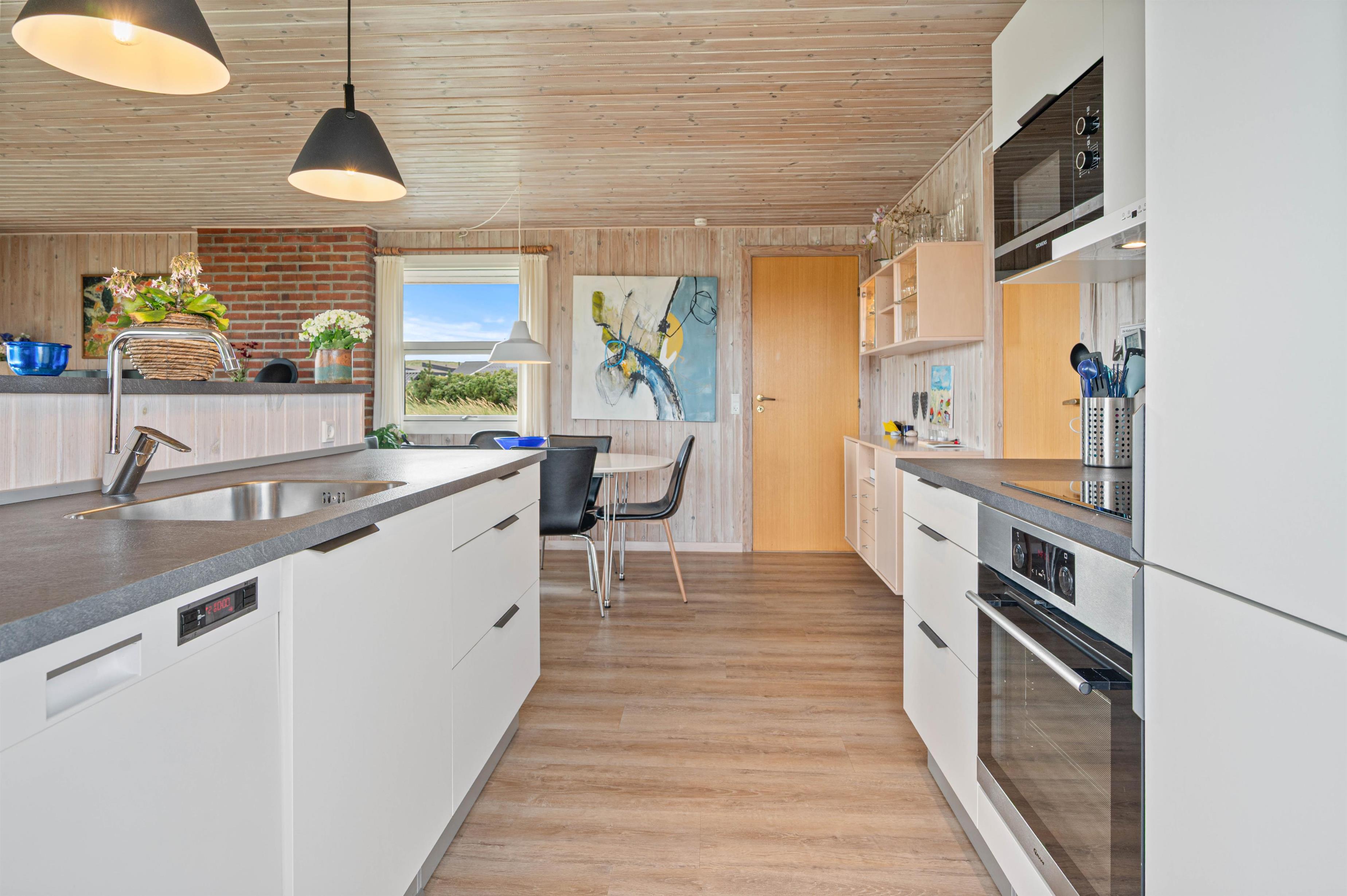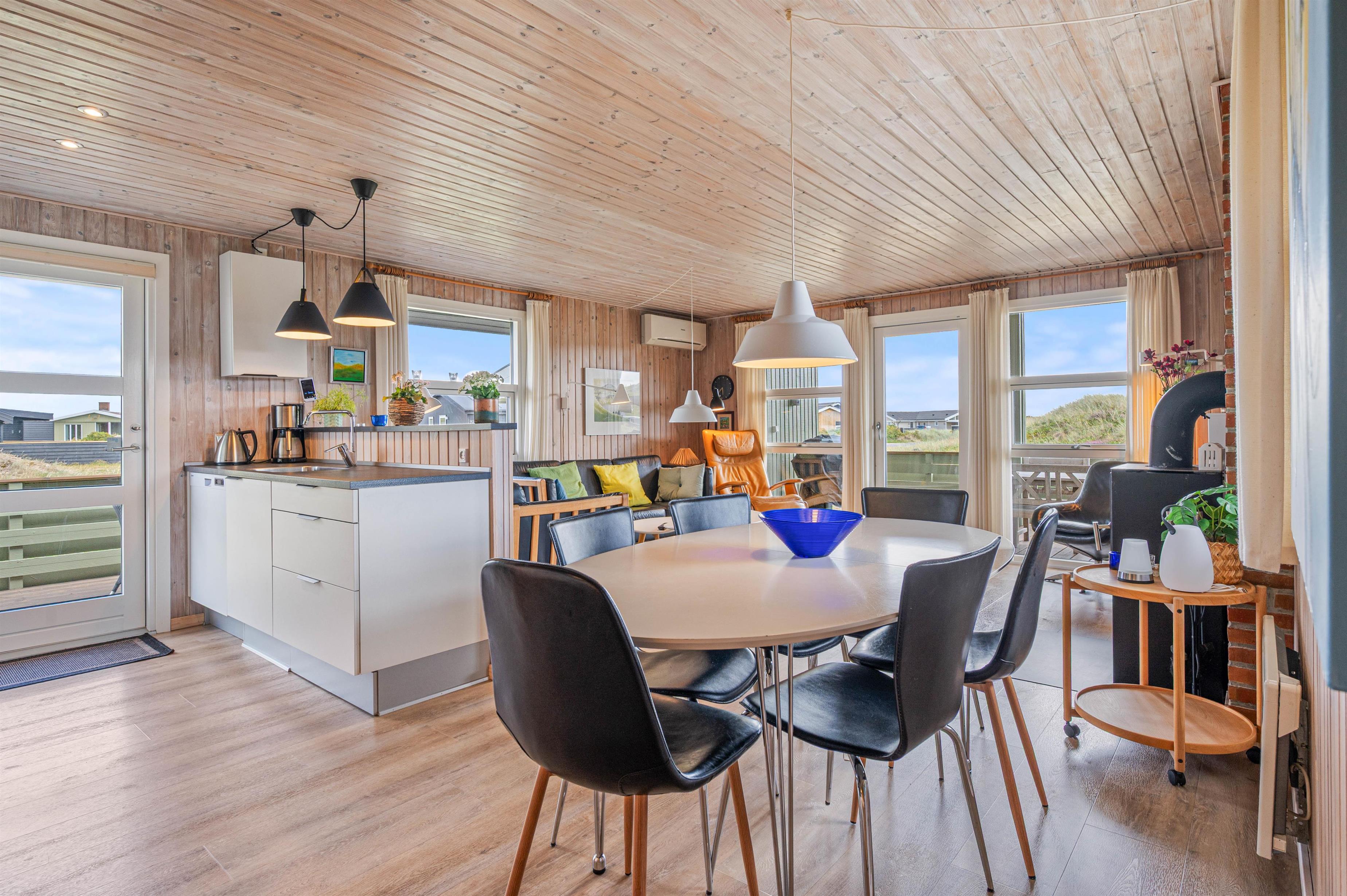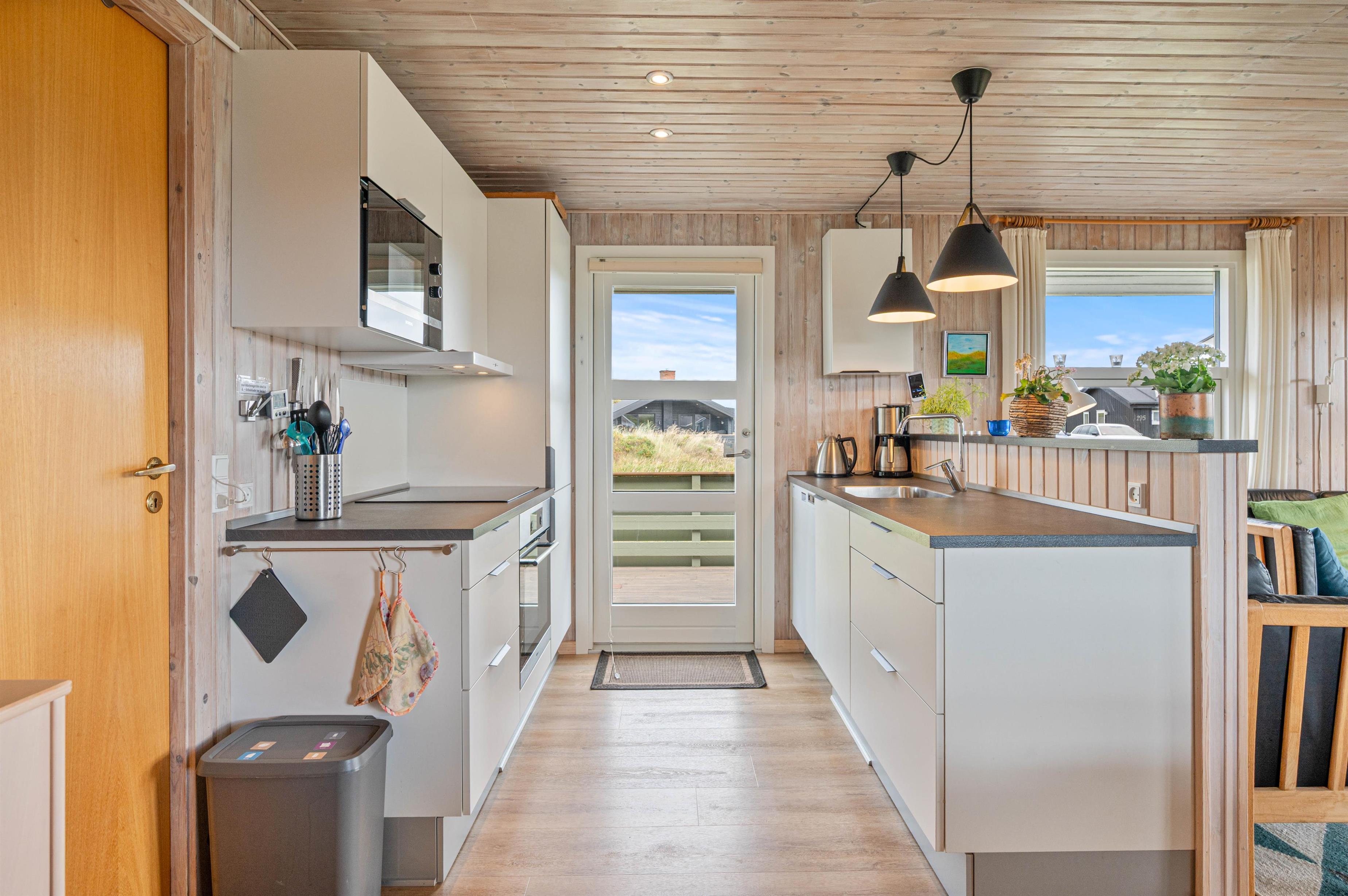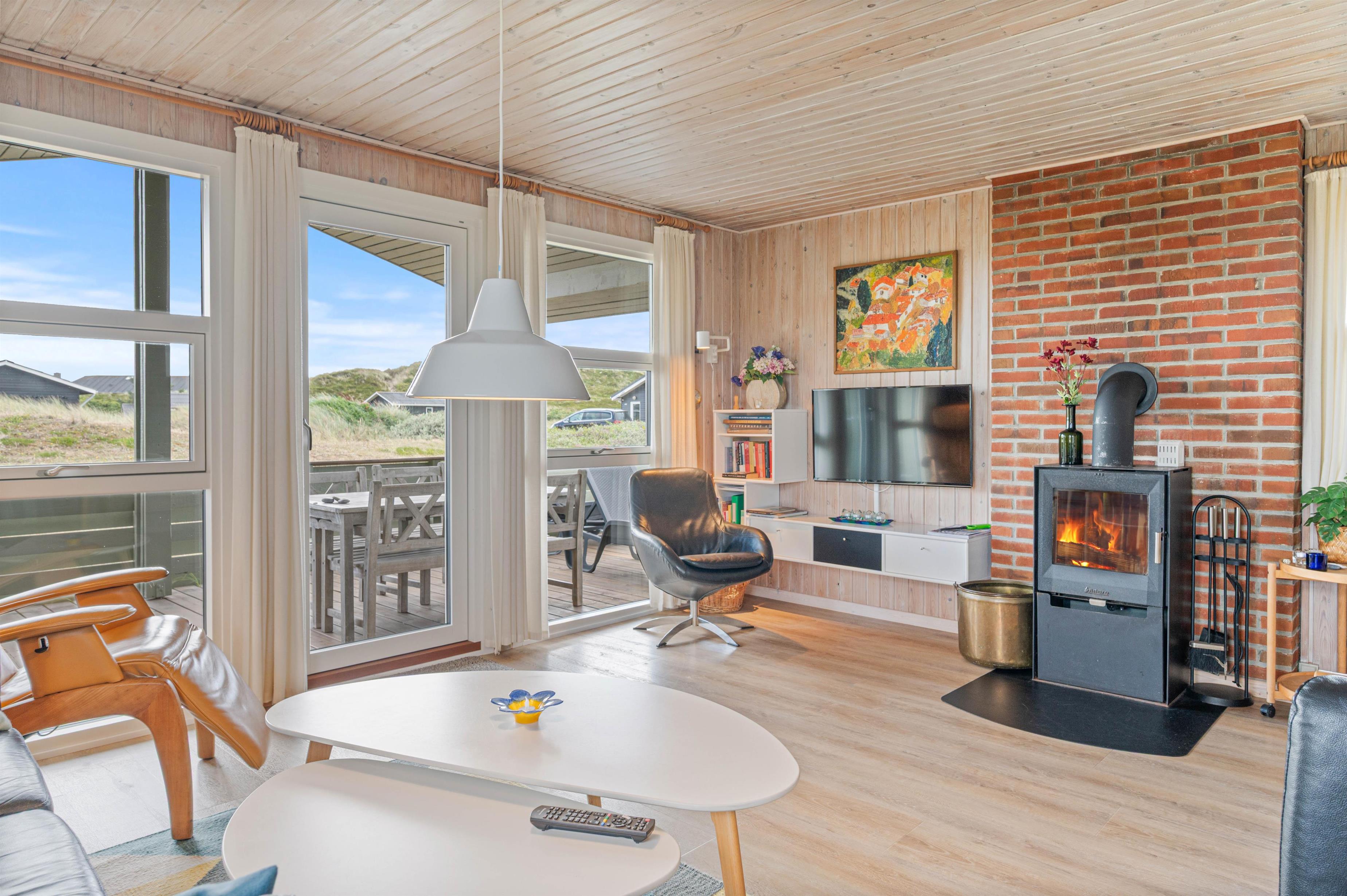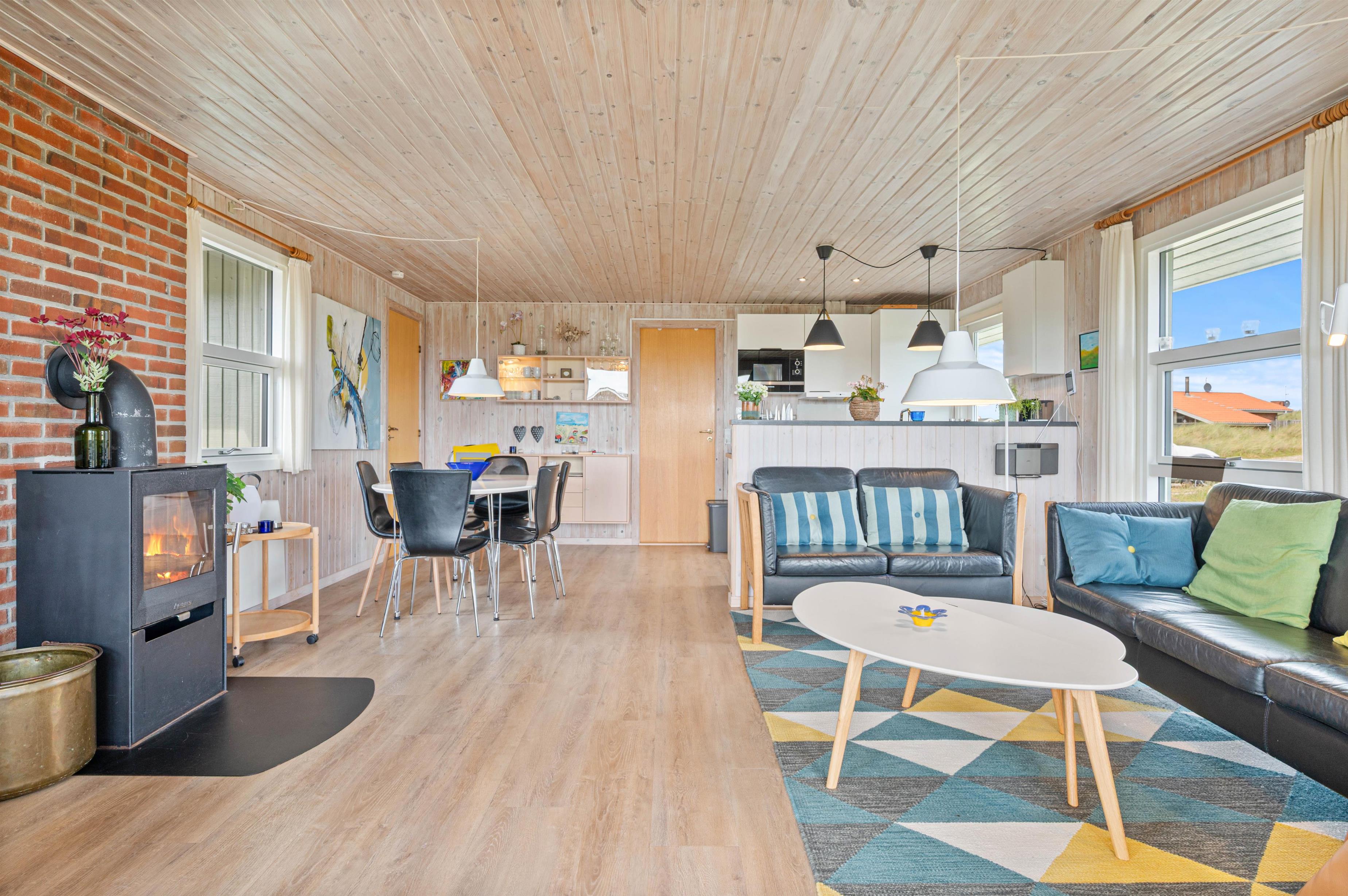 Det åbne køkken er udstyret med køleskab, lille fryser, mikrobølgeovn og opvaskemaskine. Den hyggelige stue med brændeovn er komfortabelt indrettet og opdelt i spiseplads og opholdsstue.