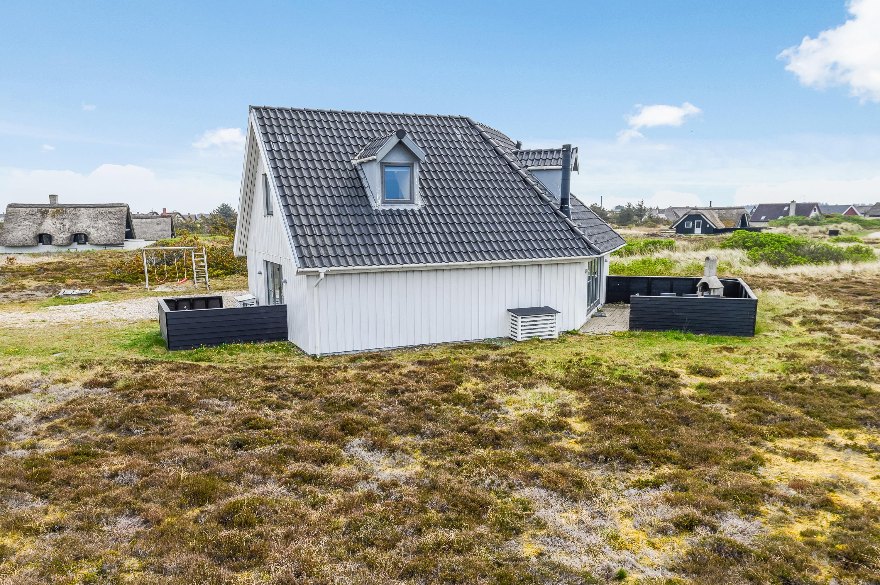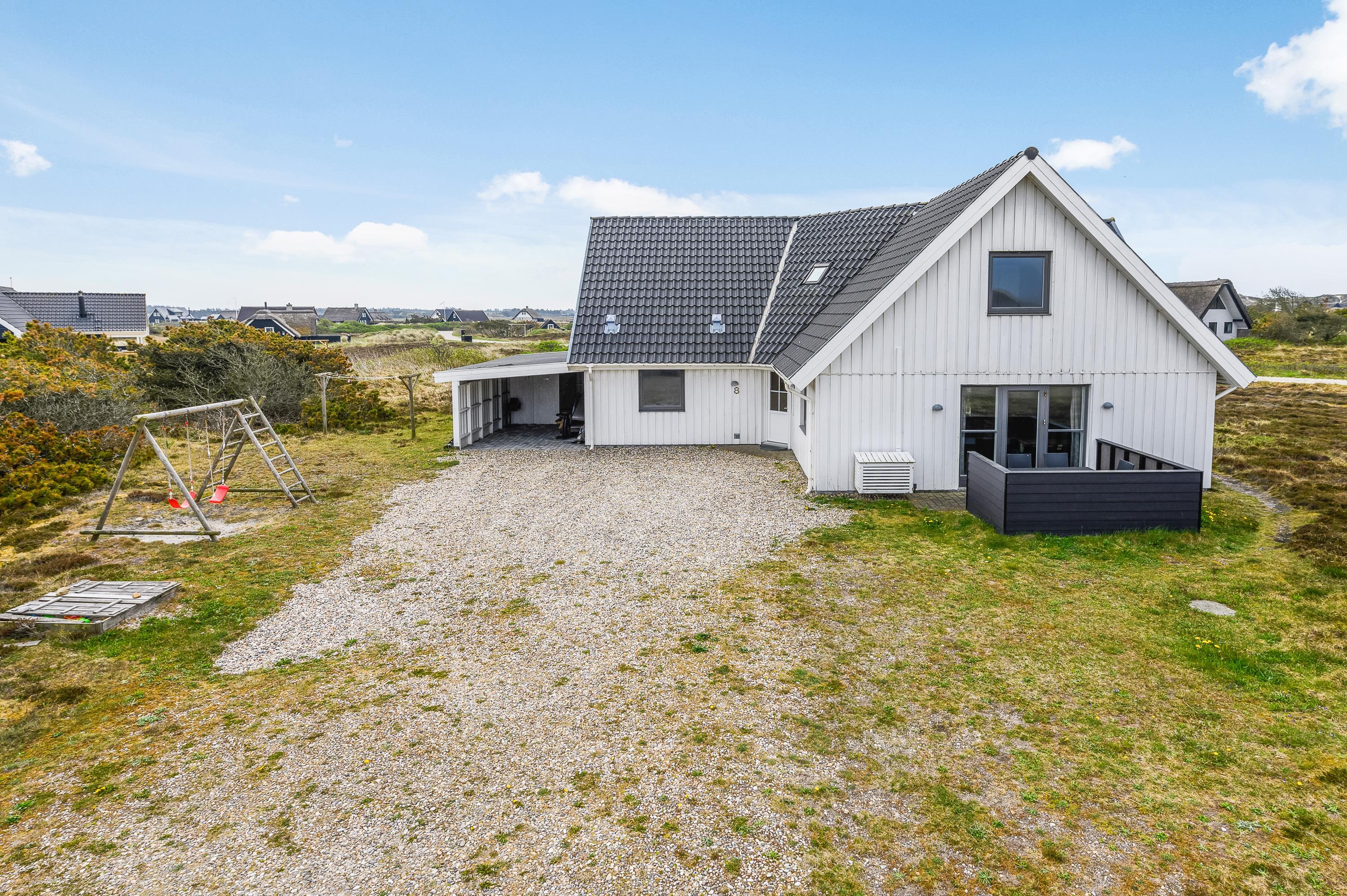 På Riskrogen 8 i Bjerregård byder dette 215 m2 store sommerhus velkommen til den store familie – eller 2-3 familier, der gerne vil holde ferie sammen. Med 5 soveværelser og 2 badeværelser er her plads til 10 personer. Sommerhuset ligger ugeneret ud til det åbne hedeområde, det er i 2 plan og har både spa og sauna.