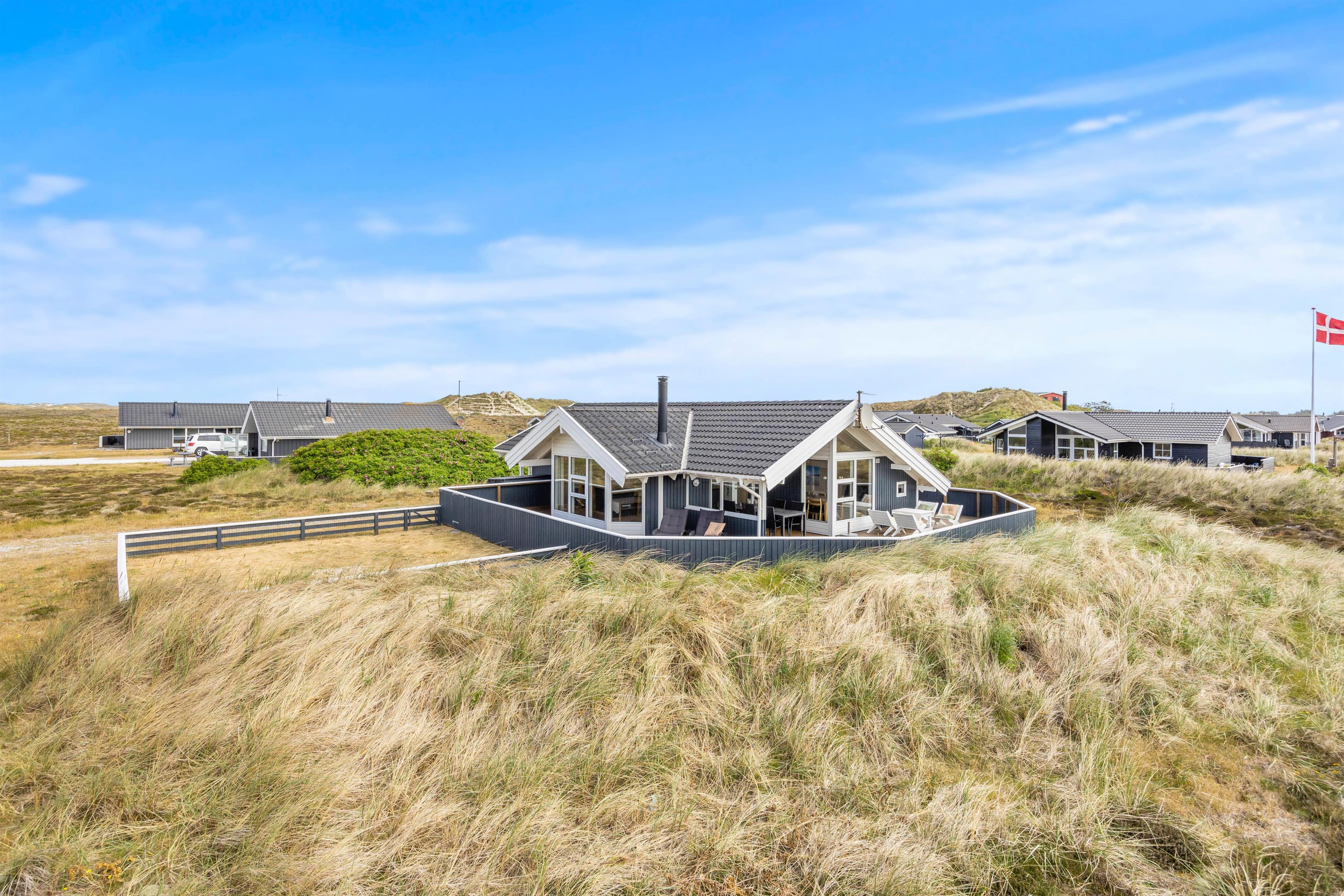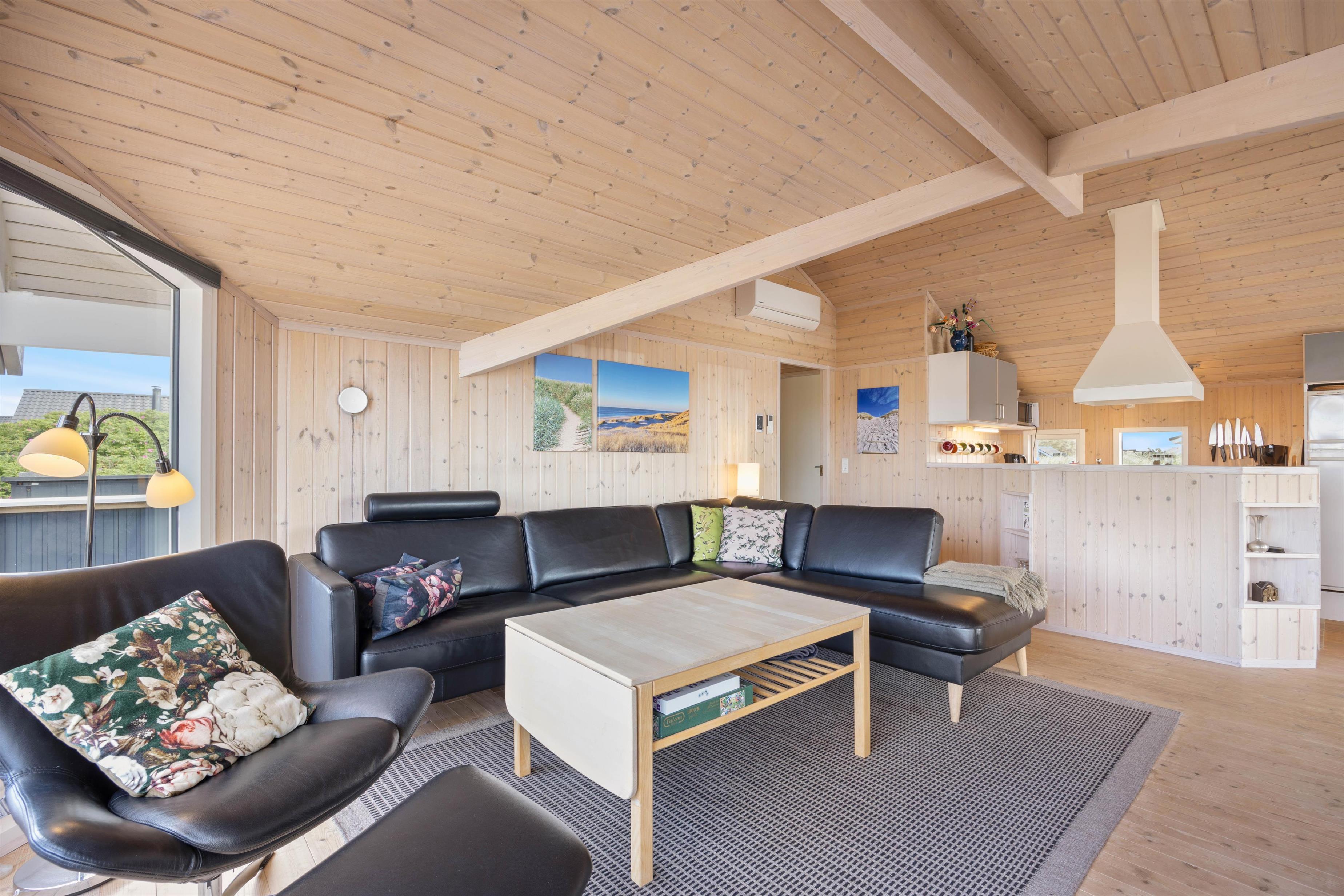 De store vinduer mod vest og syd bringer en masse godt lys i sommerhuset, og I fornemmer hele tiden klitlandskabet og roen – også på de køligere dage, hvor I kan vælge at hygge jer indendøre.