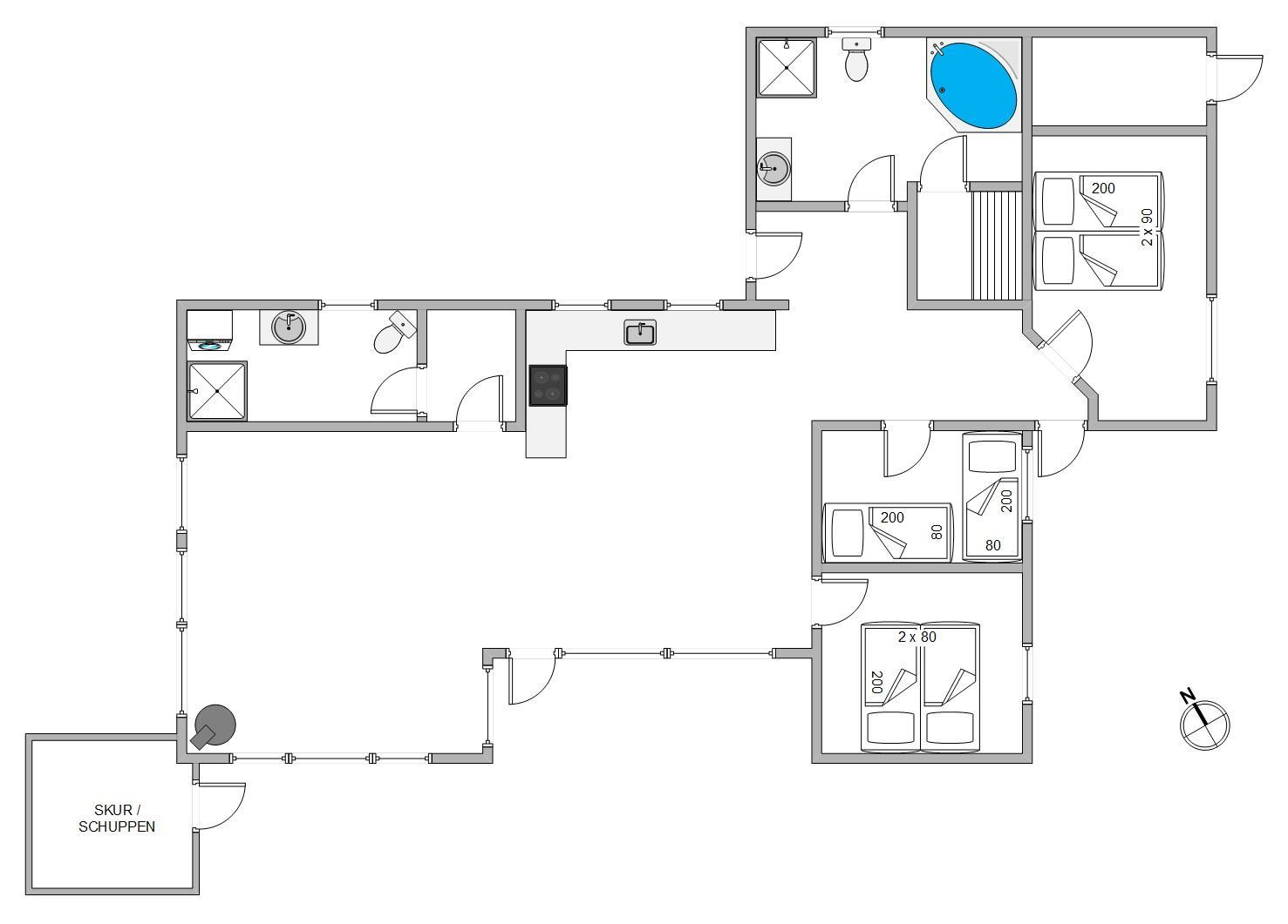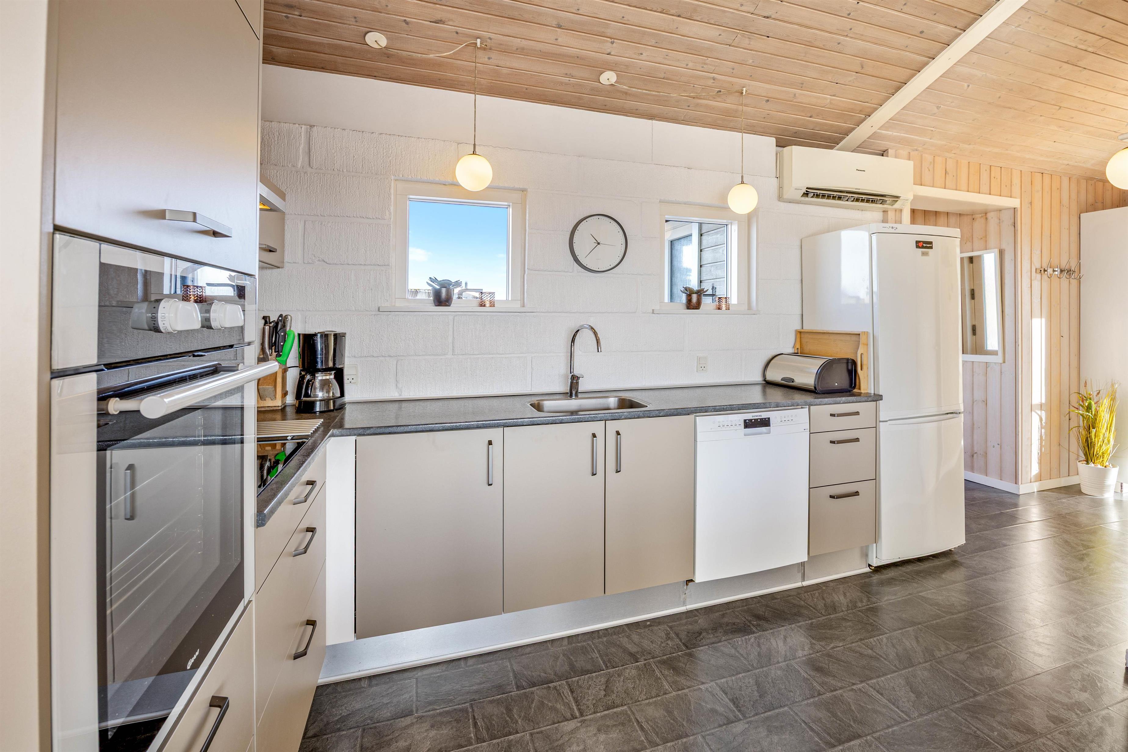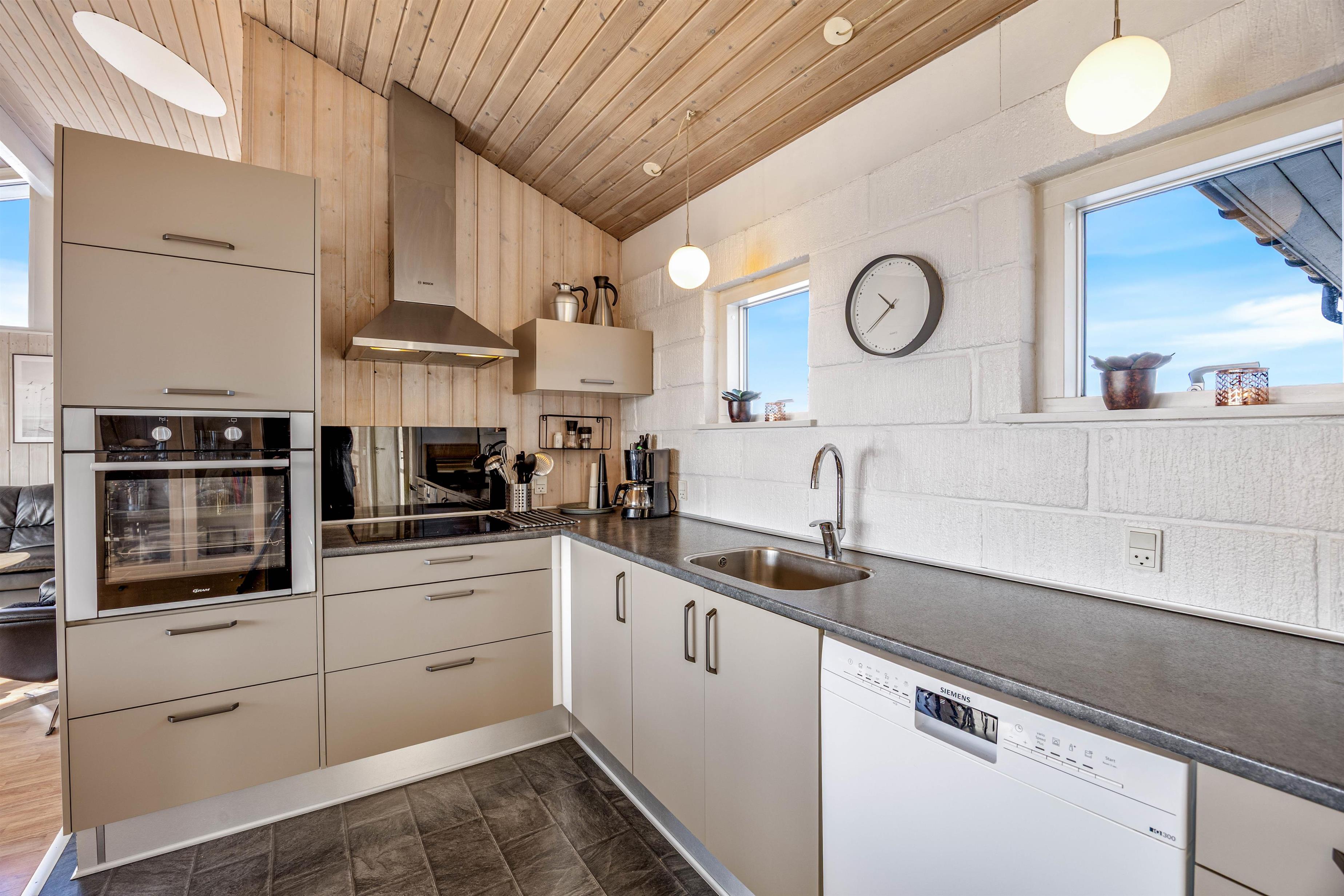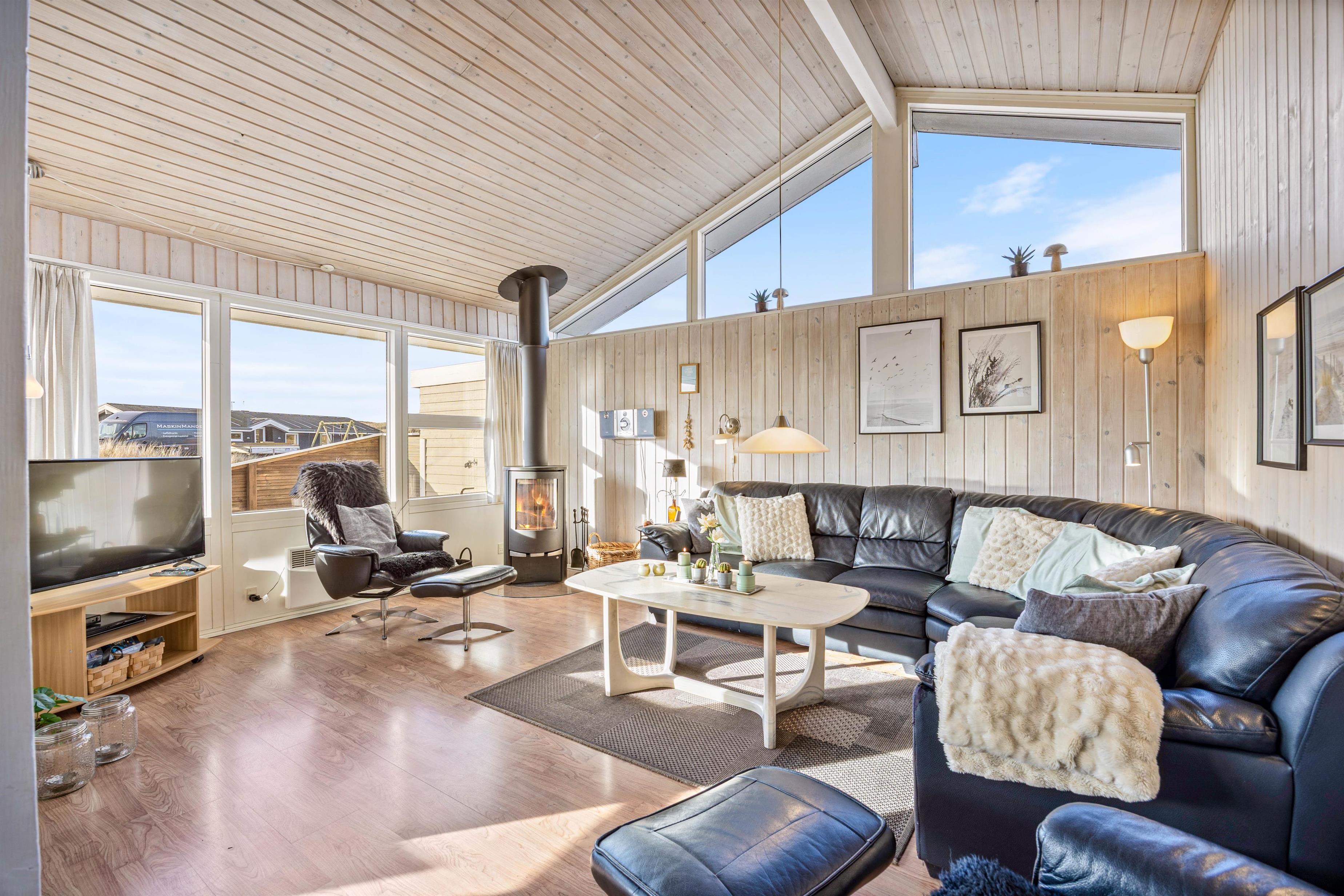 I dette feriehus er der ikke sparet på udstyret og indretningen, så her får I både et veludstyret køkken, stue med brændeovn og varmpepumpe, to badeværelser med gulvvarme samt sauna og spa – de ideelle forhold til en dejlig ferie. Og på den store naturgrund er der gynger og sandkasse til børnene samt en stor lukket terrasse.