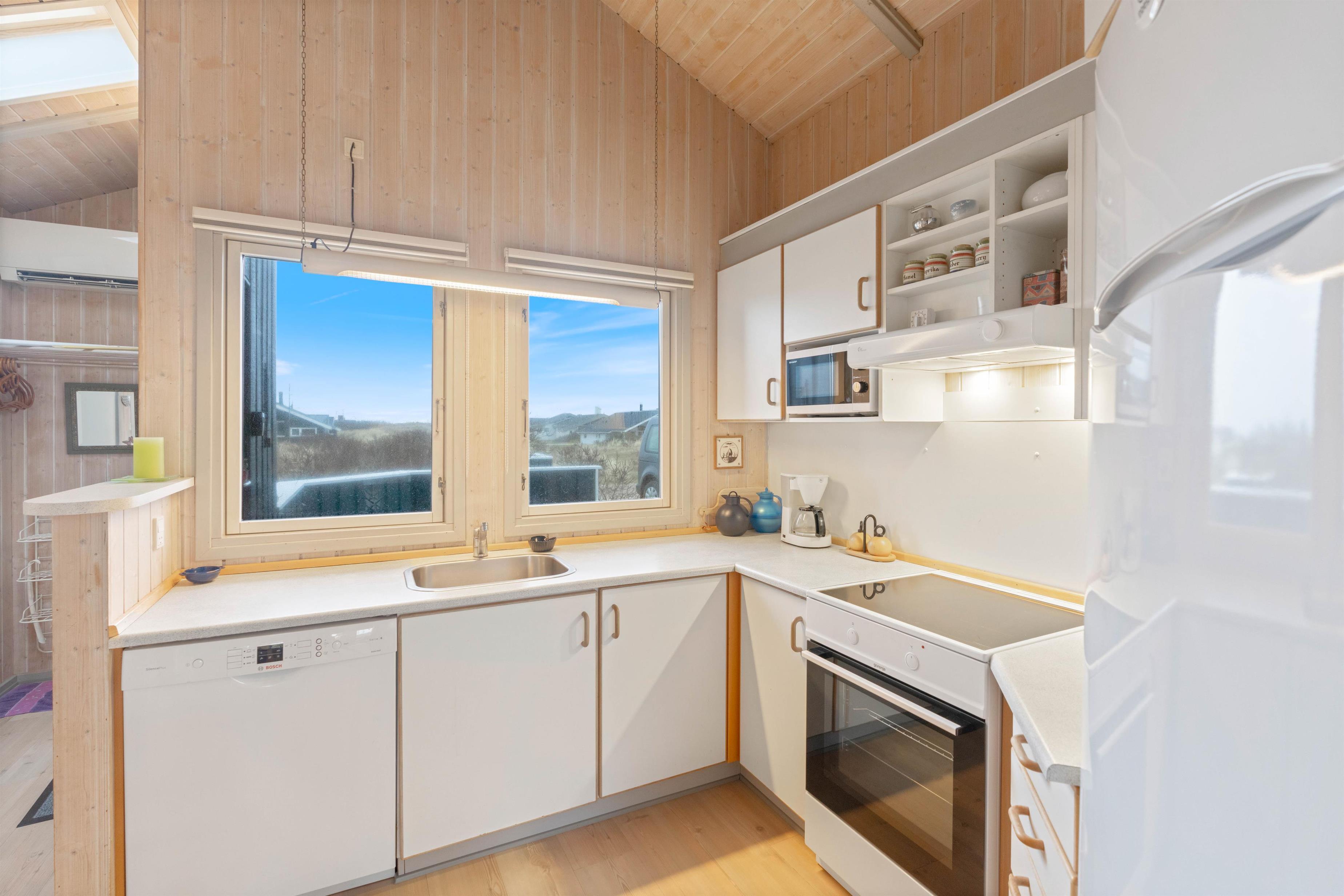 I opholdsstuen kan I tilbringe timevis foran brændeovnen. Der er også en energibesparende varmepumpe til opvarmning. I det praktisk indrettede køkken finder du alt, hvad du behøver for at fremtrylle en lækker menu. Udstyret omfatter opvaskemaskine, mikroovn og køleskab med en frysekapacitet på 40 l.