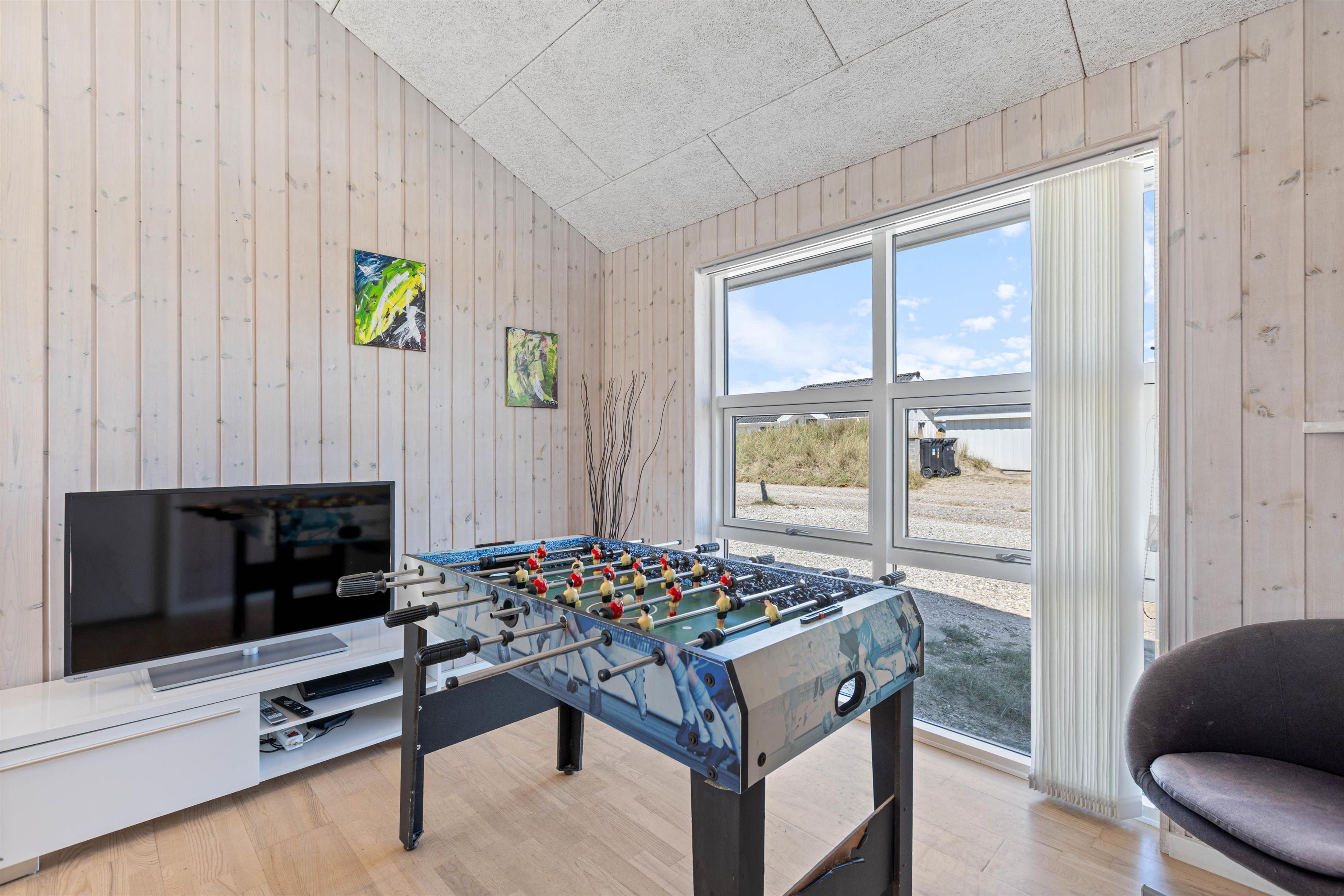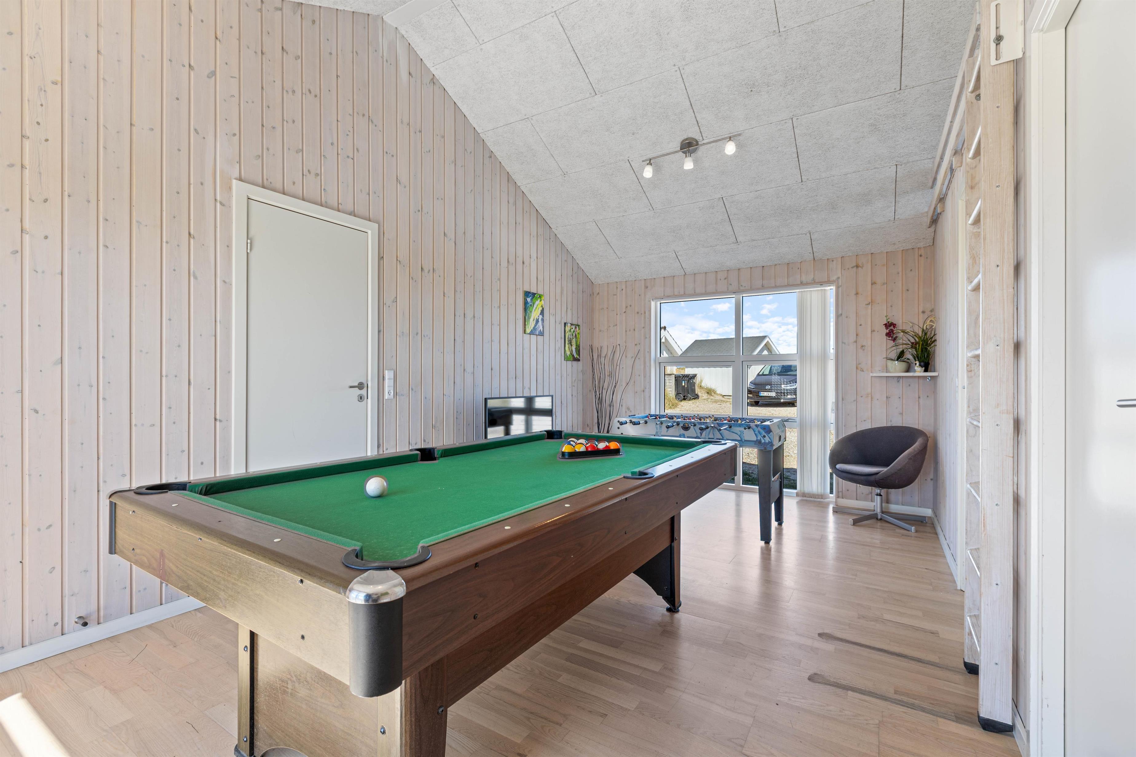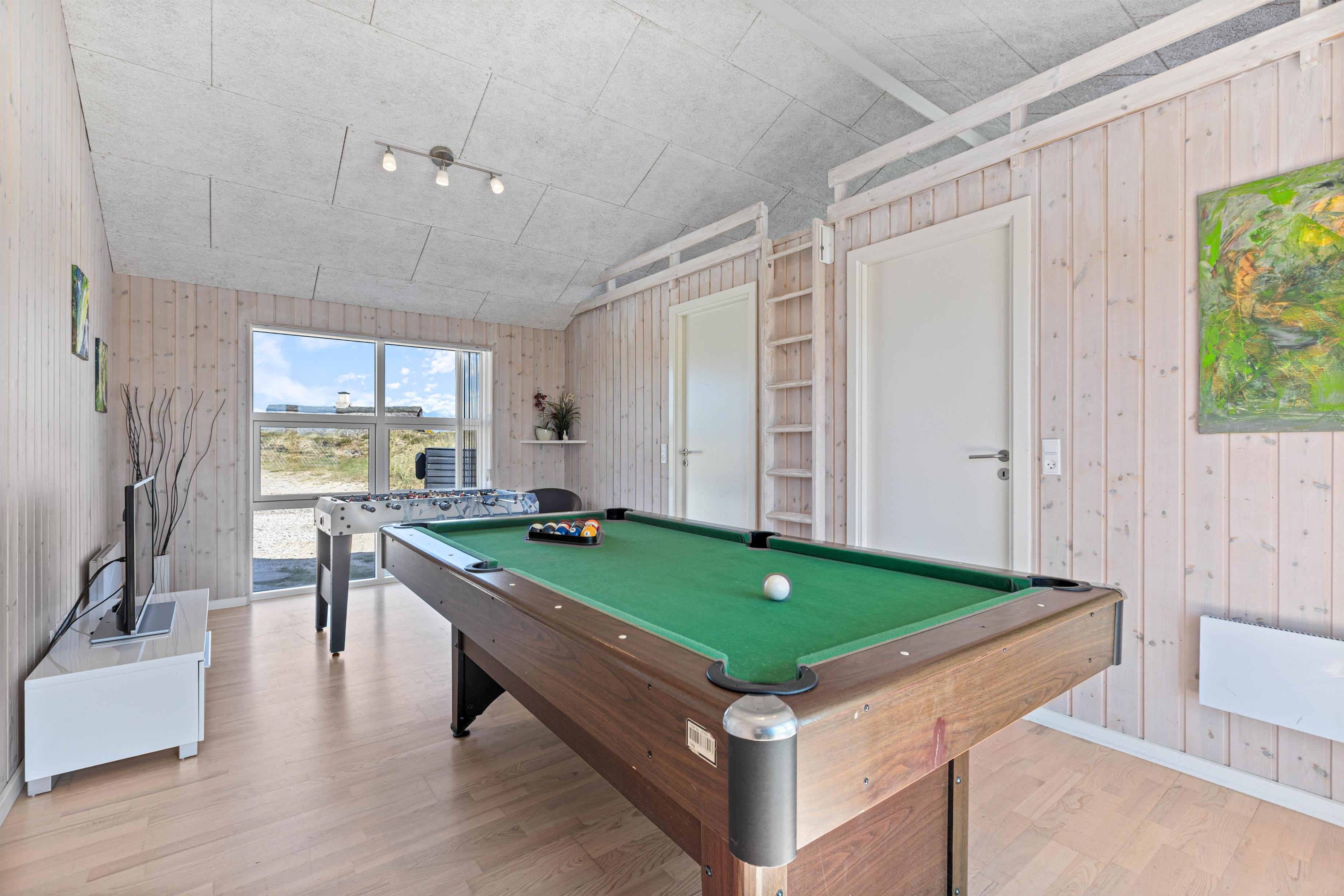 Der er sørget for underholdning for alle aldre i feriehjemmet. I det største af husets 2 badeværelser er der lagt op til afslappende wellnessoplevelser i sauna og spabad, og i aktivitetsrummet kan de konkurrenceglade familiemedlemmer give sig i kast med bordfodbold og billard.
