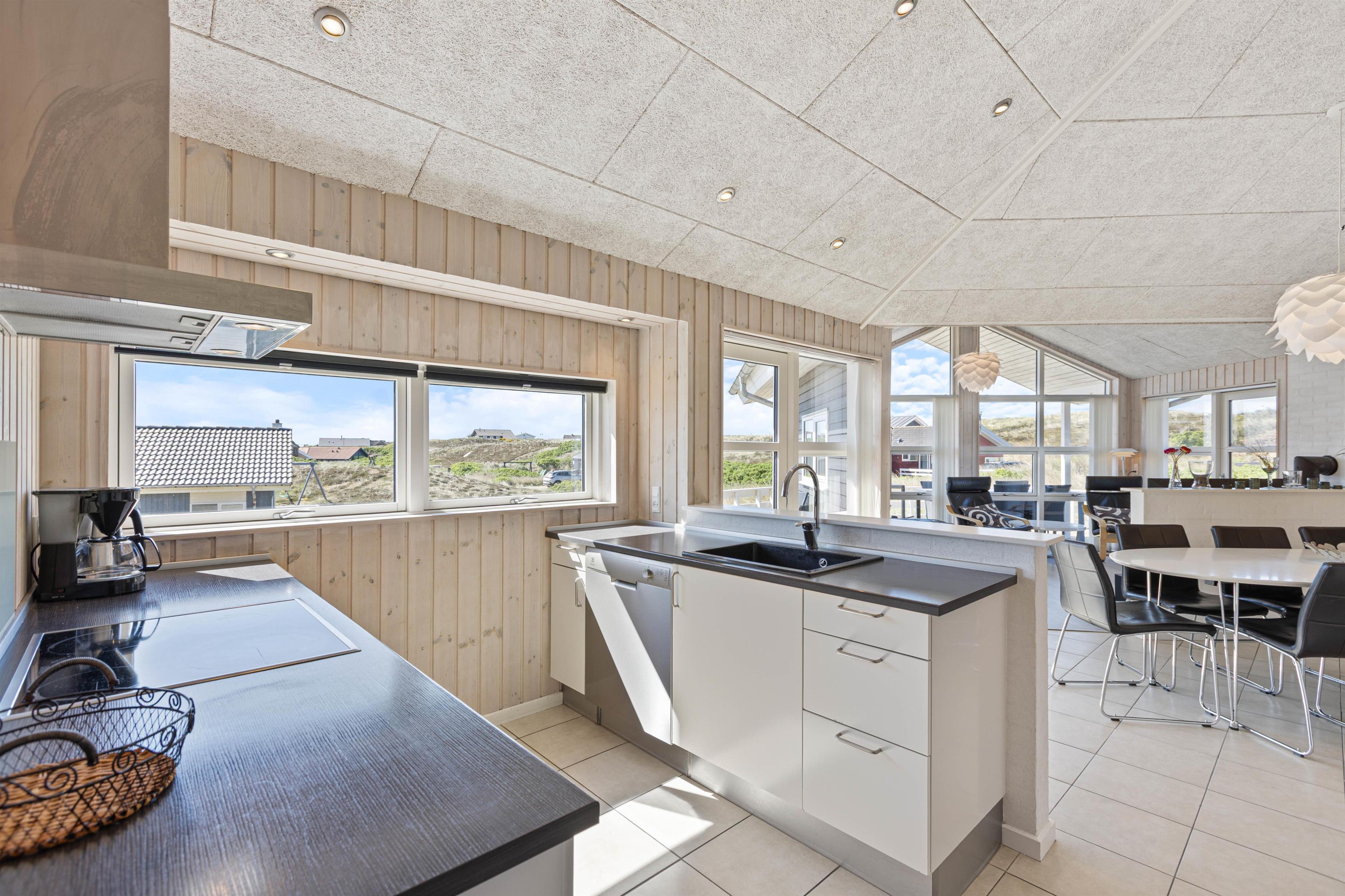Det skønne feriehus på Julianevej 43 byder på 120 velindrettede kvadratmeter; lyse farver er et gennemgående tema i hele huset, og de store vinduespartier i stue og køkken inviterer solens stråler og Bjerregårds smukke klitlandskab indenfor.