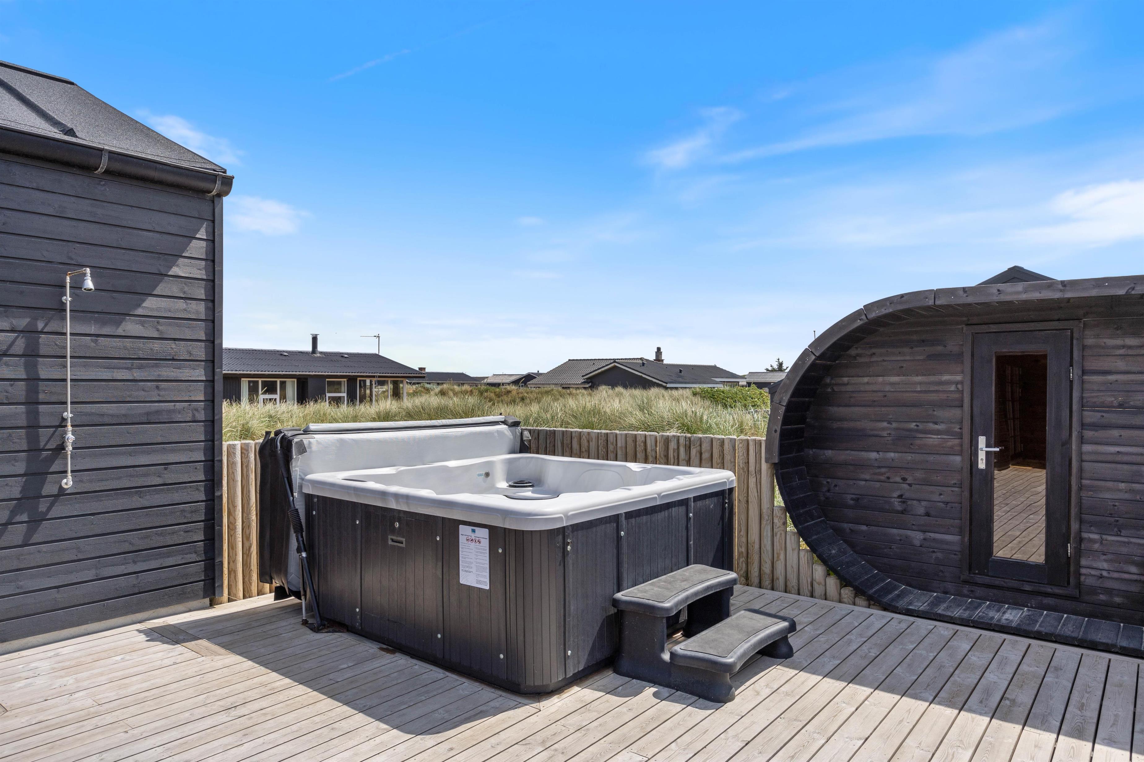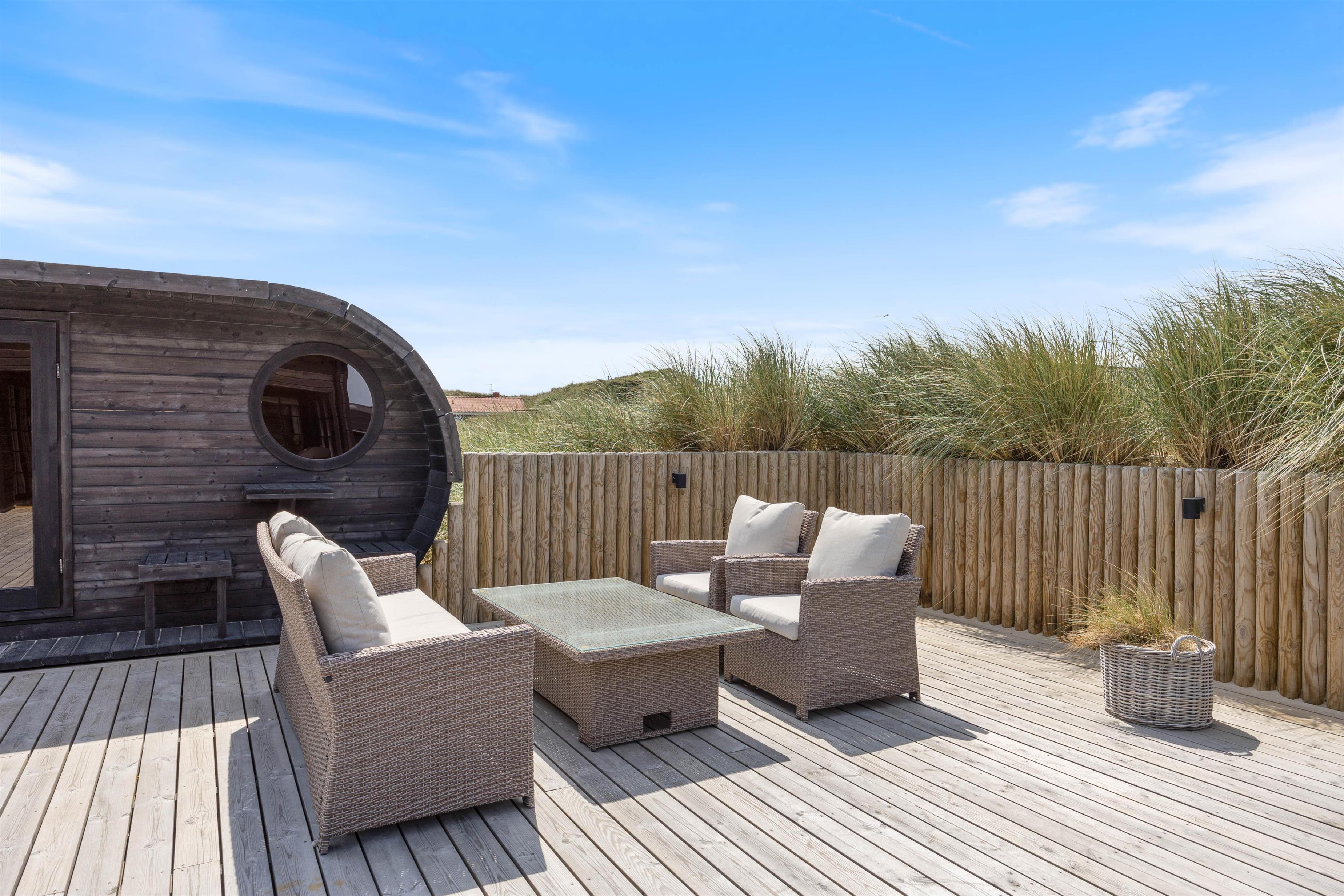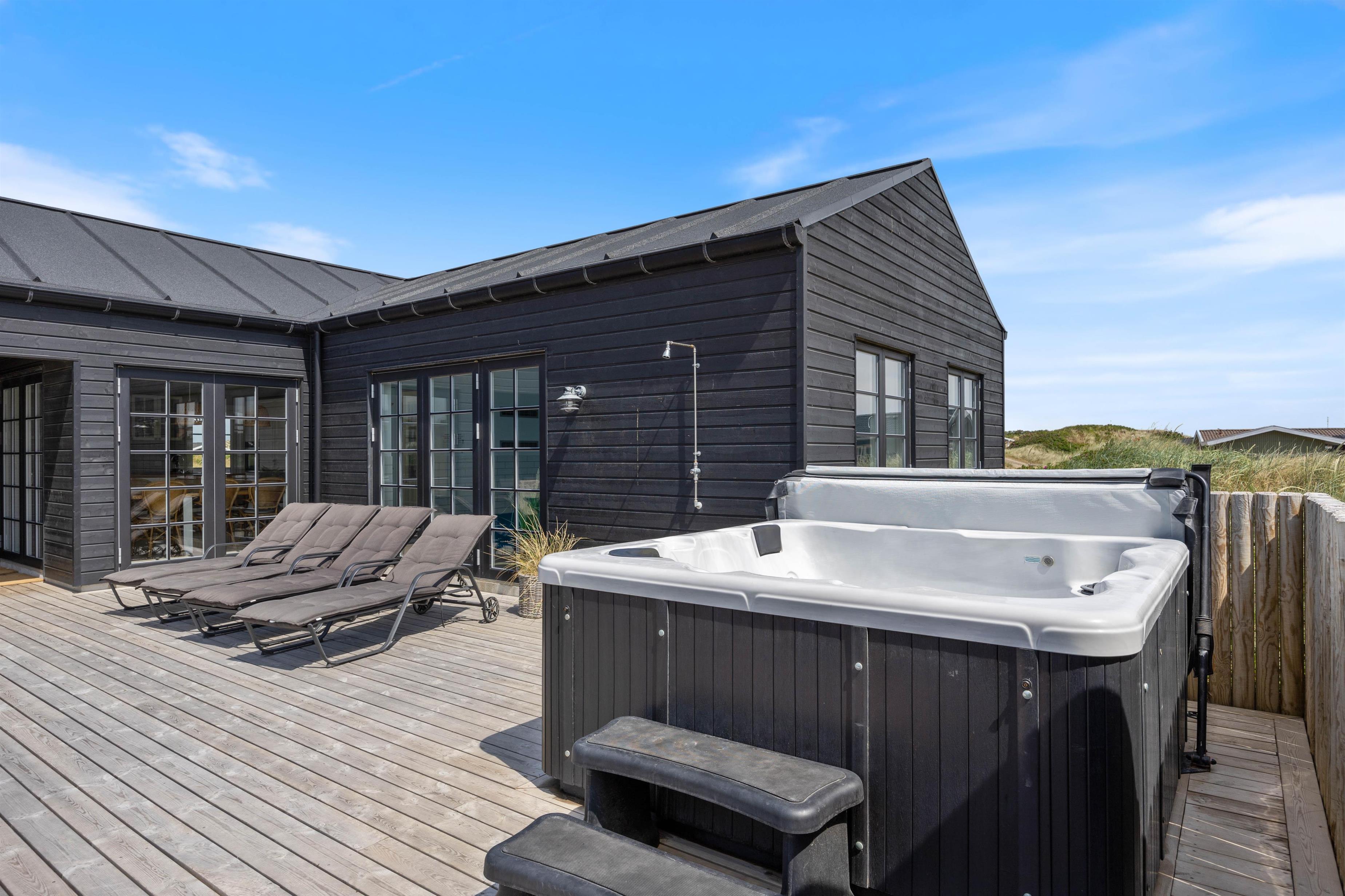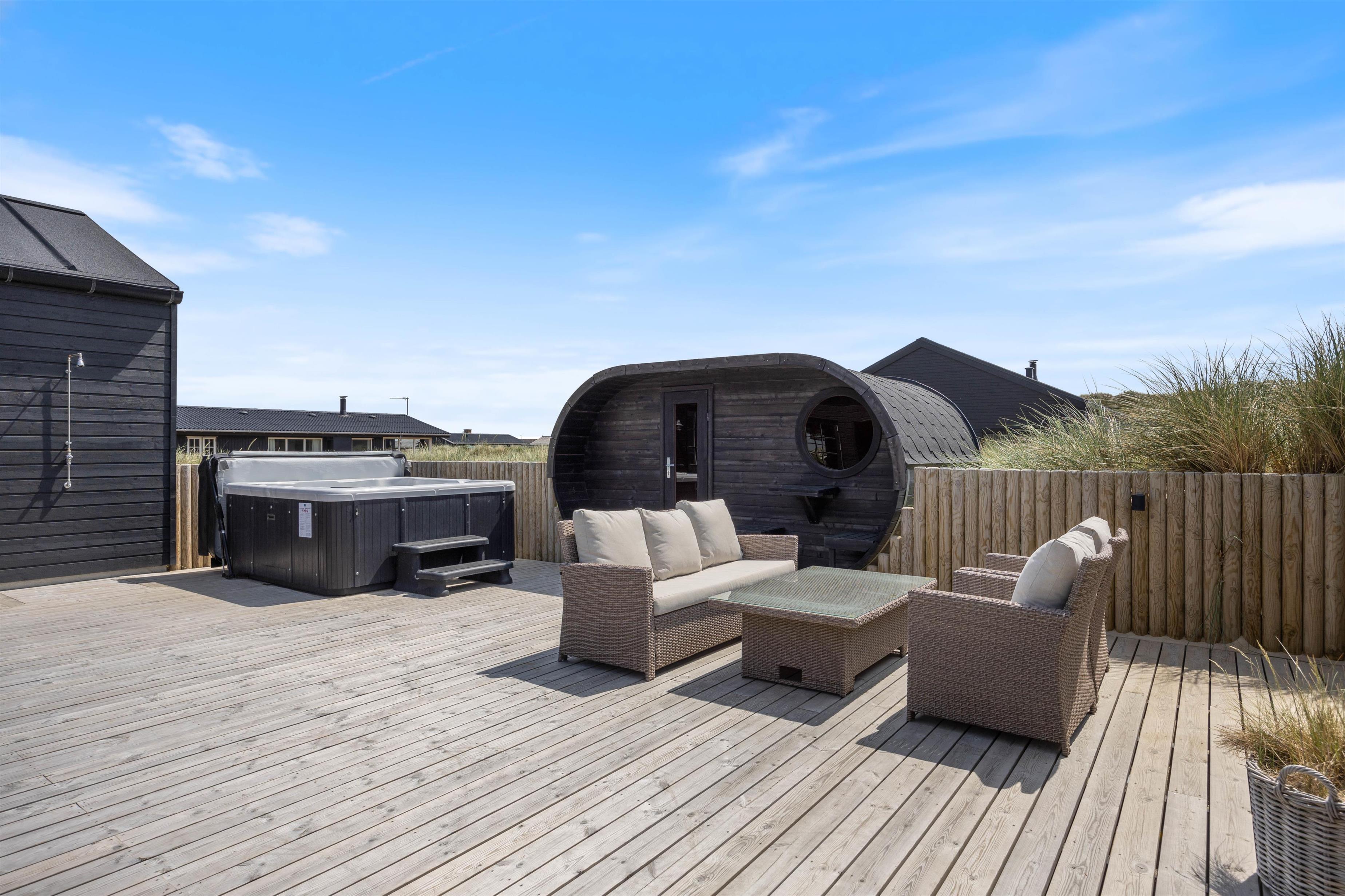 Kan I bruge en dukkert i swimmingpoolen, er den lige ved siden af. Alle aldersgrupper kan i det hele taget være aktive næsten døgnet rundt i dette feriehus, f.eks i det fine aktivitetsrum midt i feriehuset, hvor I kan få gang i energiomsætningen. Afslapning indendørs eller udendørs er også tilgængeligt, enten i de behagelige sofaer og stole eller udendørs i de komfortable møbler. I de fire soveværelser med dobbeltsenge kan I få godt udsovet i den friske vesterhavsluft. De 2 badeværelser gør, at I ikke behøver at stå i kø til morgenbadet.