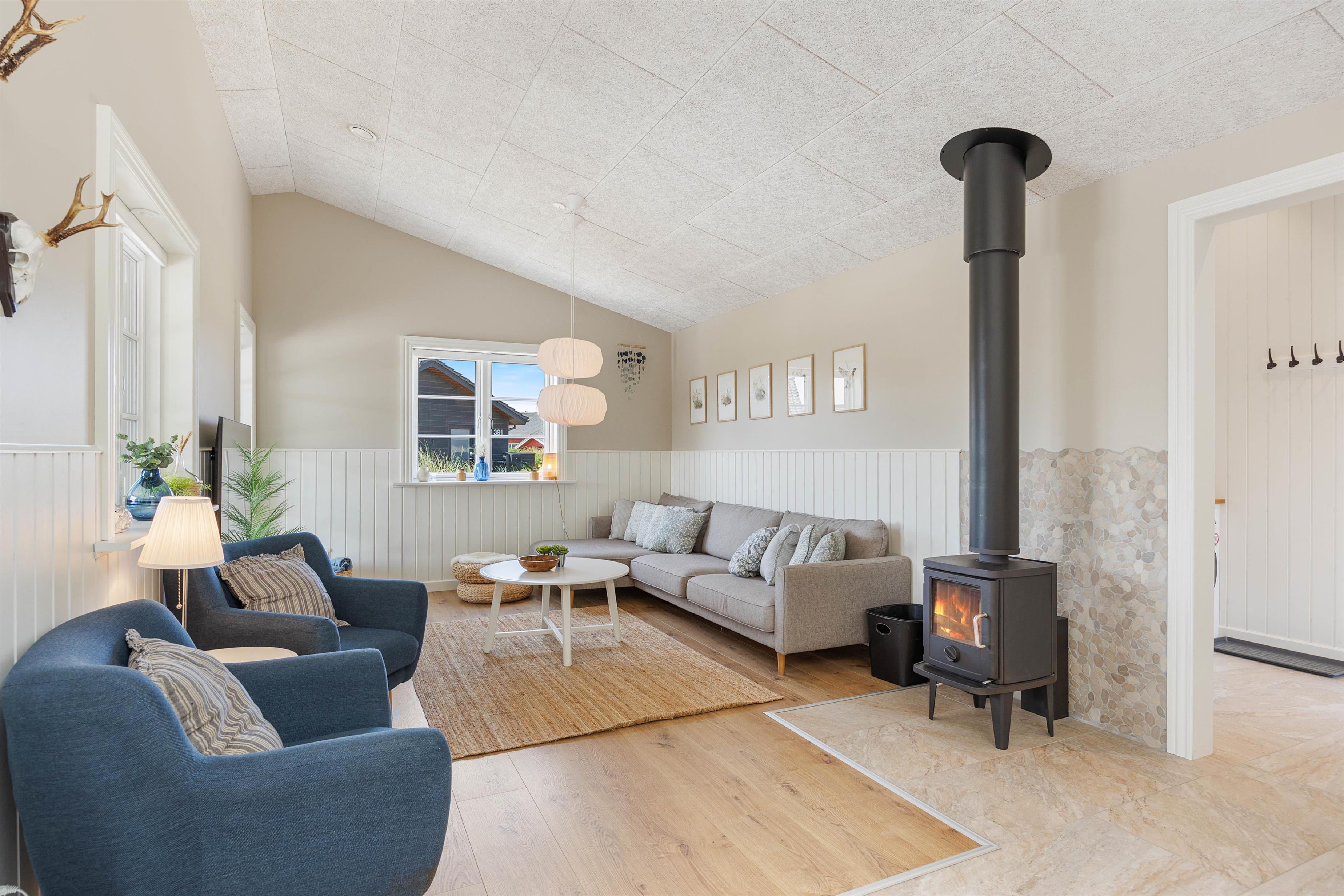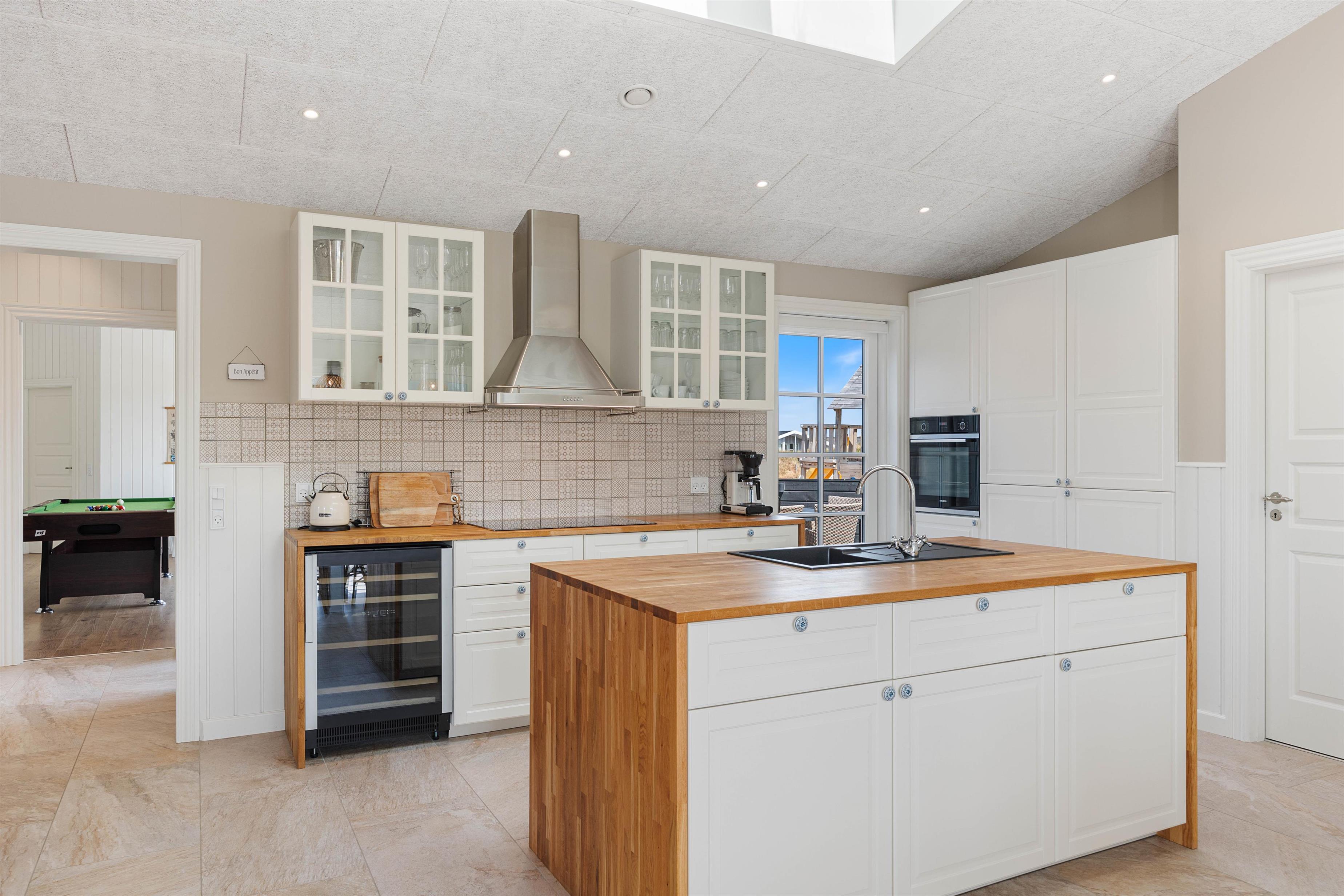 Det naturlige midtpunkt i sommerhuset på 180 m2 er det lyse og venlige køkkenalrum i forbindelse med stuen med brændeovn. I det åbne køkken finder I alle faciliteter til at frembringe lækre måltider – eventuelt egnsretter. Her kan I have mange hyggelige stunder i køkkenet, omkring spisebordet eller i stuen foran brændeovnen.
