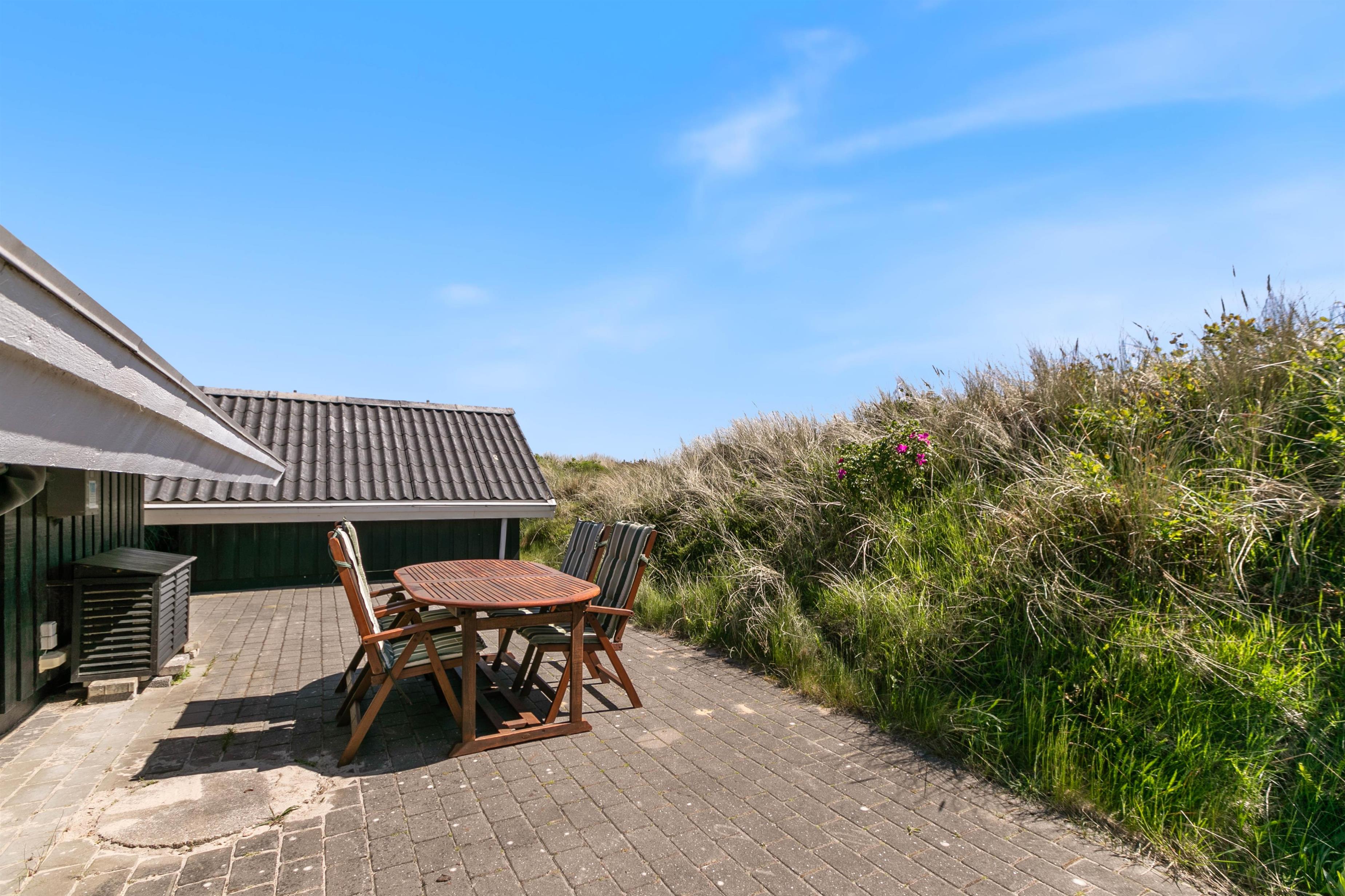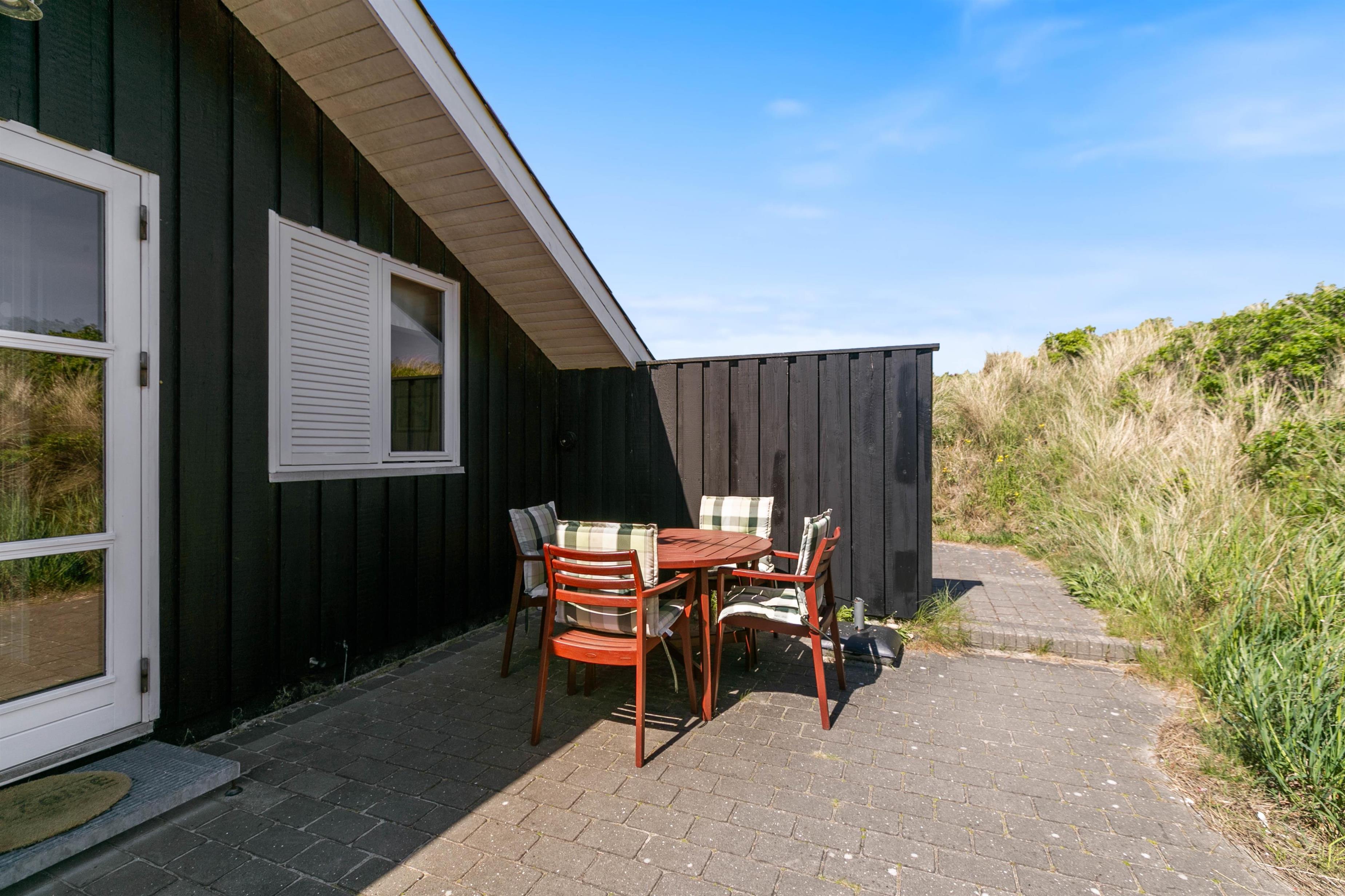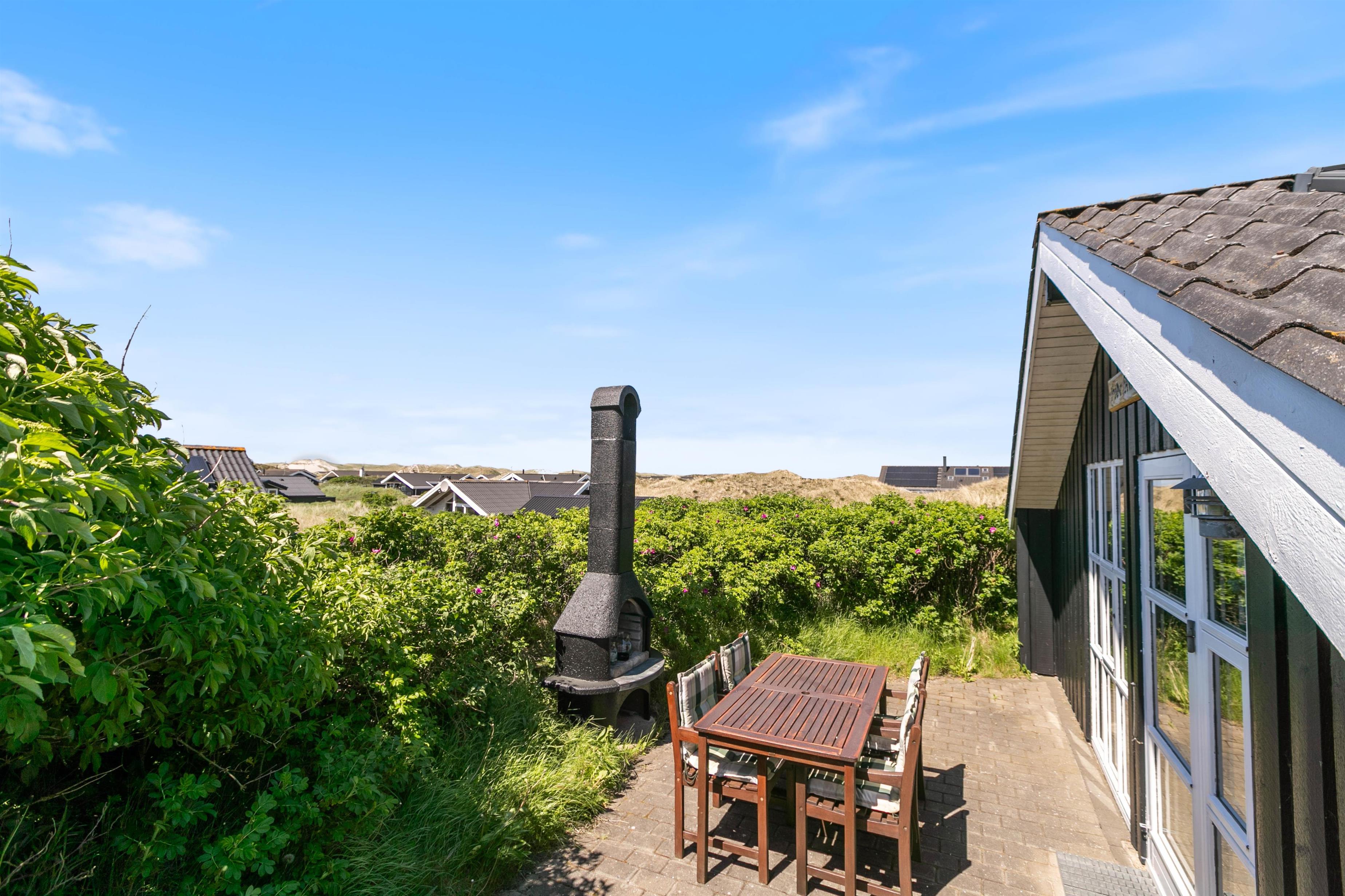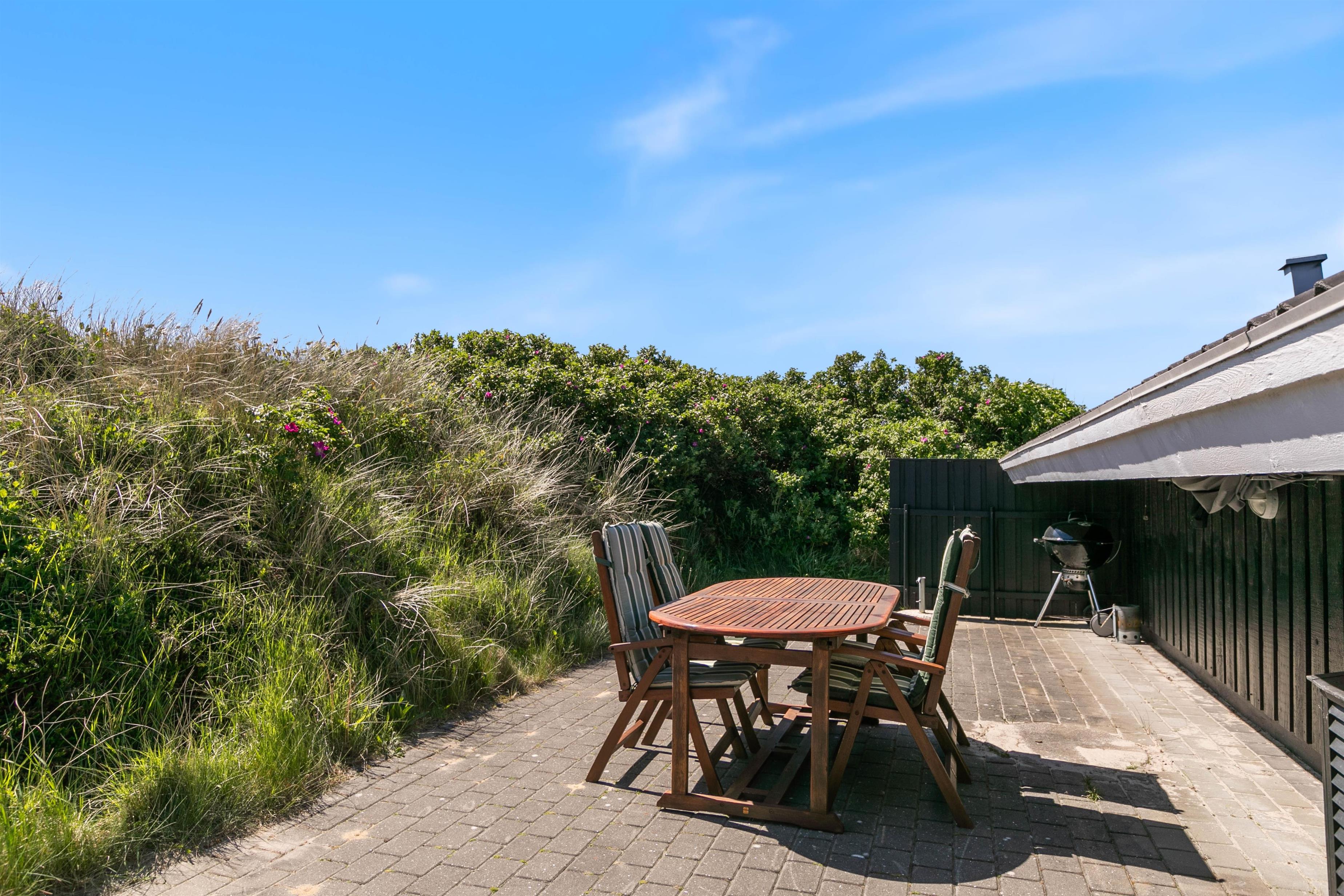 Rundt om sommerhuset er der flere dejlige terrasser med gode læforhold. Her står komfortable havemøbler, liggestole og en grill klar til hyggelige stunder under åben himmel. Mod syd findes en overdækket del, hvor du kan sidde ude selv på dage med lidt vind eller småregn. På toppen af klitten bag sommerhuset ligger en lille udsigtsterrasse, hvorfra du kan nyde panoramaudsigten over området, klitterne, heden og fjorden i det fjerne.