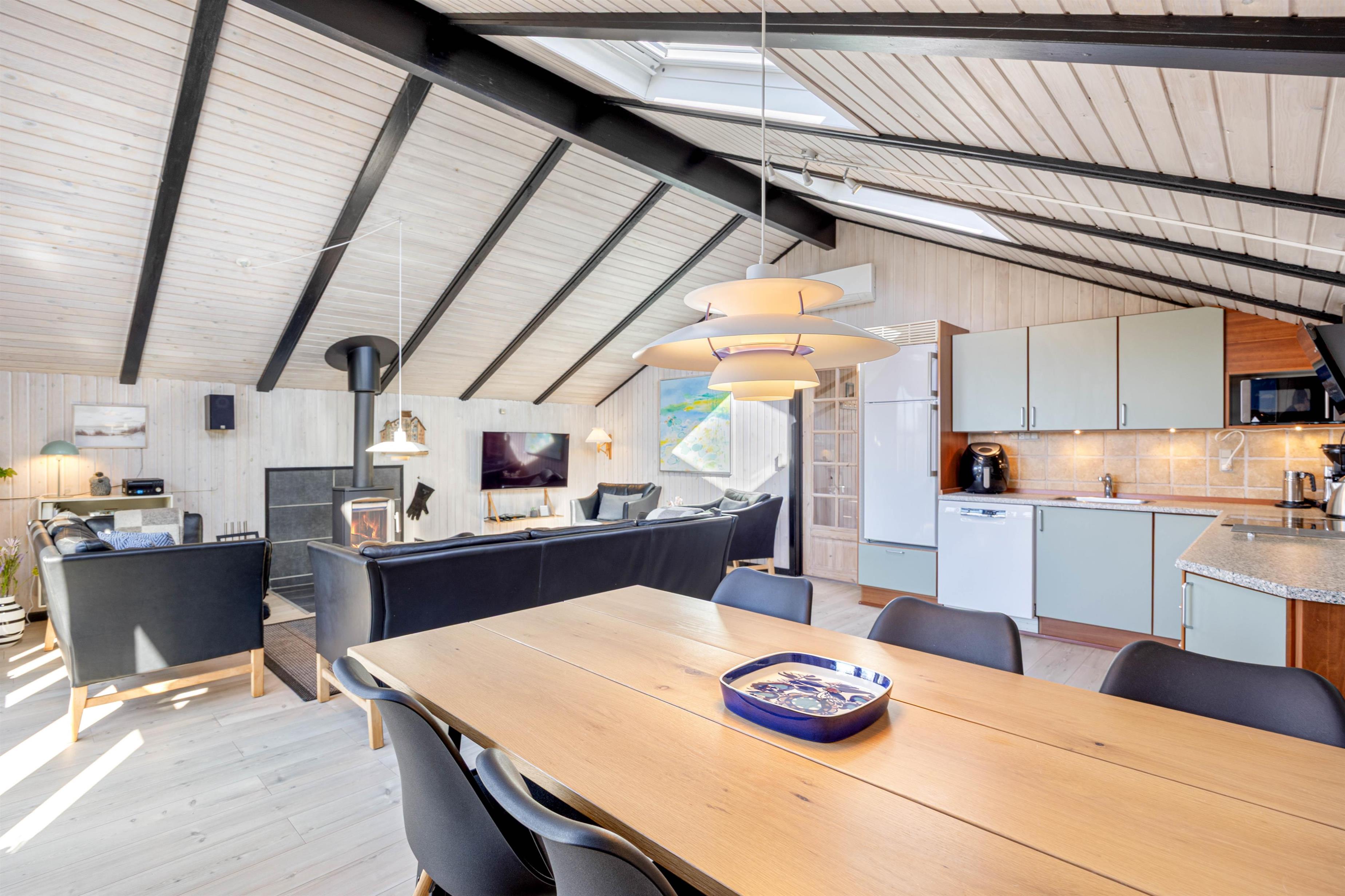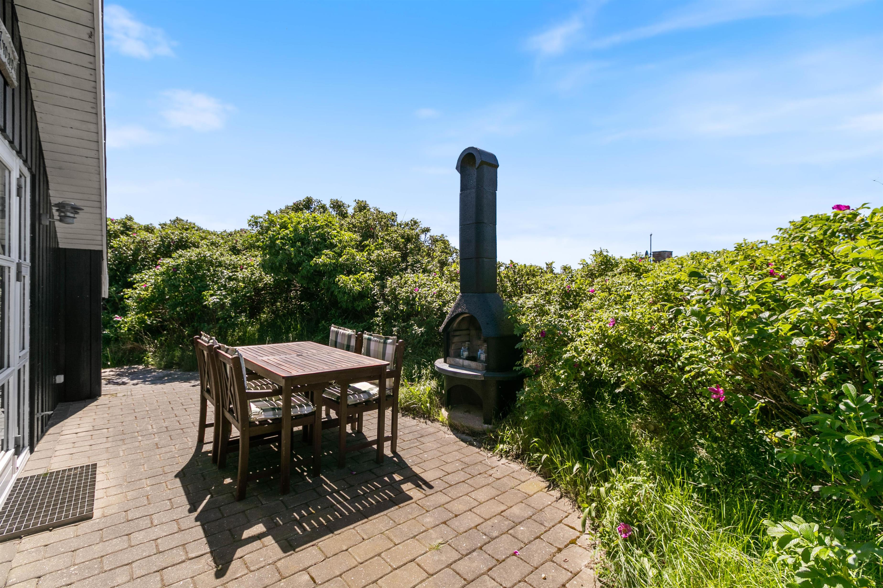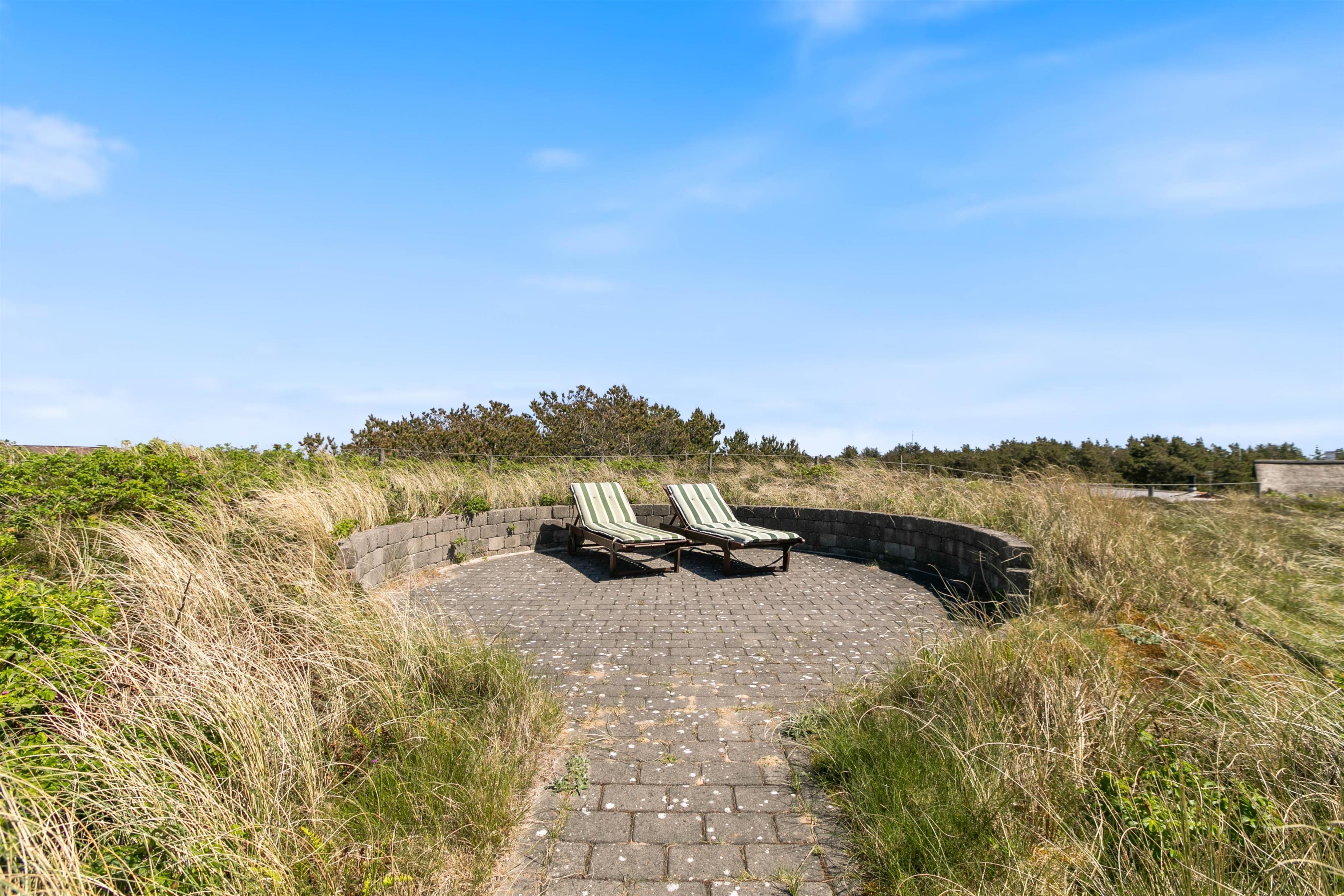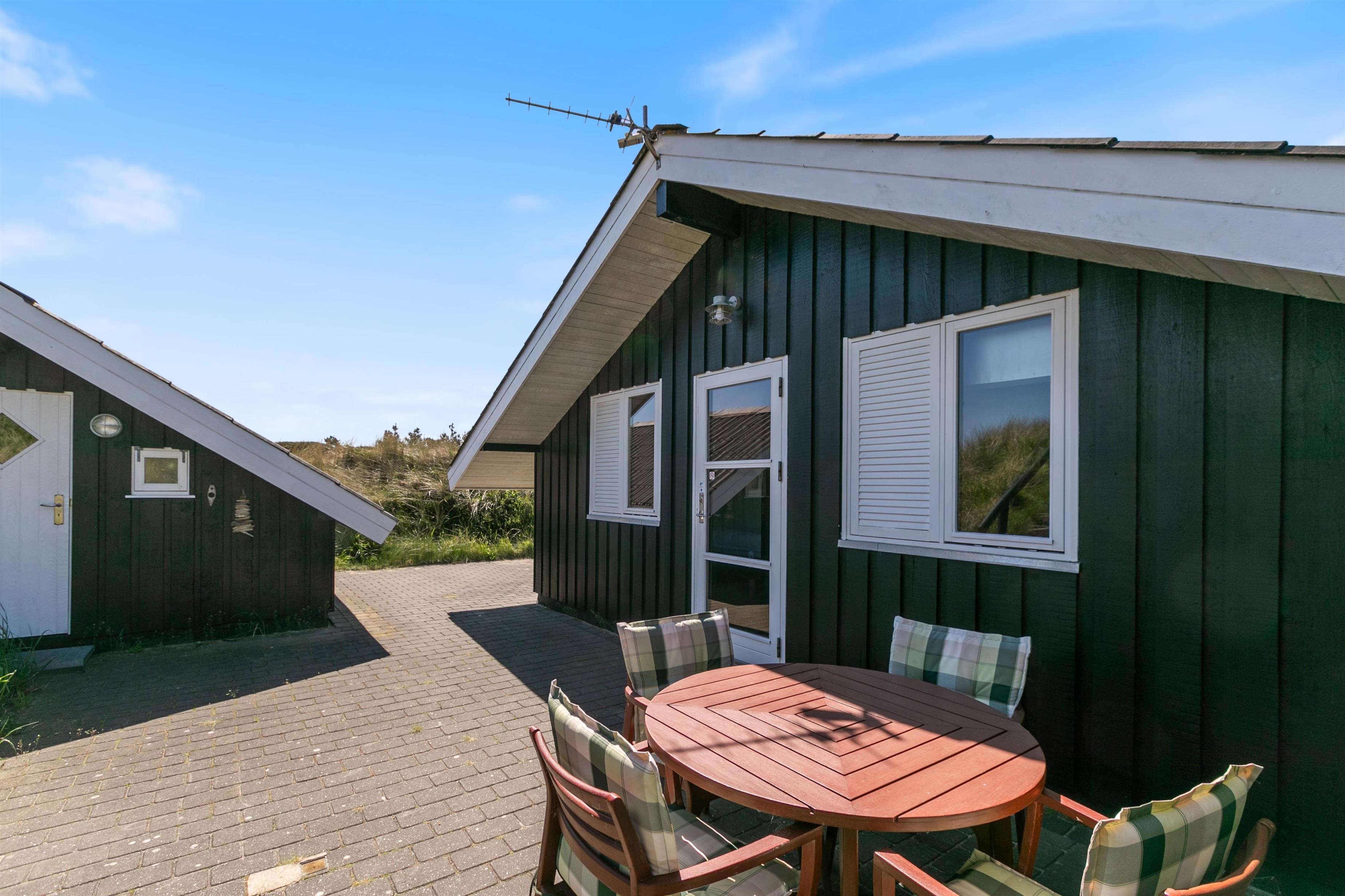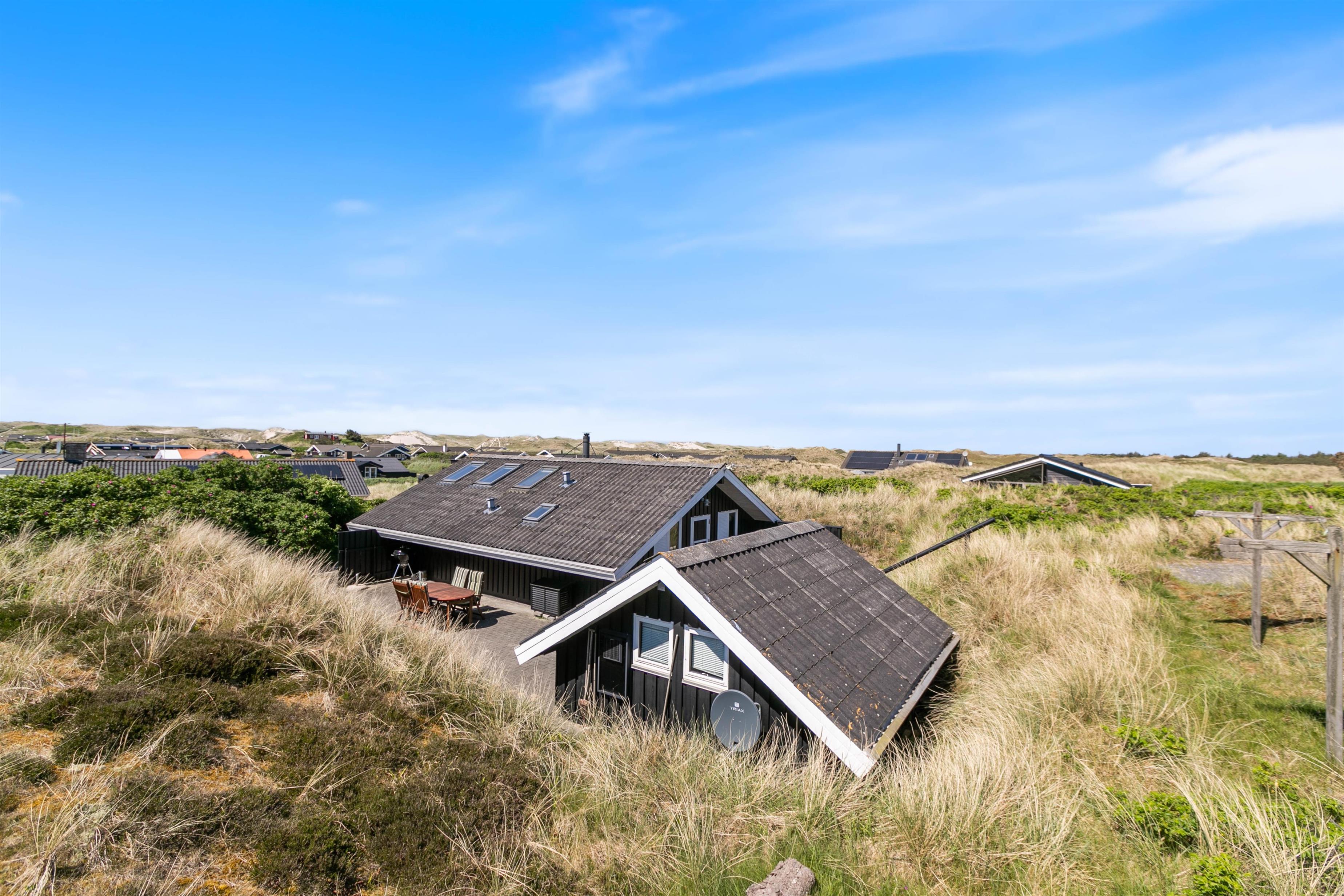 Rundt om sommerhuset er der flere dejlige terrasser med gode læforhold. Her står komfortable havemøbler, liggestole og en grill klar til hyggelige stunder under åben himmel. Mod syd findes en overdækket del, hvor du kan sidde ude selv på dage med lidt vind eller småregn. På toppen af klitten bag sommerhuset ligger en lille udsigtsterrasse, hvorfra du kan nyde panoramaudsigten over området, klitterne, heden og fjorden i det fjerne.