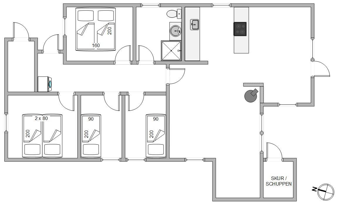 I bryggerset er der både vaskemaskine og tørretumbler, så I kan friske håndklæderne op under opholdet. Udover alkoven er her 4 soverum, hvoraf 2 er indrettet med dobbeltseng og 2 med en enkeltseng.