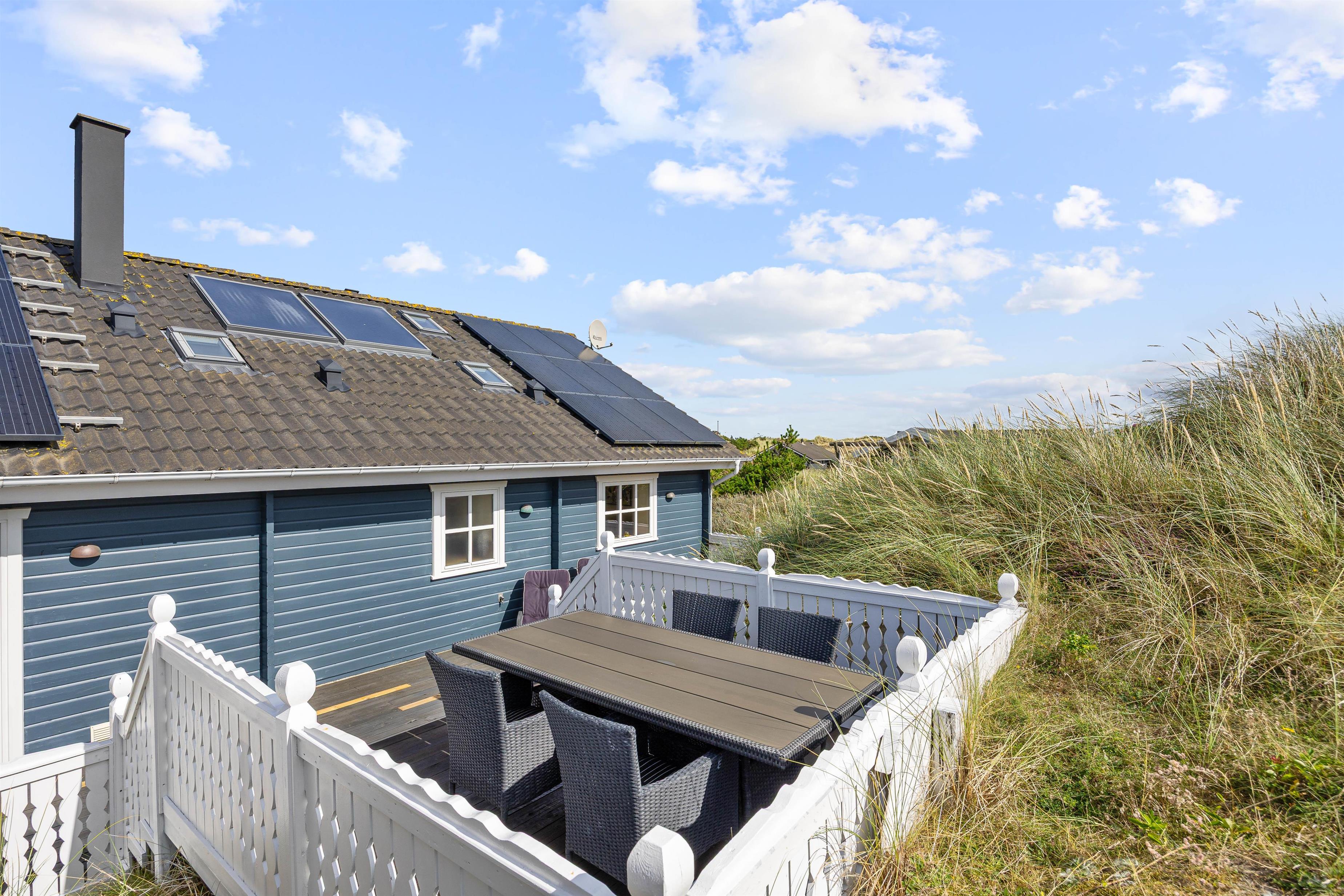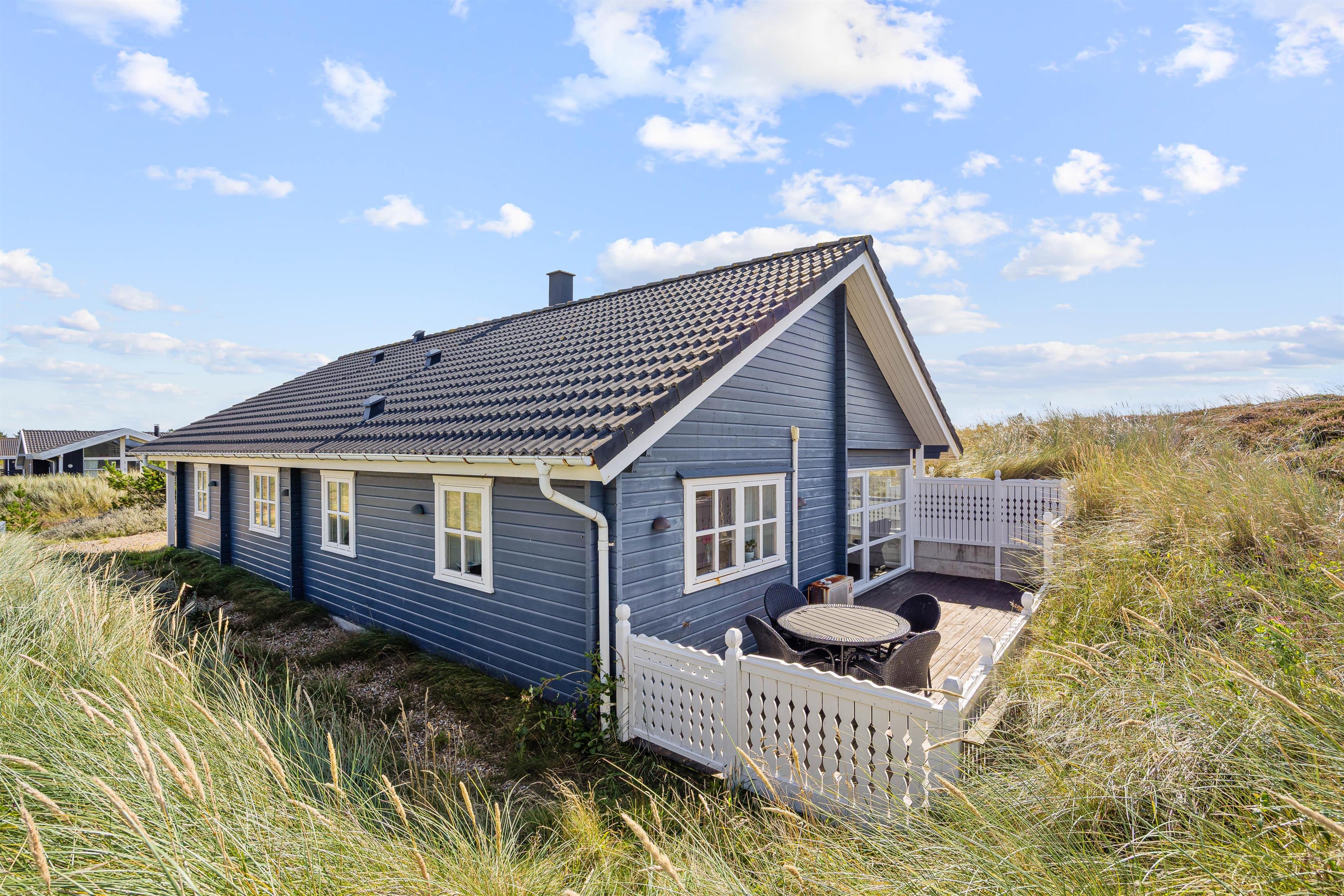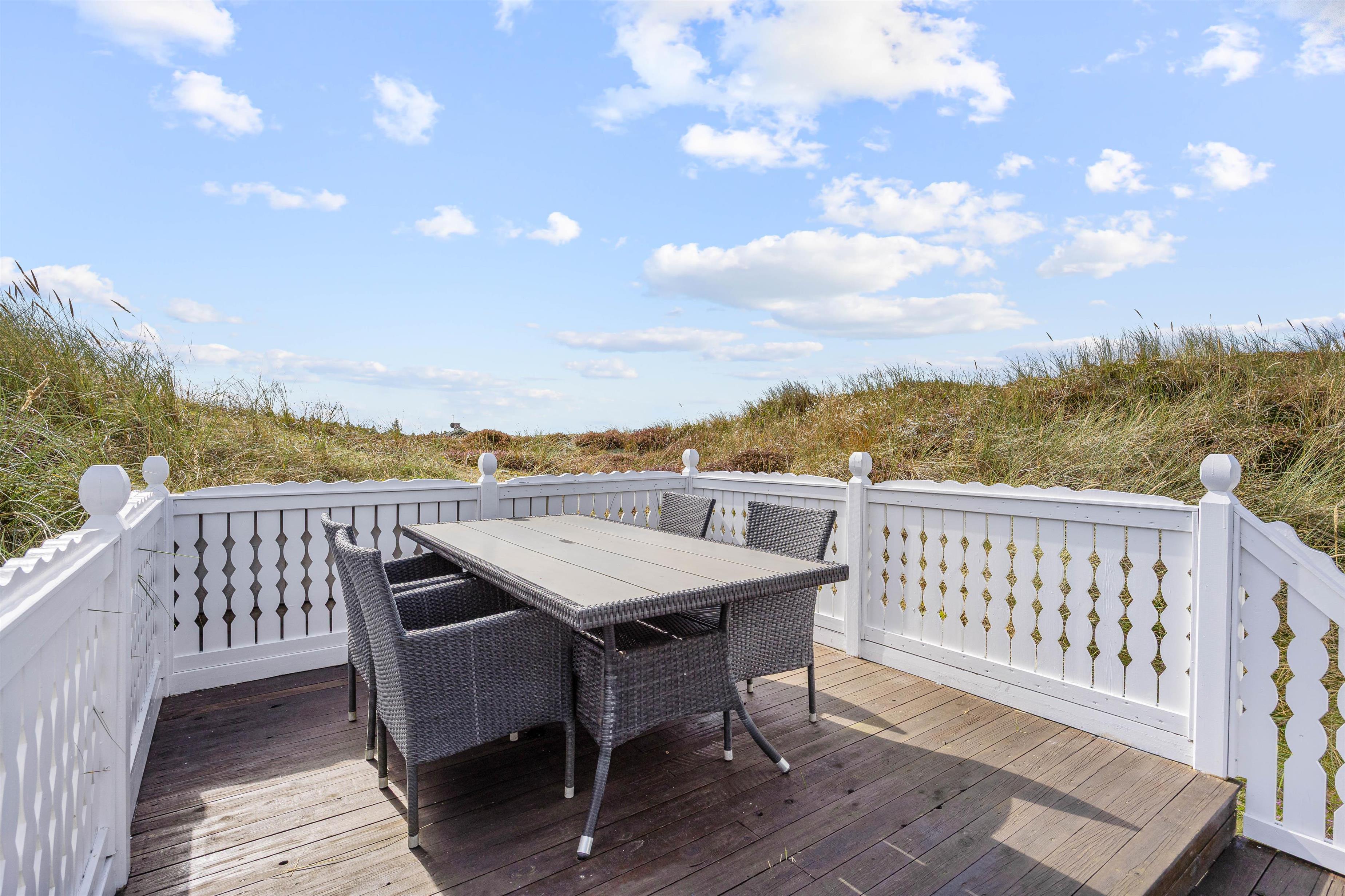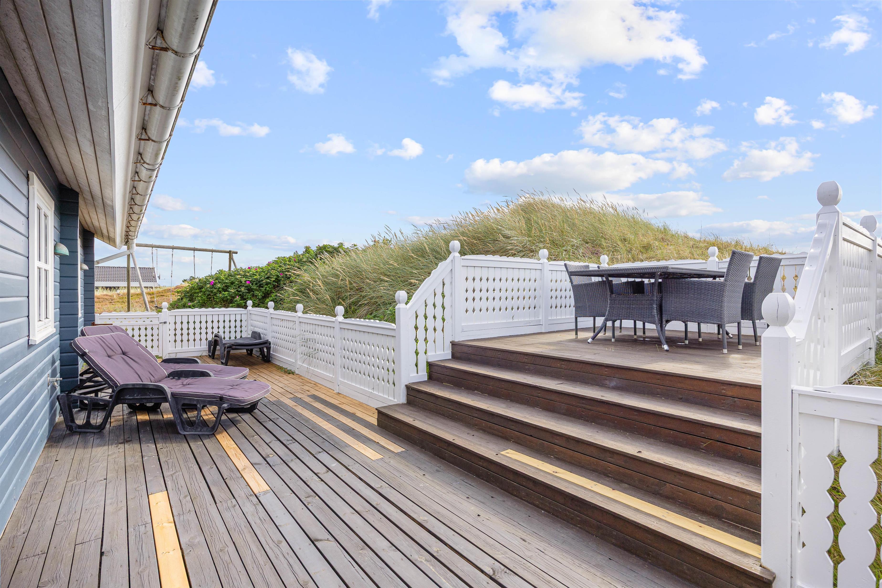 På den skønne, lukkede terrasse kan I uforstyrret kan nyde morgenkaffen og hyggelige grillaftener. En del af terrassen er overdækket, så selv i det til tider drilske danske sommervejr kan I sidde ude og nyde den friske vesterhavsluft. Fra terrassen har I en flot udsigt til de marehalmsklædte klitter, der kendetegner naturen ved Vesterhavet.