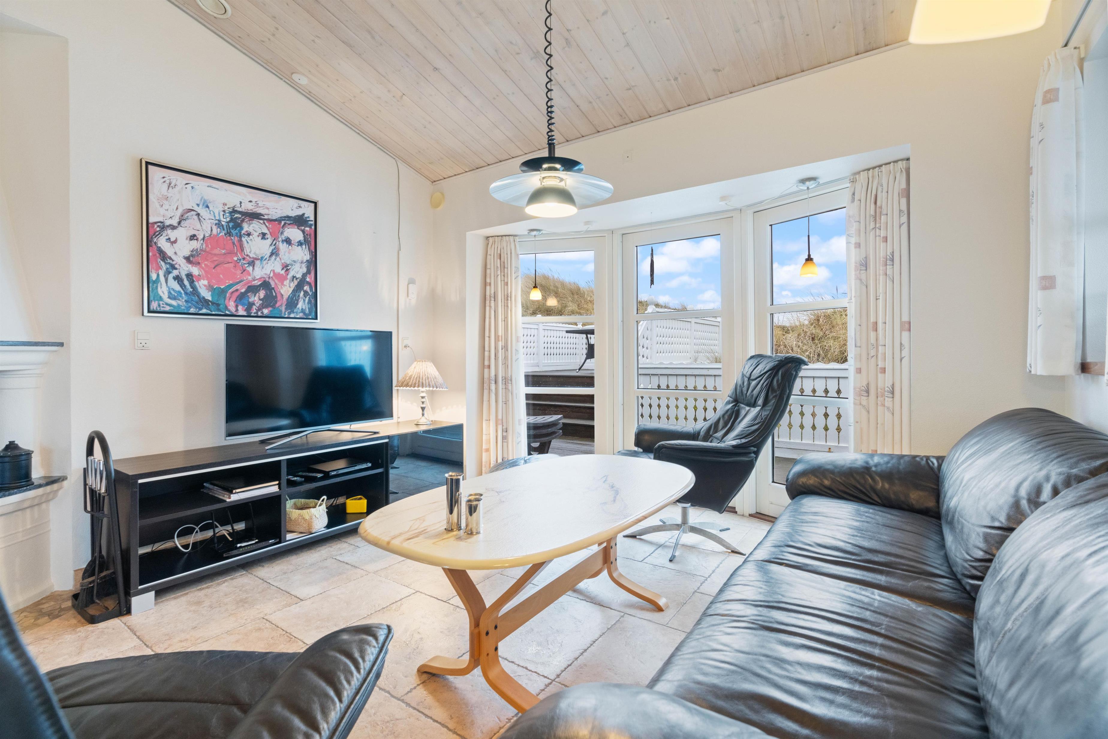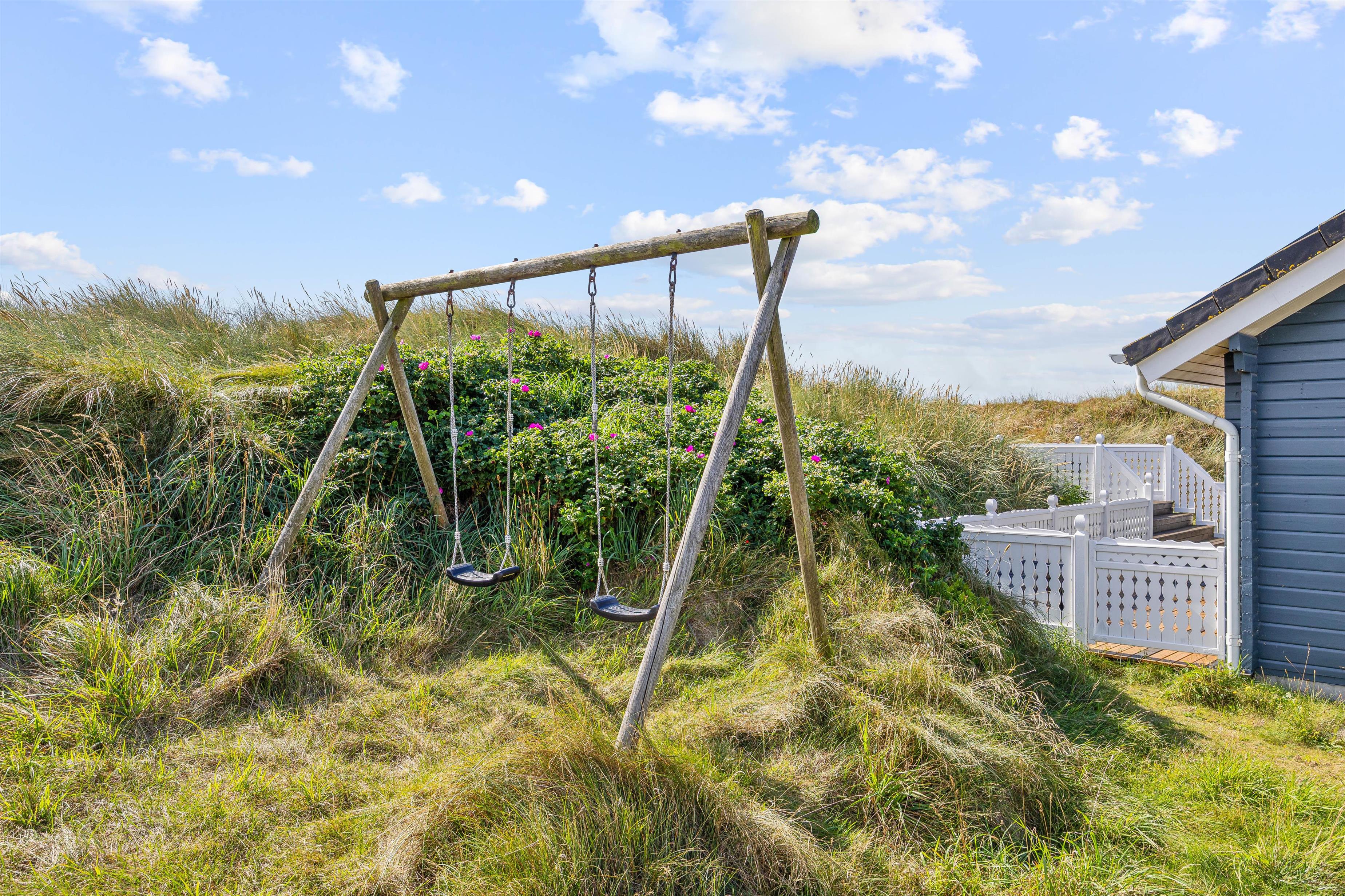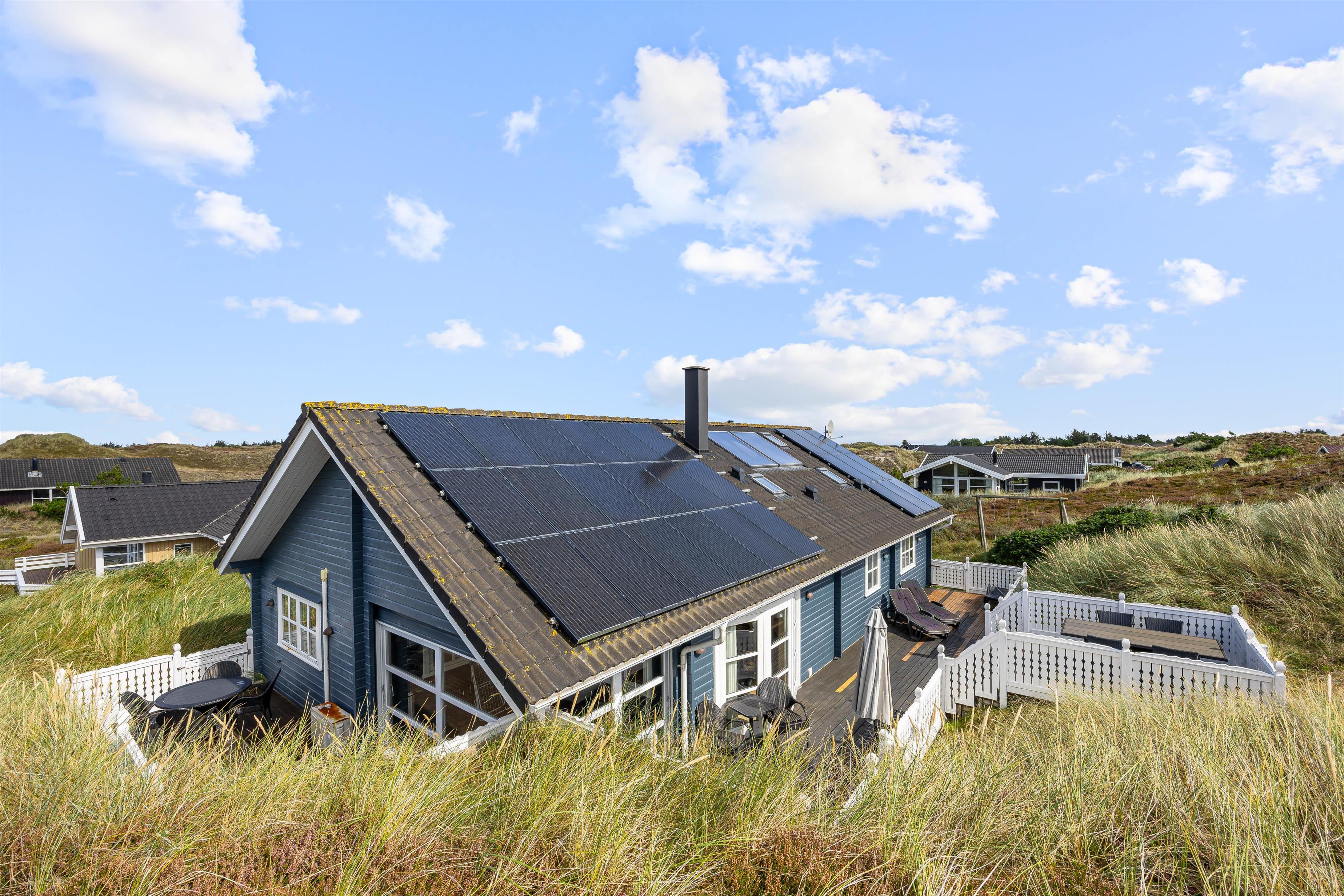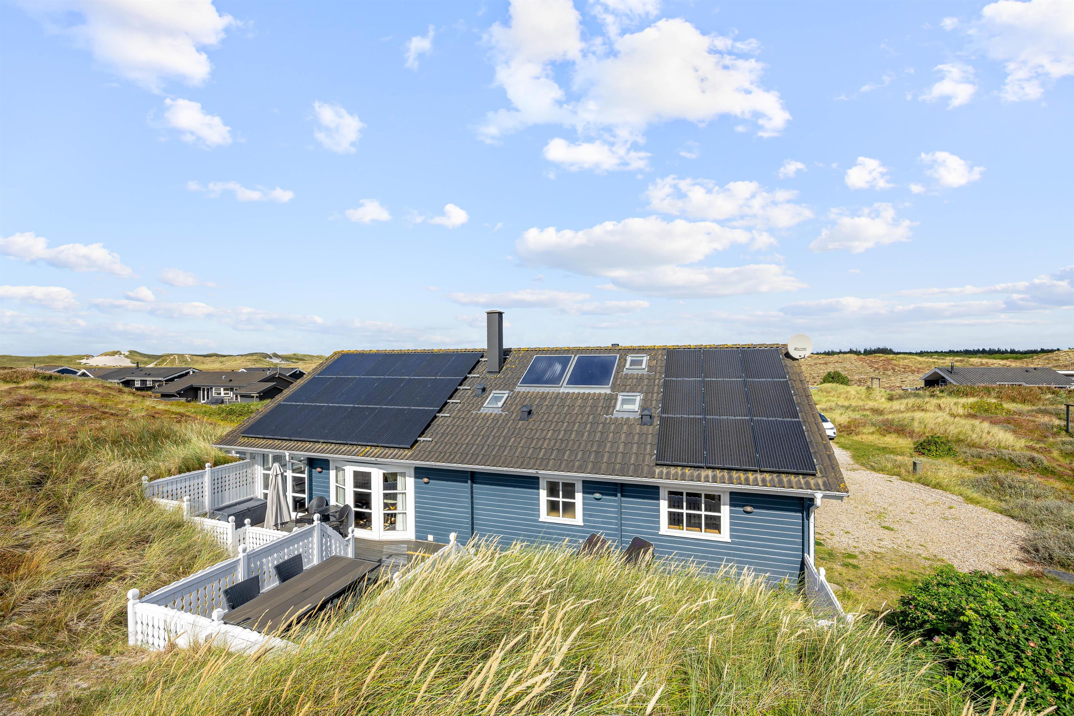 På den skønne, lukkede terrasse kan I uforstyrret kan nyde morgenkaffen og hyggelige grillaftener. En del af terrassen er overdækket, så selv i det til tider drilske danske sommervejr kan I sidde ude og nyde den friske vesterhavsluft. Fra terrassen har I en flot udsigt til de marehalmsklædte klitter, der kendetegner naturen ved Vesterhavet.