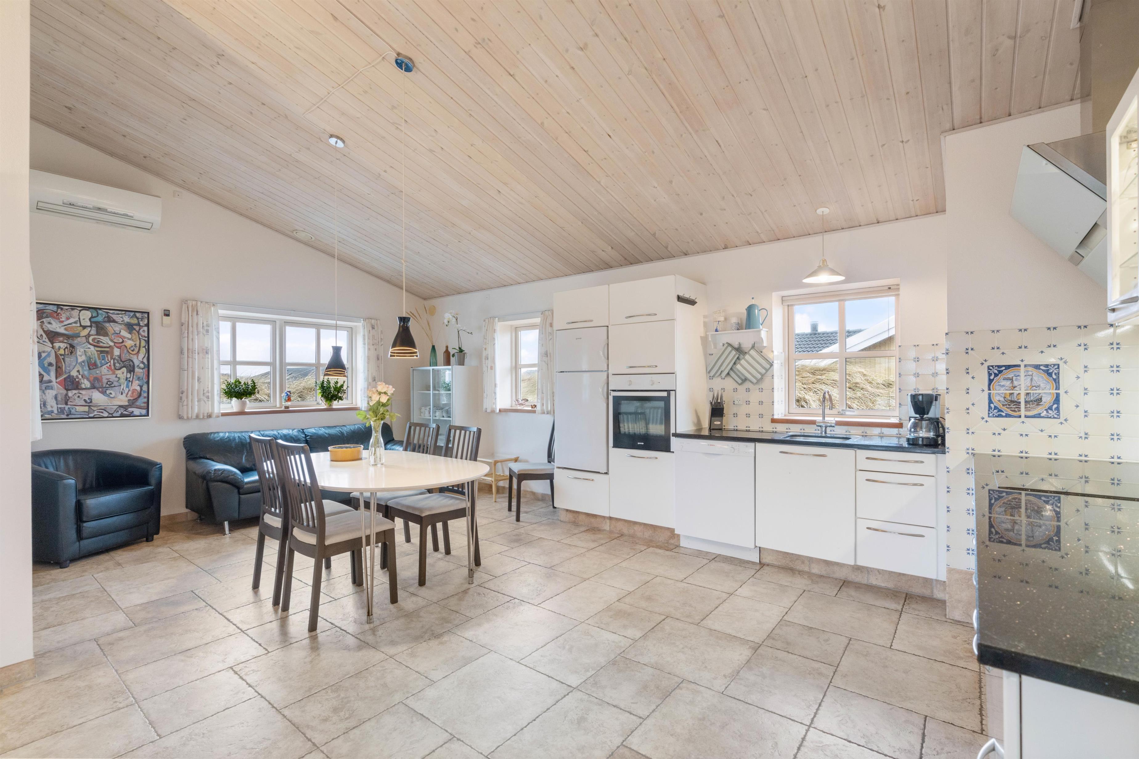 Feriehuset på Bjerregårdsvej 282 ligger for enden af en lille stikvej, så her kan I nyde en uforstyrret og afslappende ferie sammen. Man føler sig hjemme straks, man træder indenfor i det hyggelige køkken/alrum og opholdsstue. Det åbne køkken indeholder alt, hvad I behøver for at tilberede lækre hjemmelavede måltider til hinanden. Måltiderne nydes ved spisebordet – og her kan I også udfordre hinanden i et brætspil. Bagefter kan I trække jer tilbage i sofagruppen og hygge jer foran ilden i den store flotte pejs, eller I kan trække ud i udestuen med et glas vin, og nyde aftenskumringen der.