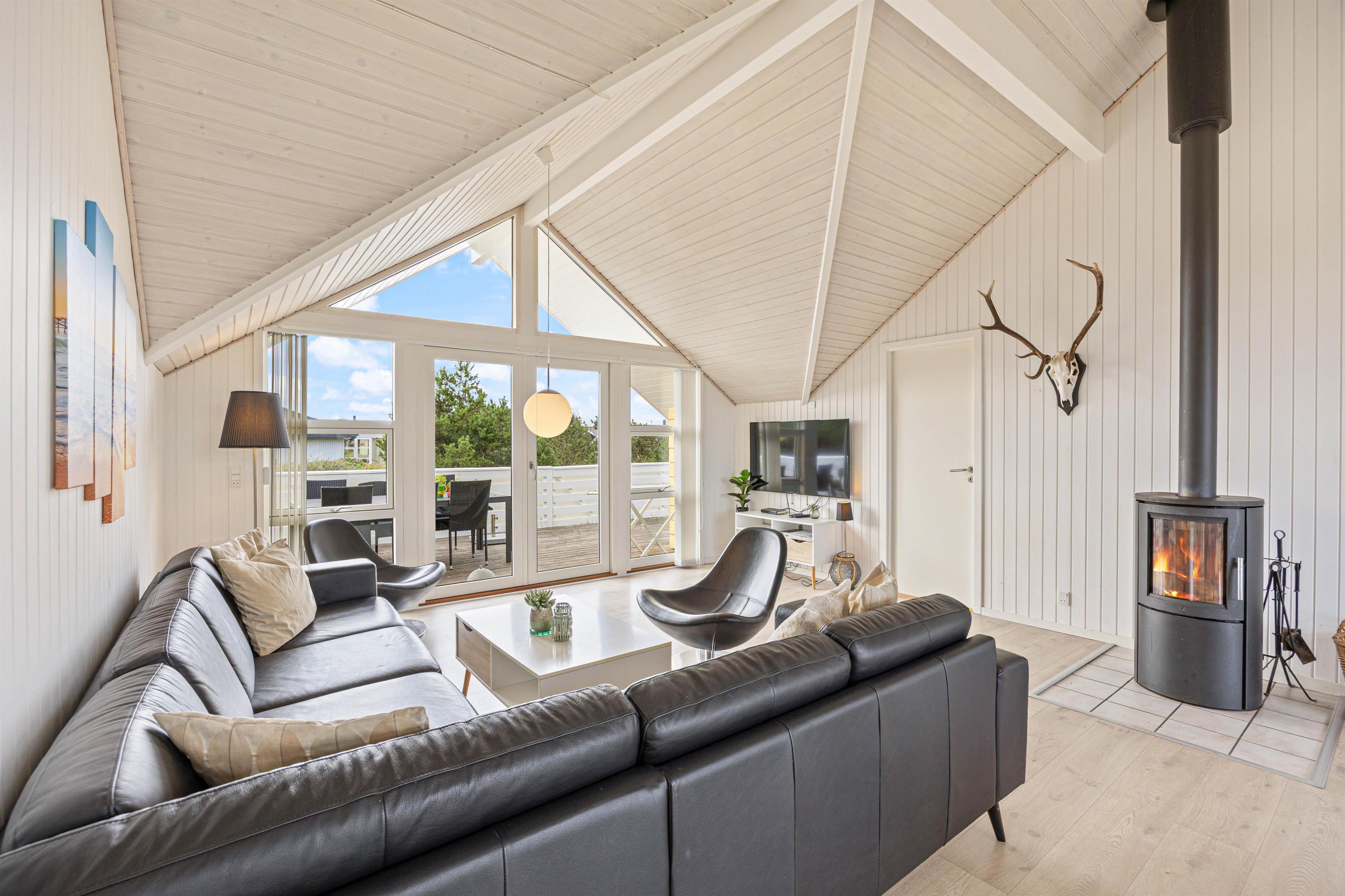 Et rummeligt rum med højt til loftet og et dejligt vinduesparti, hvorfra lyset vælter ind i. Centralt placeret er brændeovnen, der skaber en hyggelig stemning, og samtidig opdeler stuen og køkkenet. I køkkenet kan I sammen lave nogle skønne måltider, som senere skal nydes omkring spisebordet – efterfølgende klarer opvaskemaskinen det kedelige arbejde, mens I slapper af i sofaen. Stuen indbyder til mange hyggelige stunder. Lænestolen er perfekt til ferielæsningen, mens den store hjørnesofa inviterer jer alle til film- eller brætspilsaftner.