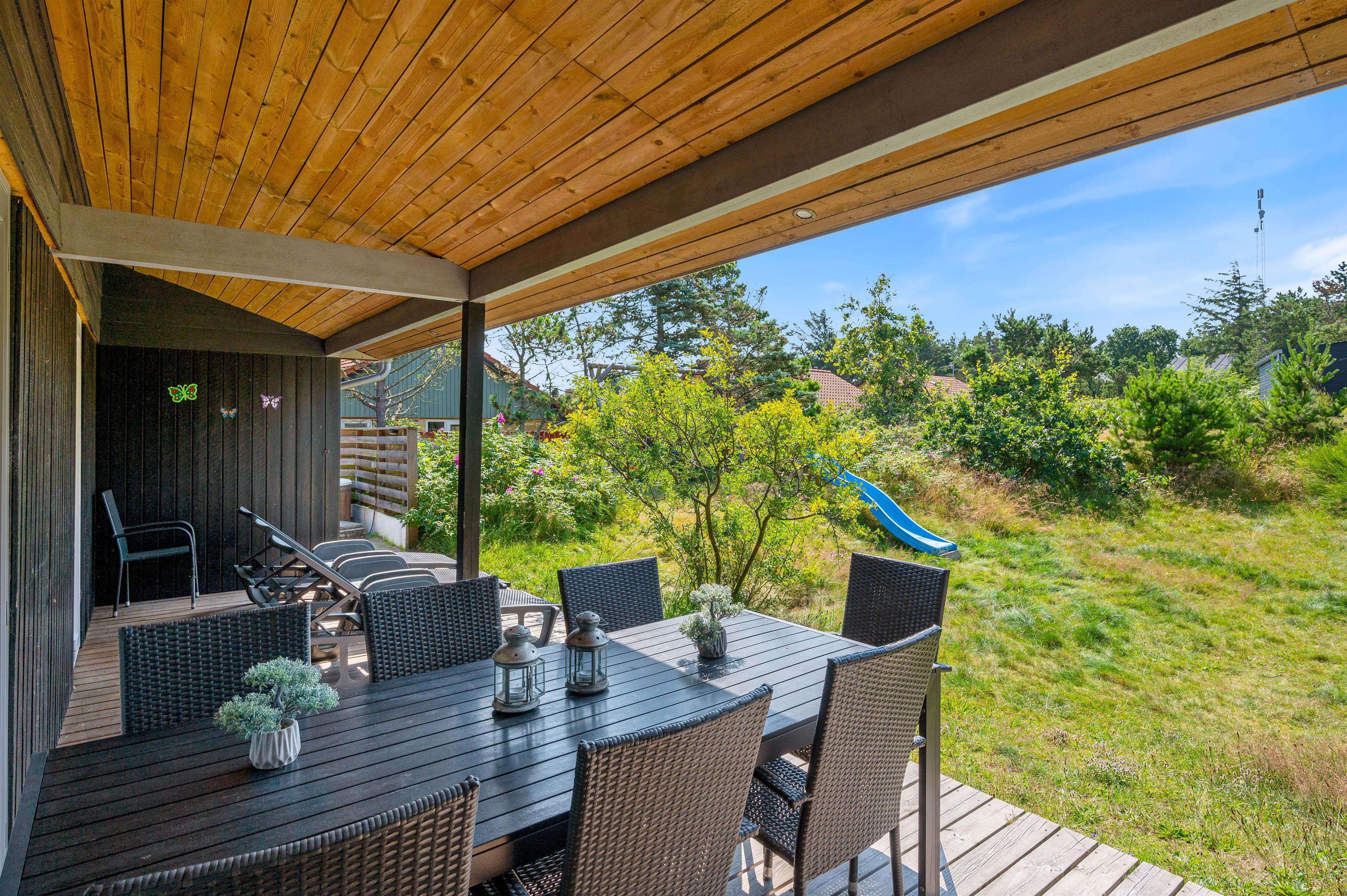 Udendørsområdet er et trækplaster ved sommerhuset. Den overdækkede terrasse gør det muligt for jer at nyde den friske luft selv i ustadigt vejr. Et hyggeligt bålsted indbyder til hyggelige aftener med snobrød og bålmad. Vildmarksbadet gemmer sig på den store terrasse bag gamle træer, så I kan slappe af i private omgivelser. Den indhegnede naturgrund byder på et grønt, beskyttet miljø, der er perfekt til afslappende timer i det fri. Her kan I trække jer tilbage, nyde naturen og stresse fuldstændigt af. Til de små er der en gynge, så de kan brænde lidt ekstra energi af der.