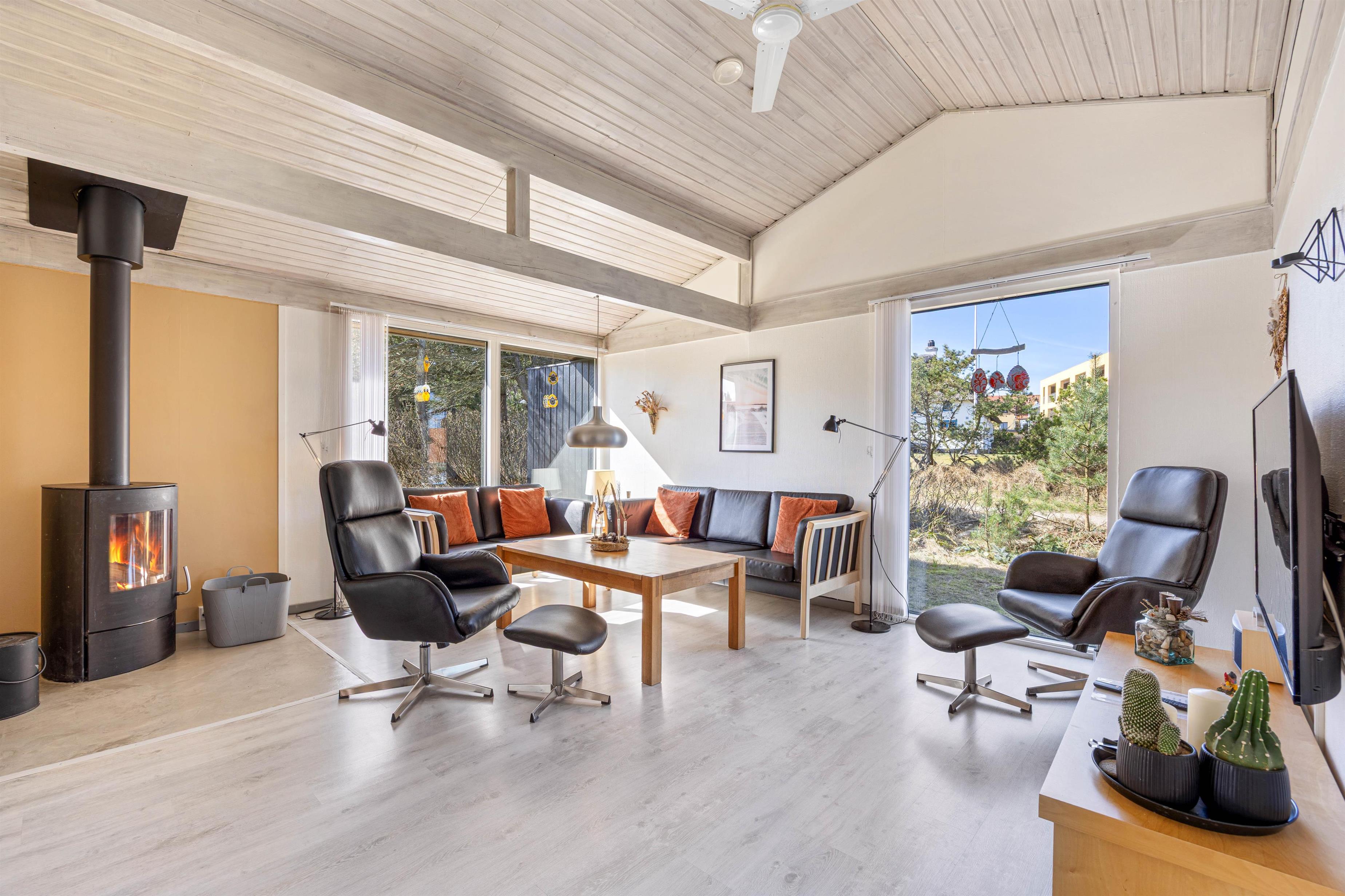Hjertet i feriehuset er den hyggelige stue med brændeovnen, som topper feriestemningen med en behagelig atmosfære på kølige aftener. Den omkostnings- og energibesparende varmepumpe sørger for behagelige temperaturer i feriehuset. Træbeklædte, lyse vægge i kombination med de store vinduer giver en lys og let atmosfære, hvor man føler sig rigtig godt tilpas.