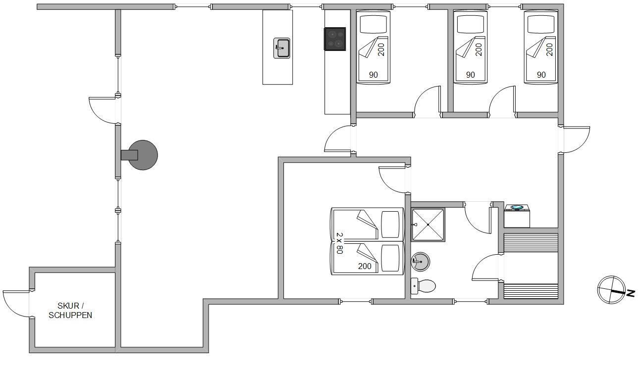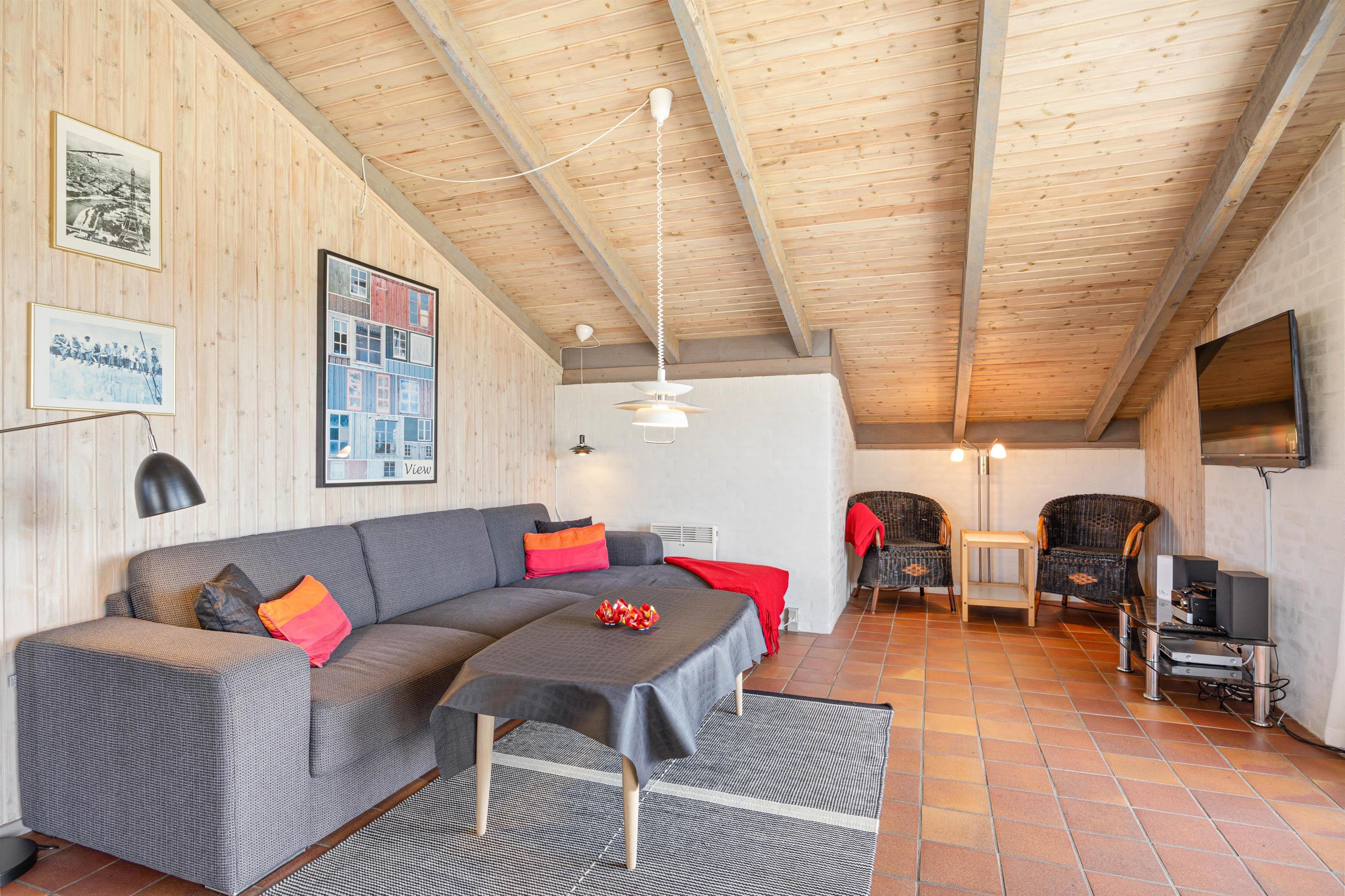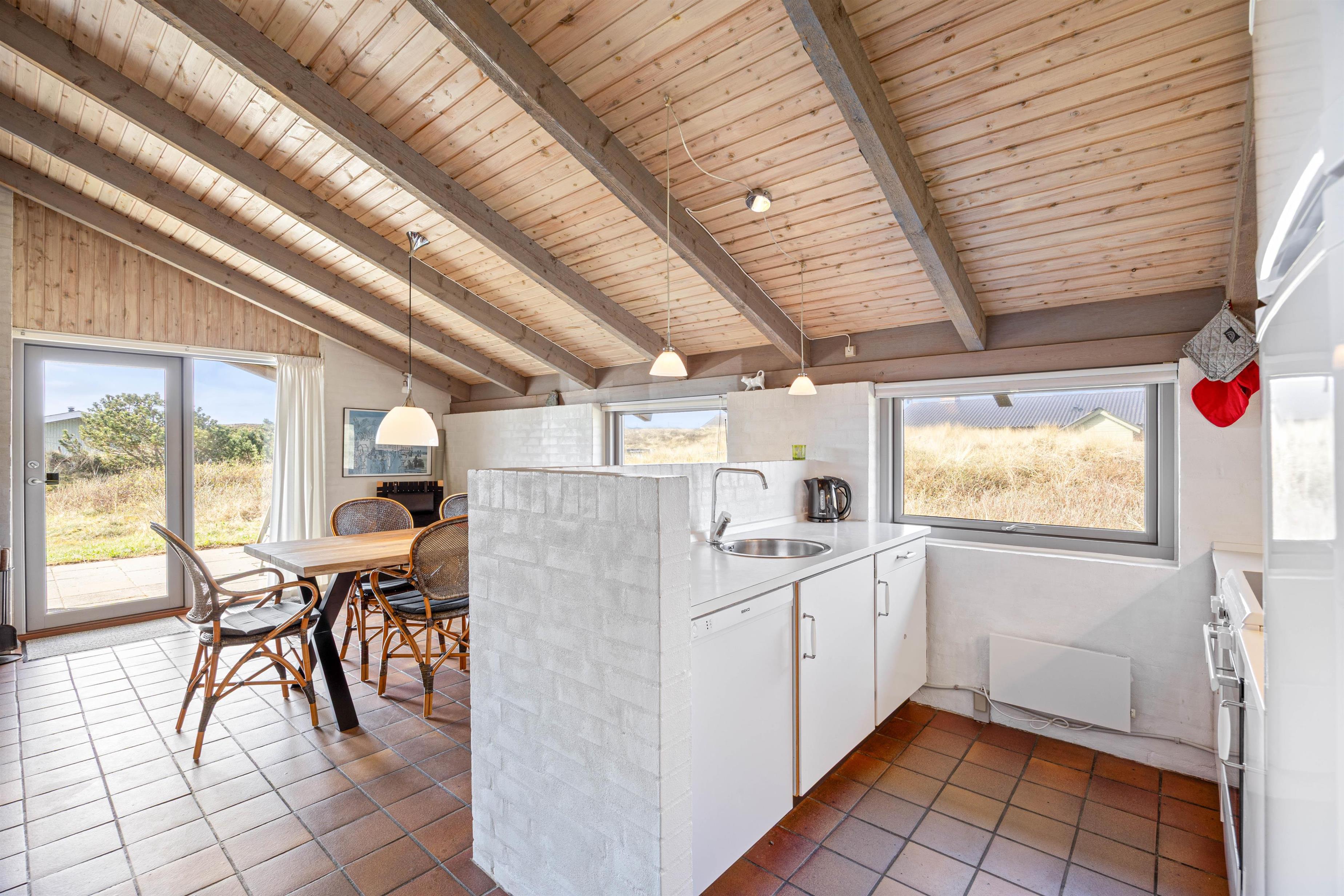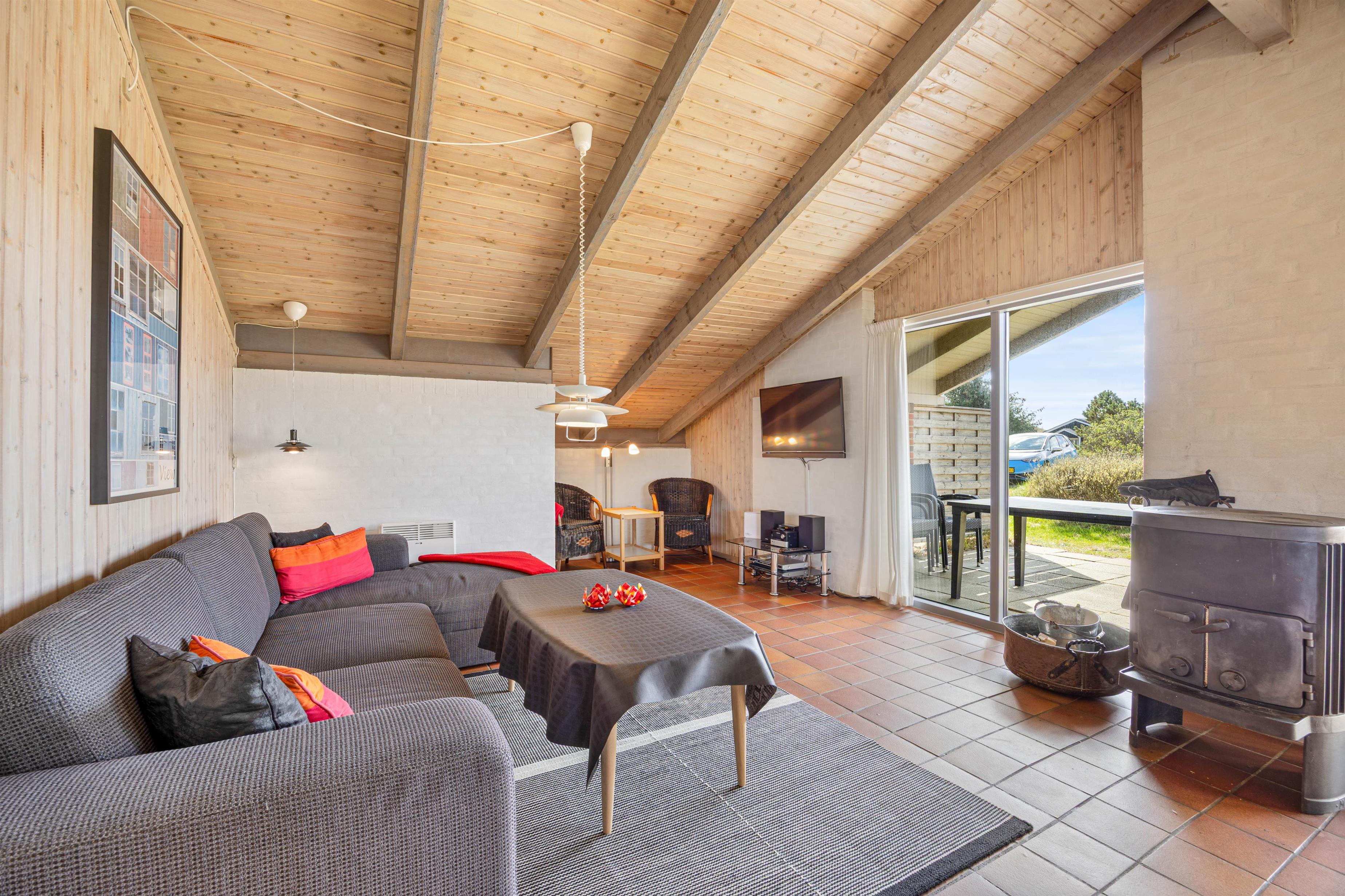Fra entréen er der adgang til alle soveværelser samt til køkkenalrummet. Det funktionelt indrettede køkken er bl.a. udstyret med opvaskemaskine, mikrobølgeovn og en separat fryser på 50 liter. Opholdsstuen har klinkegulv og er klassisk indrettet, med masser af dagslys fra sydvendte vinduer. Forskellige siddepladser indbyder til hyggelige stunder, og i sofahjørnet kan I læse en god bog og slappe helt af. Der er et tv med Chromecast, så I let kan sætte jeres yndlingsfilm eller serier på og hygge jer sammen. En energibesparende luft-til-luft-varmepumpe er installeret, og der er også en brændeovn, som skaber hygge og giver behagelig varme i de kolde måneder.