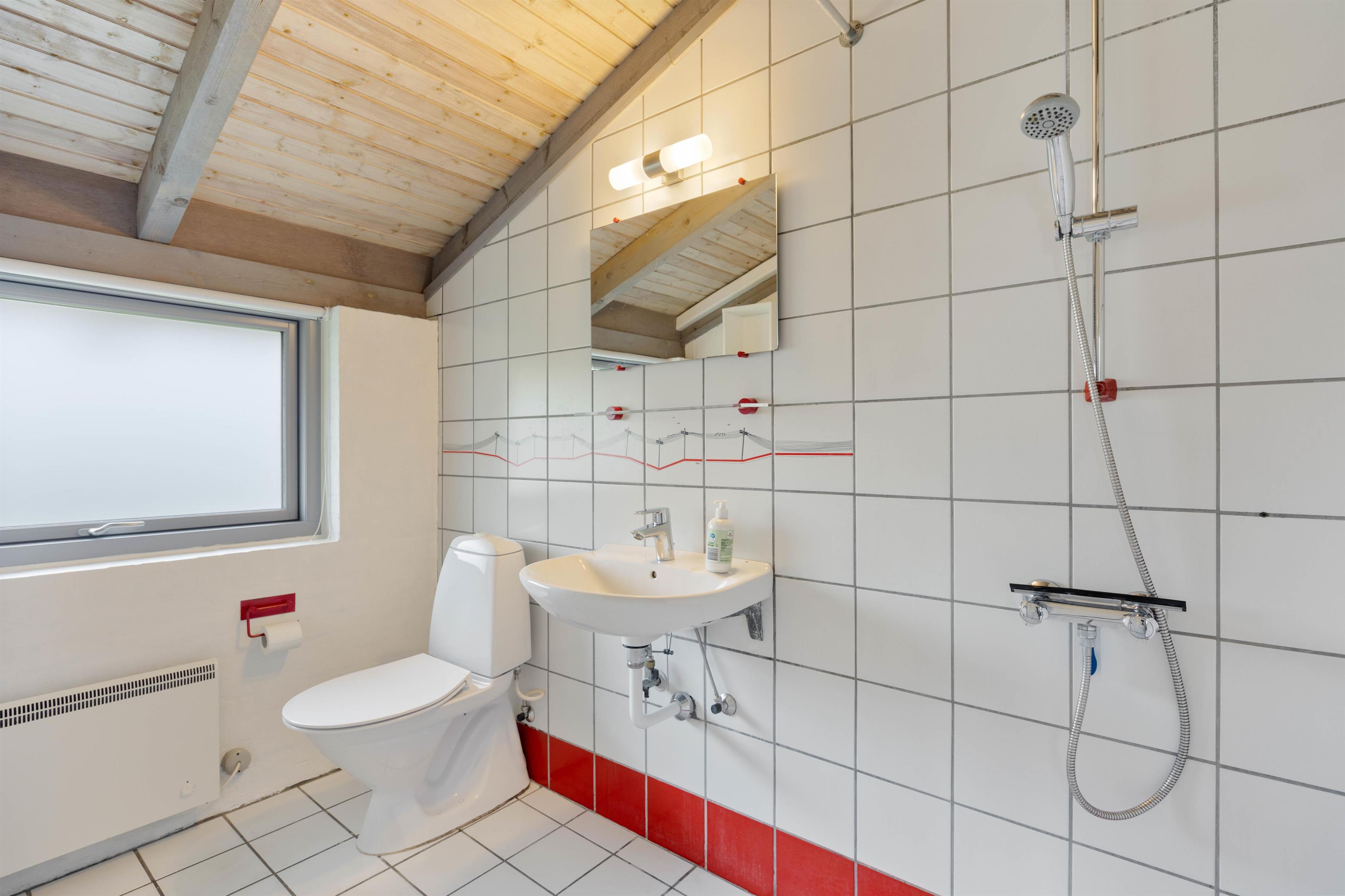 Det klassiske badeværelse er lyst og venligt, og her finder I også indgangen til saunaen.