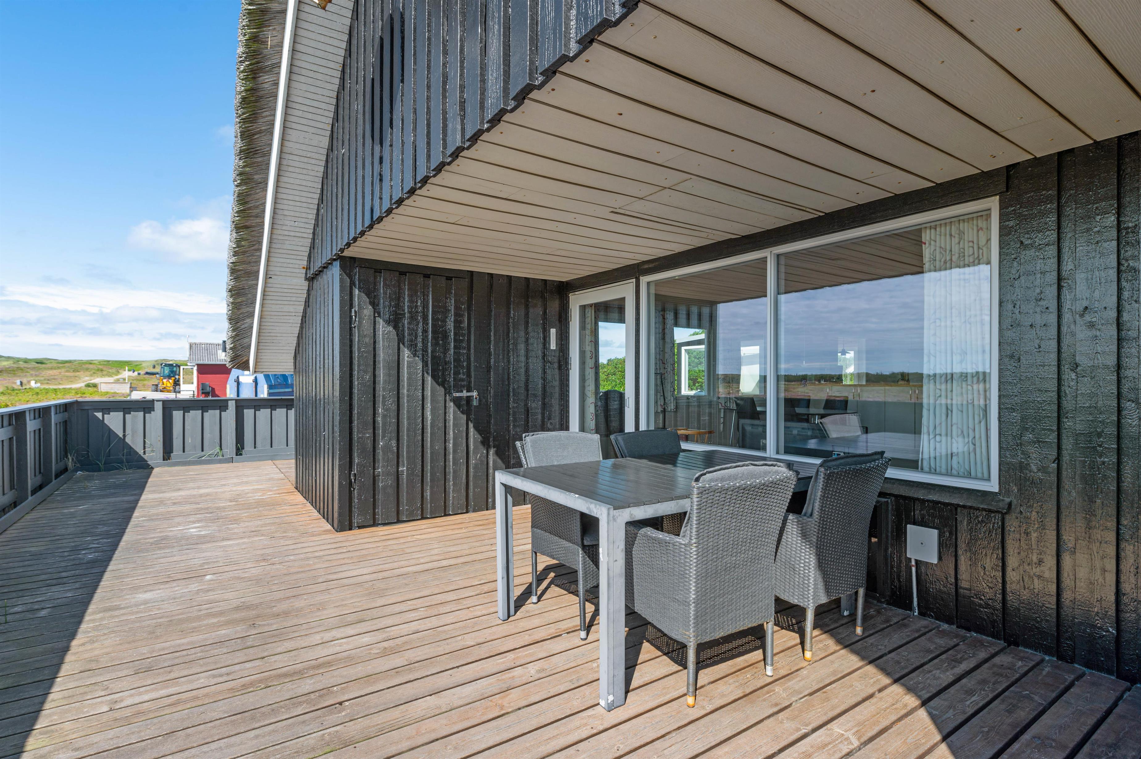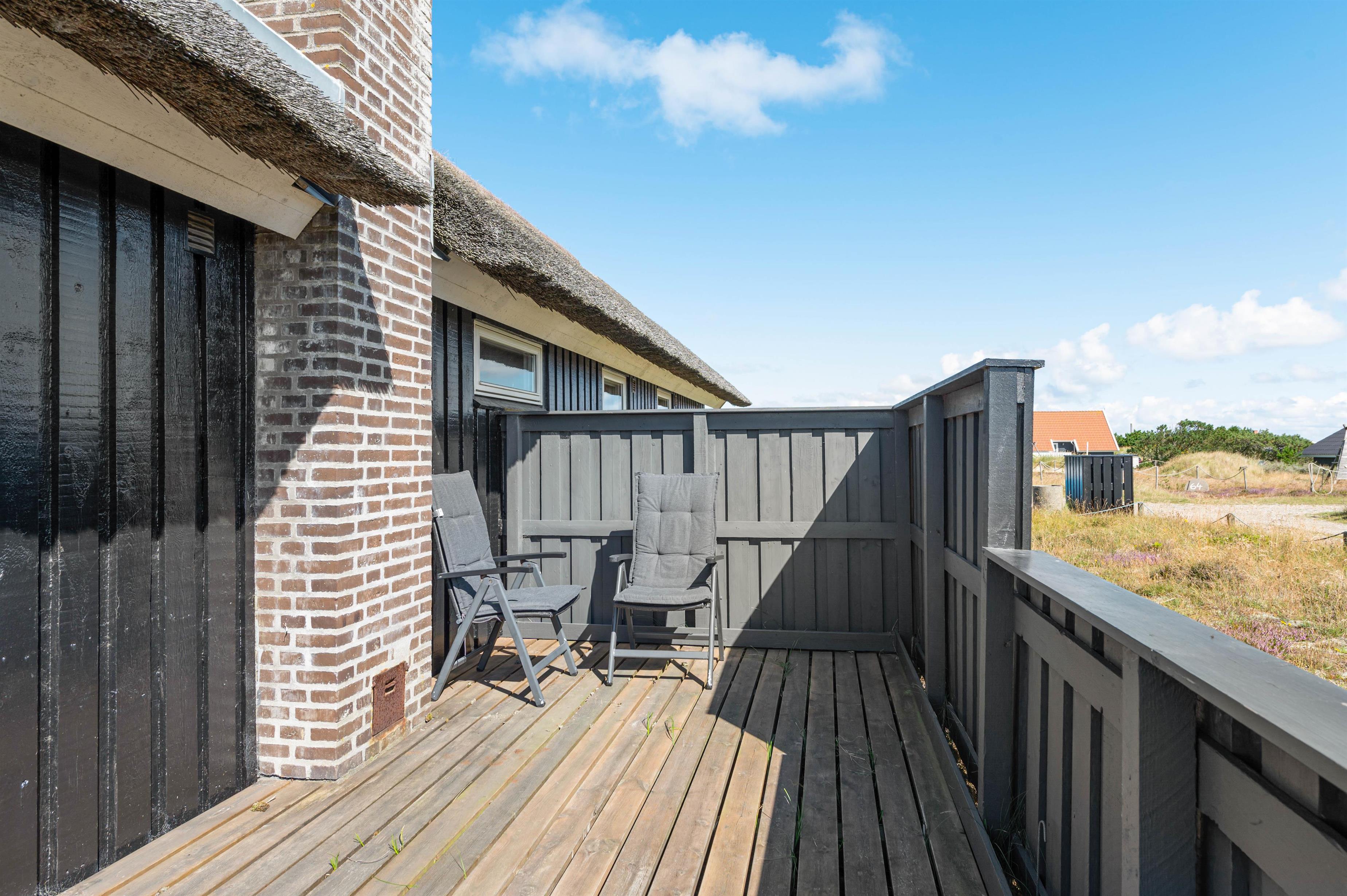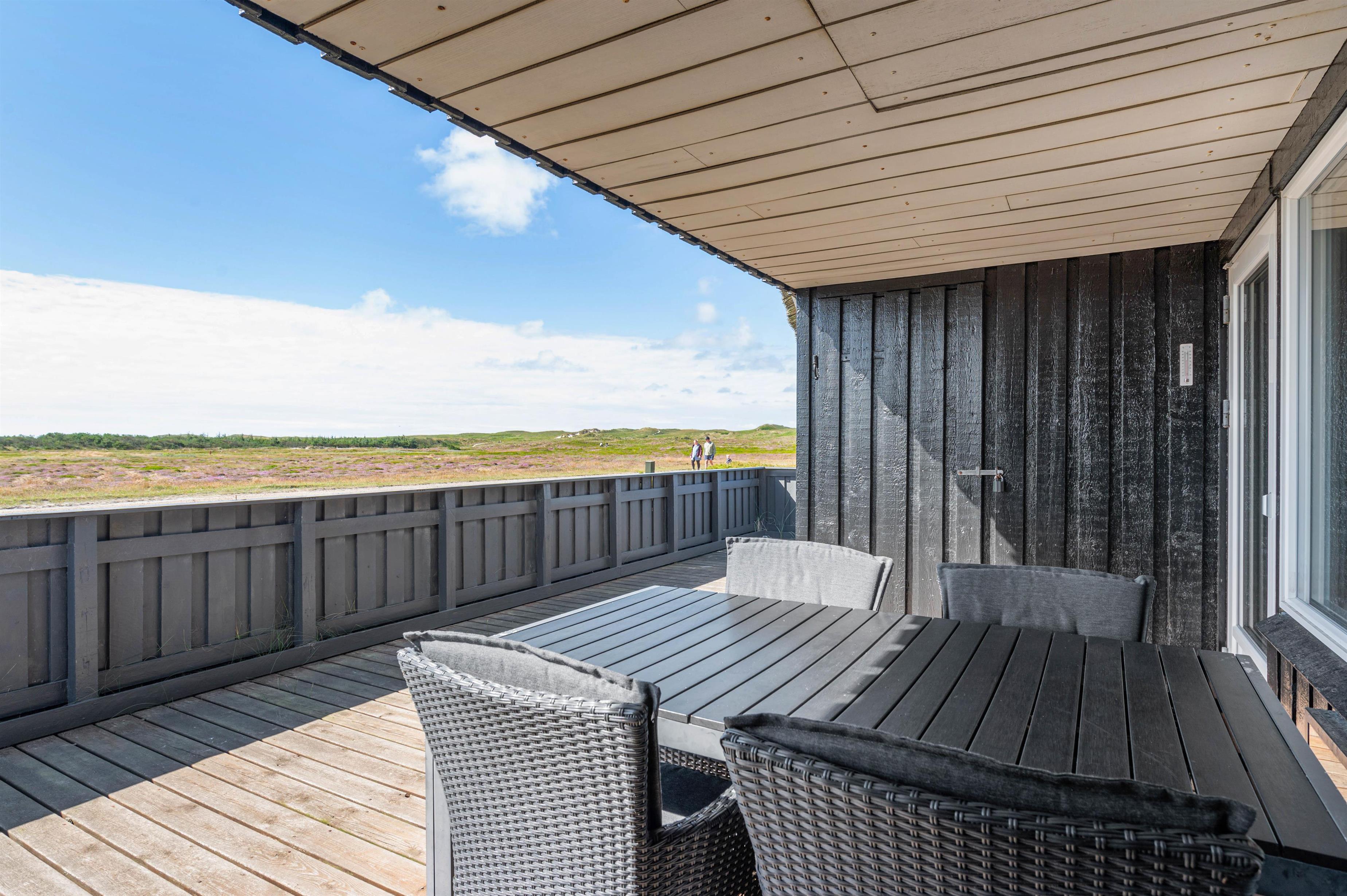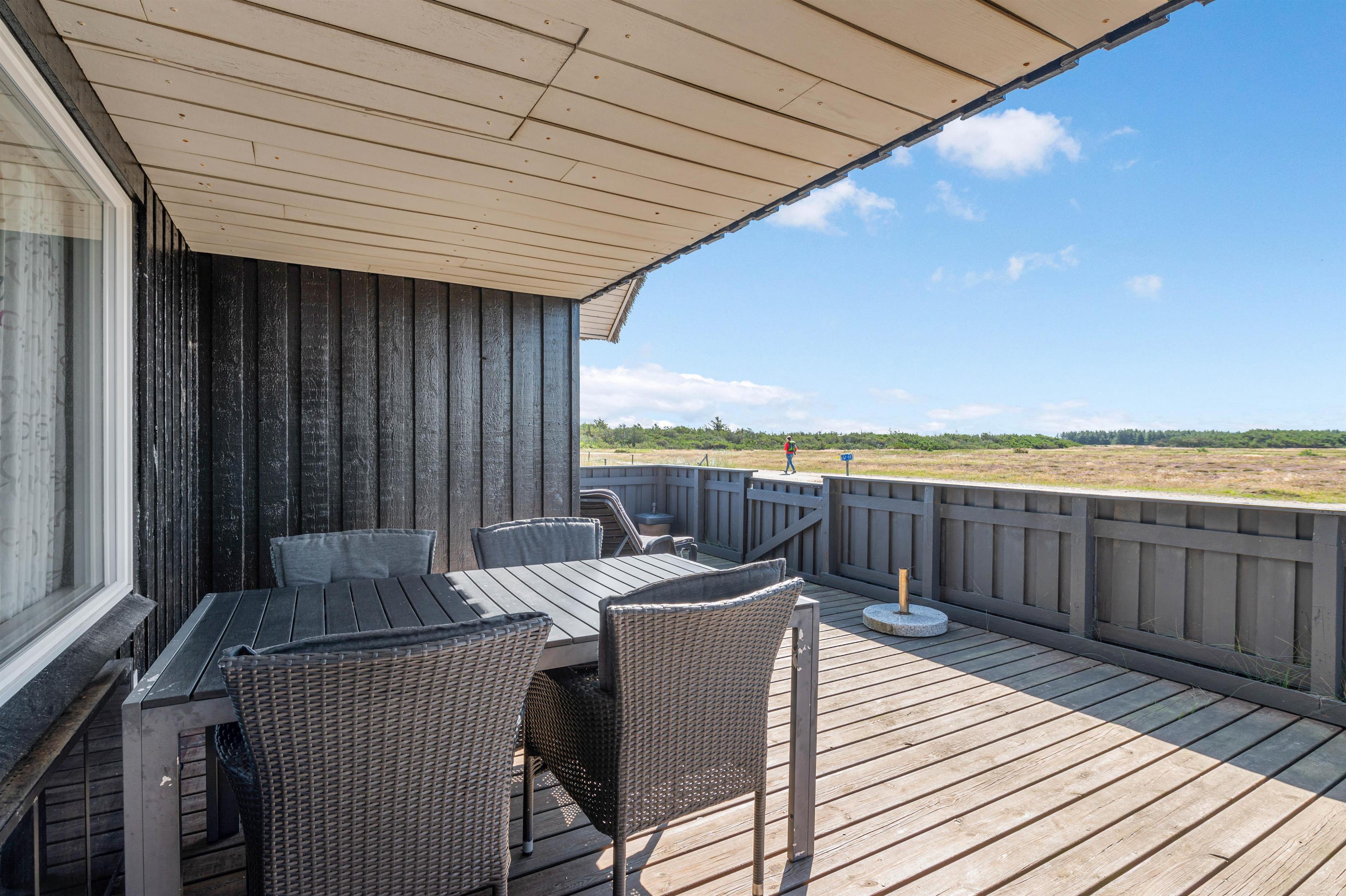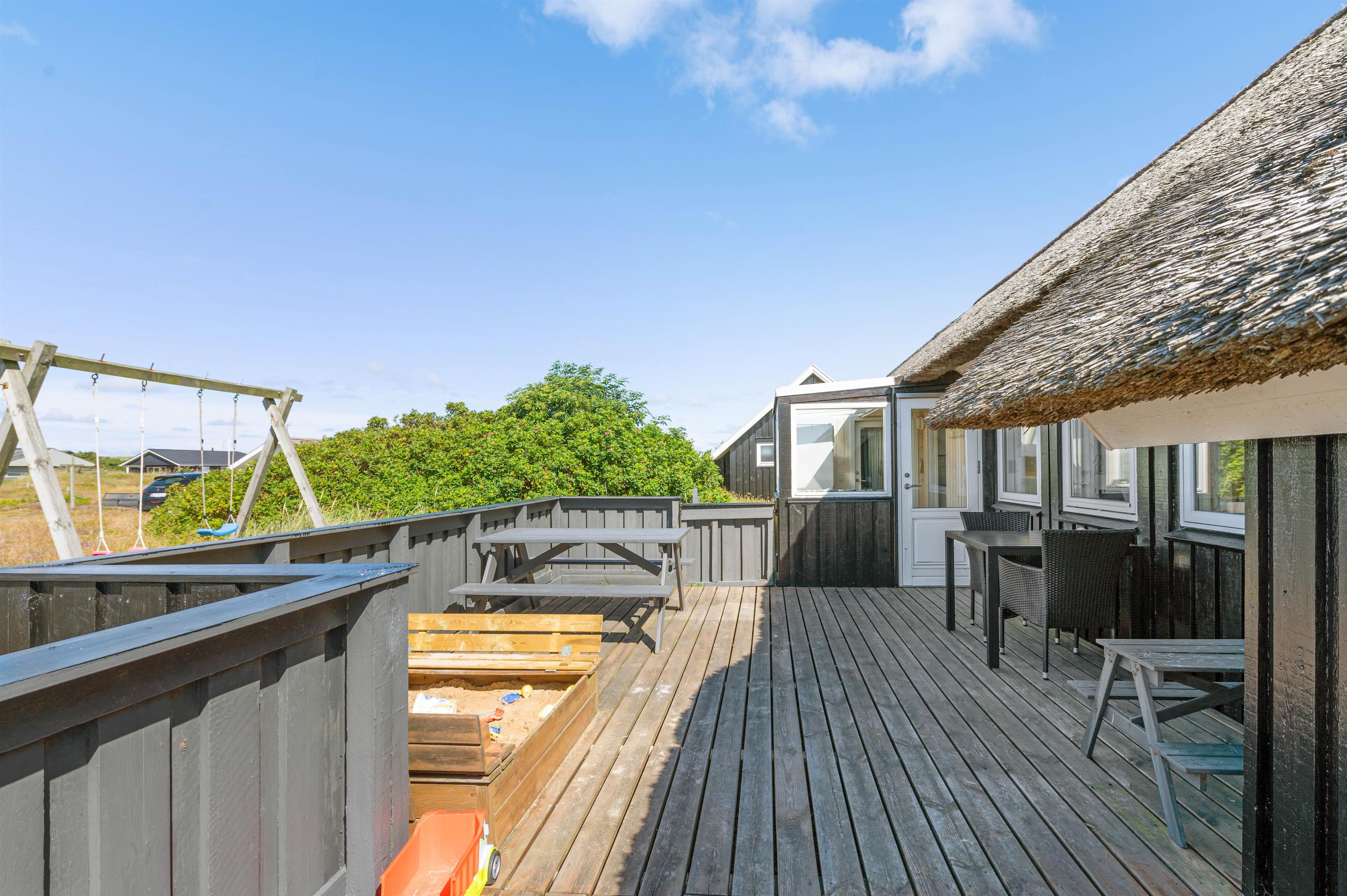 Dette sommerhus har en fantastisk terrasse, som er helt lukket, hvilket er ganske ideel for familier med børn og hunde. Terrassen strækker sig omkring sommerhuset fra vest og mod syd. Mod syd er den endvidere delvist overdækket. På terrassen er der også en sandkasse, hvilket gør terrassen til et skønt opholdssted for familiens børn. På naturgrunden er der endvidere et gyngestativ.