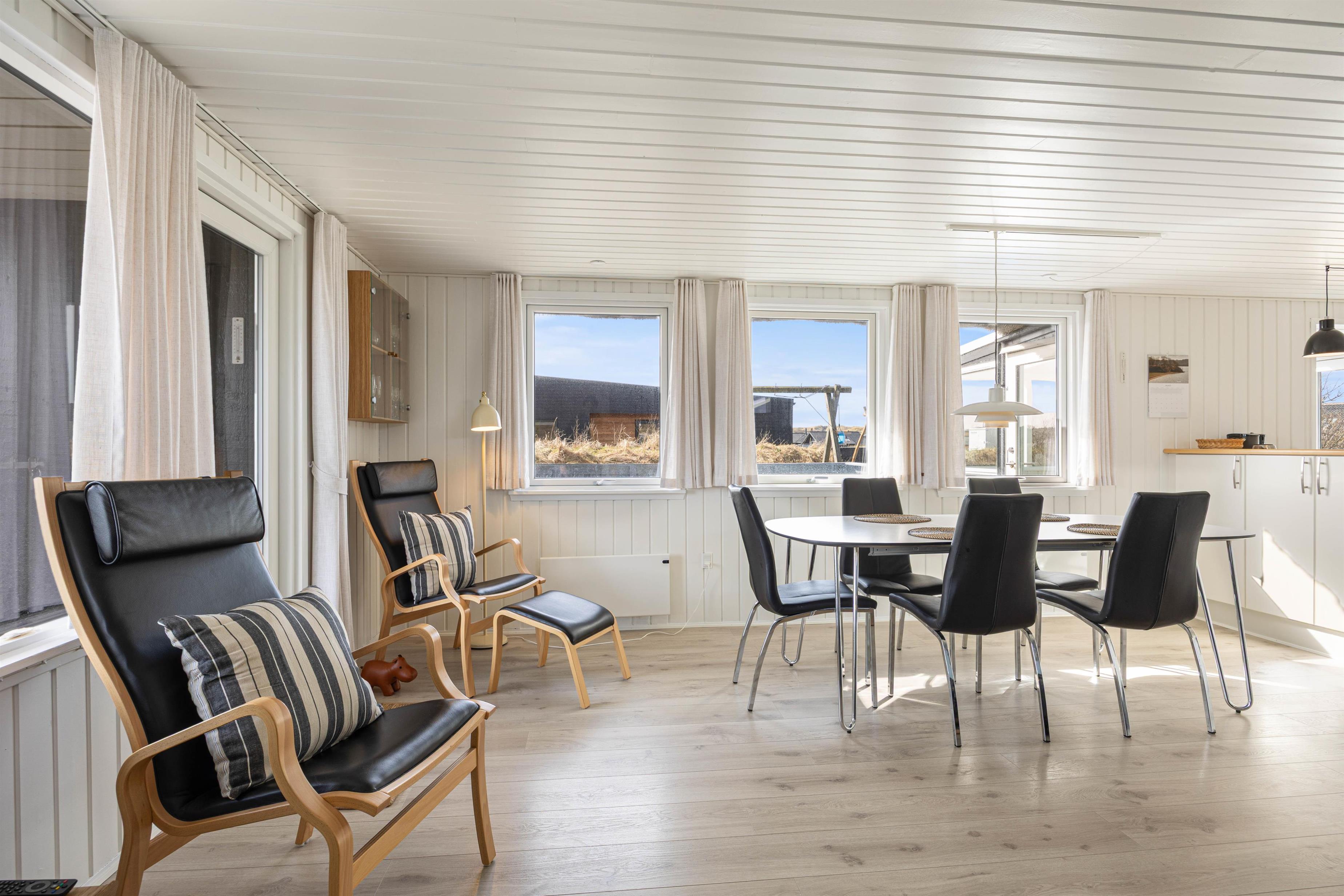 Der er 3 soveværelser i sommerhuset, 2 af værelserne har dobbeltsenge, og på det sidste er der 1 enkeltseng. Badeværelset har en bruseniche og der er gulvvarme, og indgangen til saunaen foregår gennem badeværelset. Saunaen er helt perfekt efter en gåtur ved Vesterhavet på en blæsende efterårsdag.