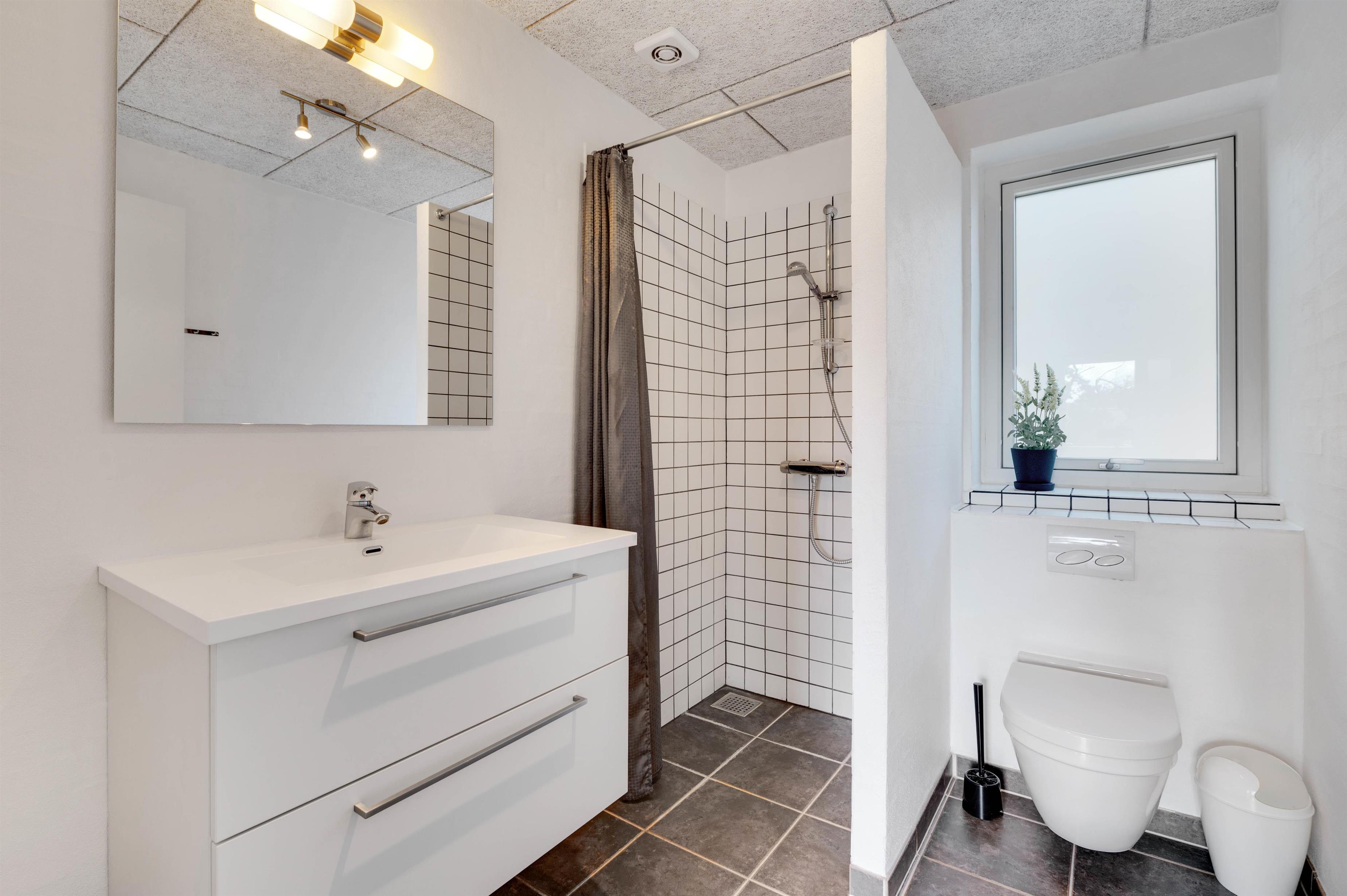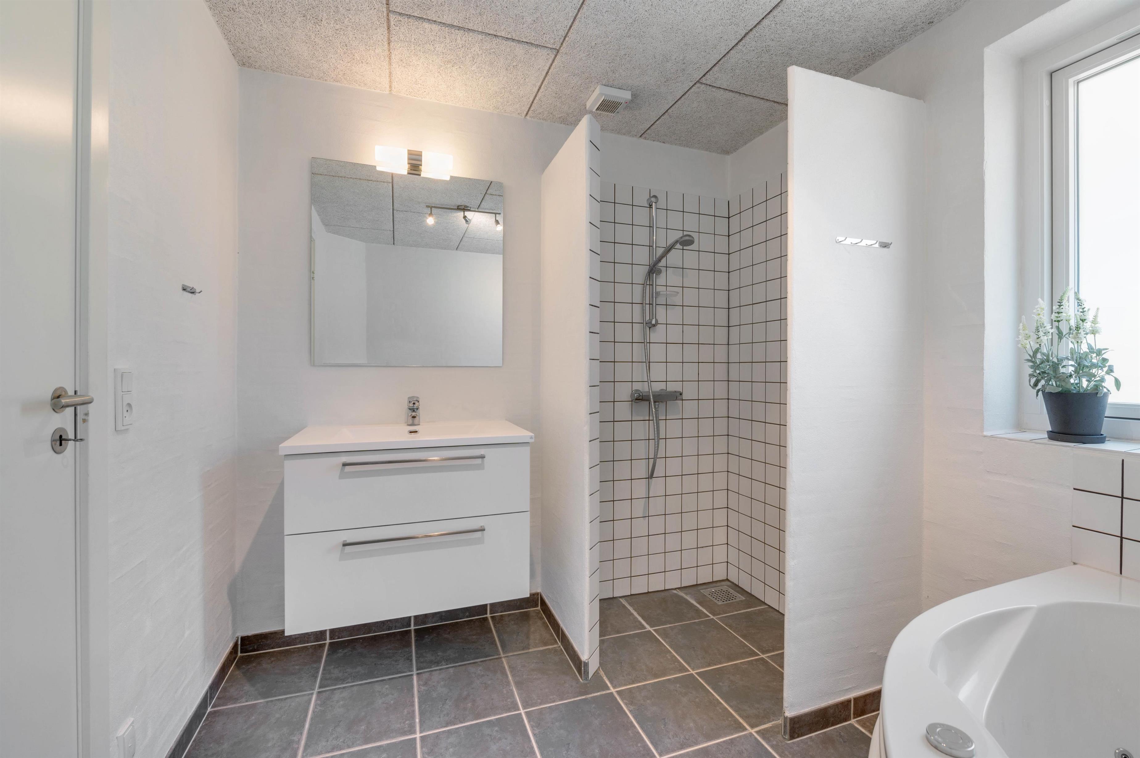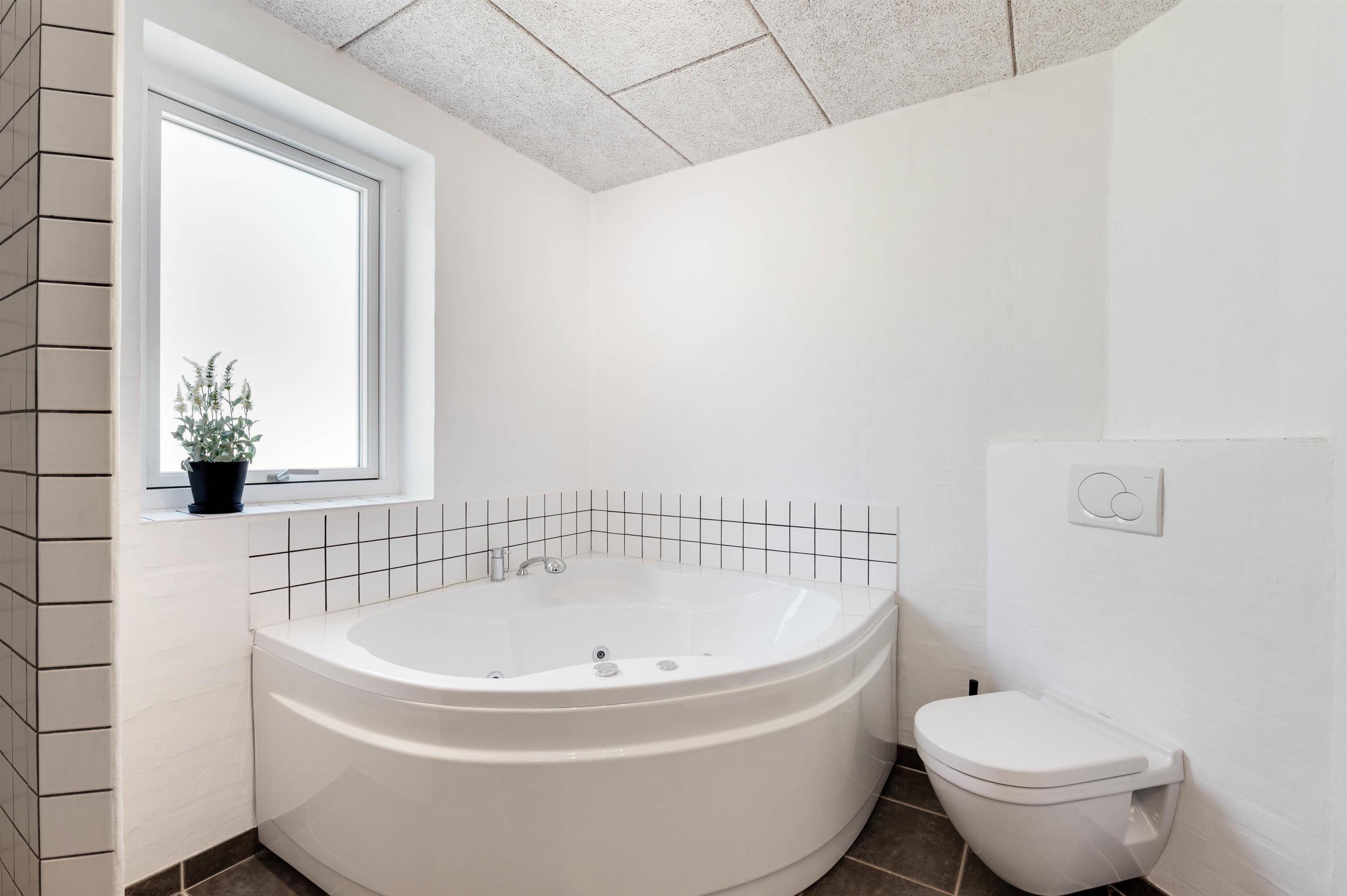 Sommerhuset har 2 flotte badeværelser med gulvvarme og bruser. Det store badeværelse har desuden et dejligt boblebad til 2 personer.