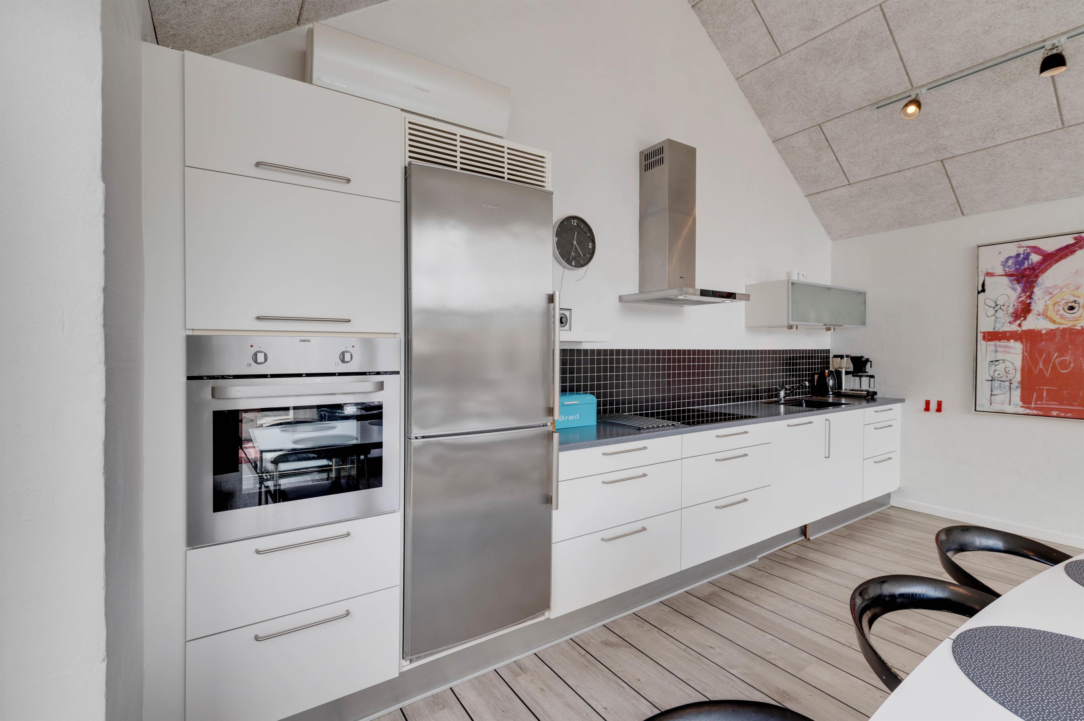 Her er et lækkert køkken med alt i hårde hvidevarer, som står i åben forbindelse med stuen. I opholdsrummet og køkkenet er der åbent til kip og masser af lysindfald fra det store sydvendte vinduesparti. Rummet har en rigtig god akustik takket være det specielle materiale, loftet er udført i. Stuen er superflot møbleret med komfortable møbler og har naturligvis brændeovn og fladskærm. Her er desuden en gratis internetforbindelse.