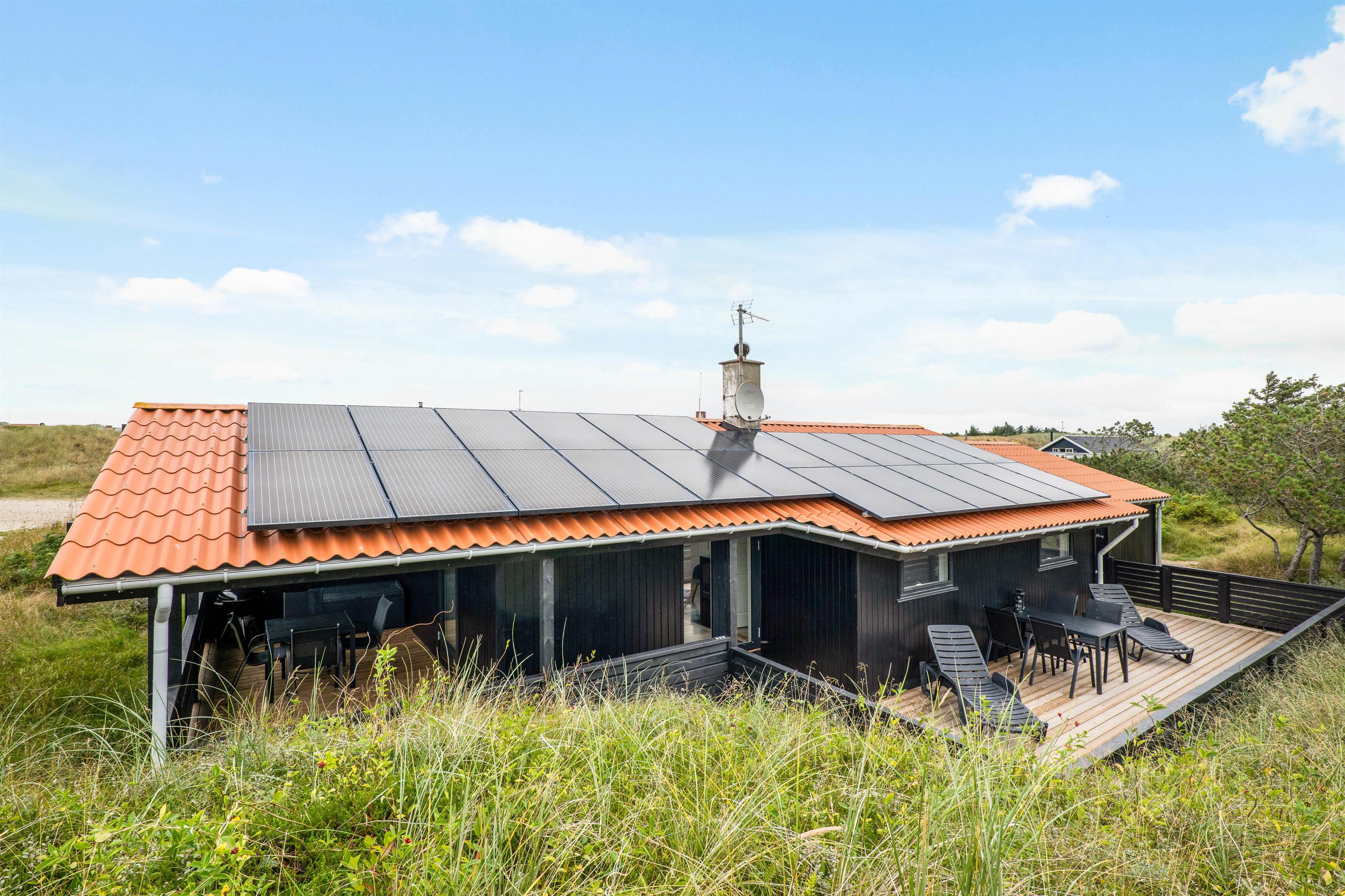 Rundt om huset er der et godt terrasseareal mod syd og vest– både med delvis og helt overdækket områder – og desuden er den helt lukket. Terrassen mod syd ligger helt ugeneret – afskærmet af en lille klit.