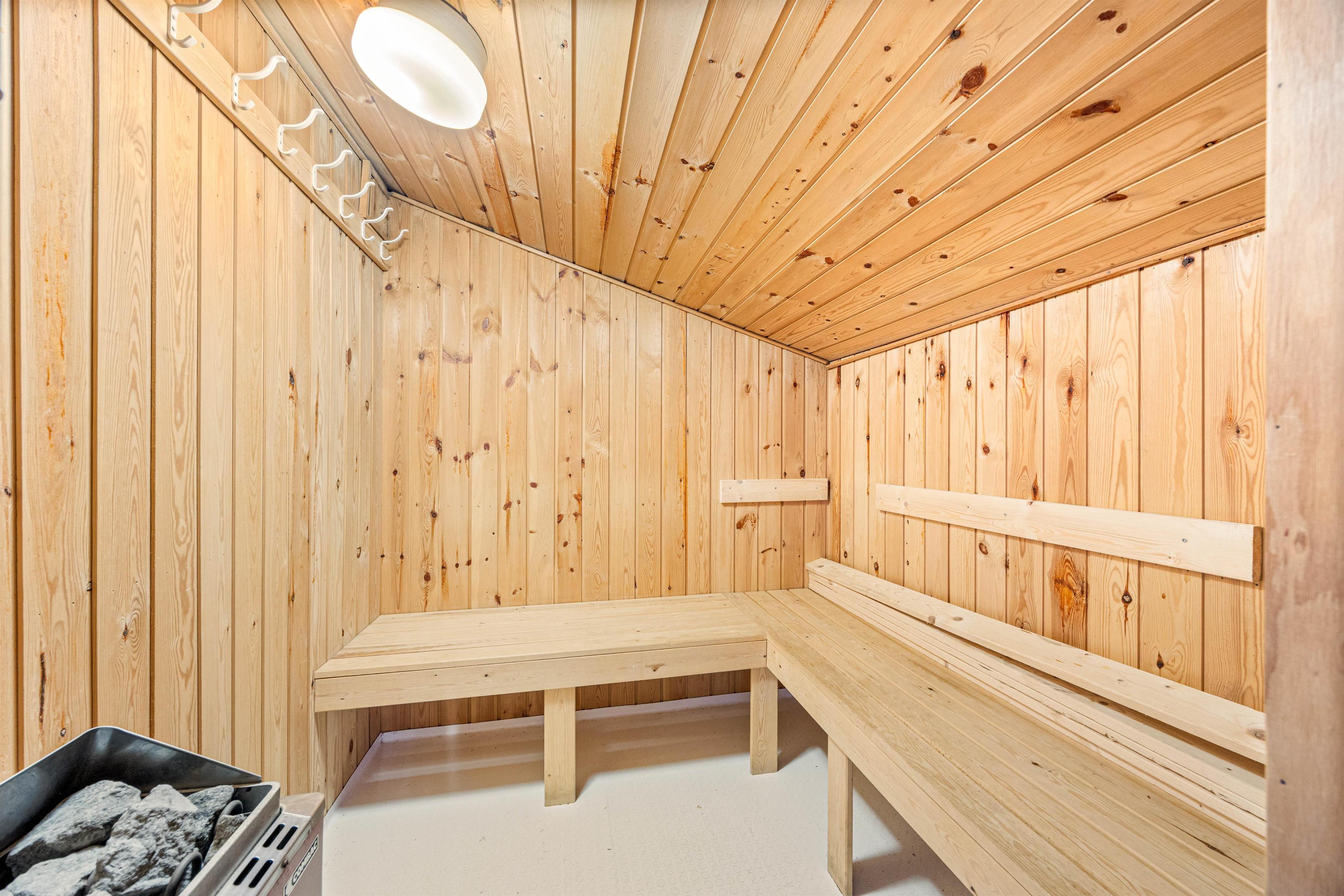 Saunaen indbyder til afslappende stunder direkte i sommerhuset og sørger for en behagelig varme. En særlig detalje er, at der er adgang til saunaen fra stuen, så hyggelige aftener og afslappende saunabesøg nemt kan kombineres.