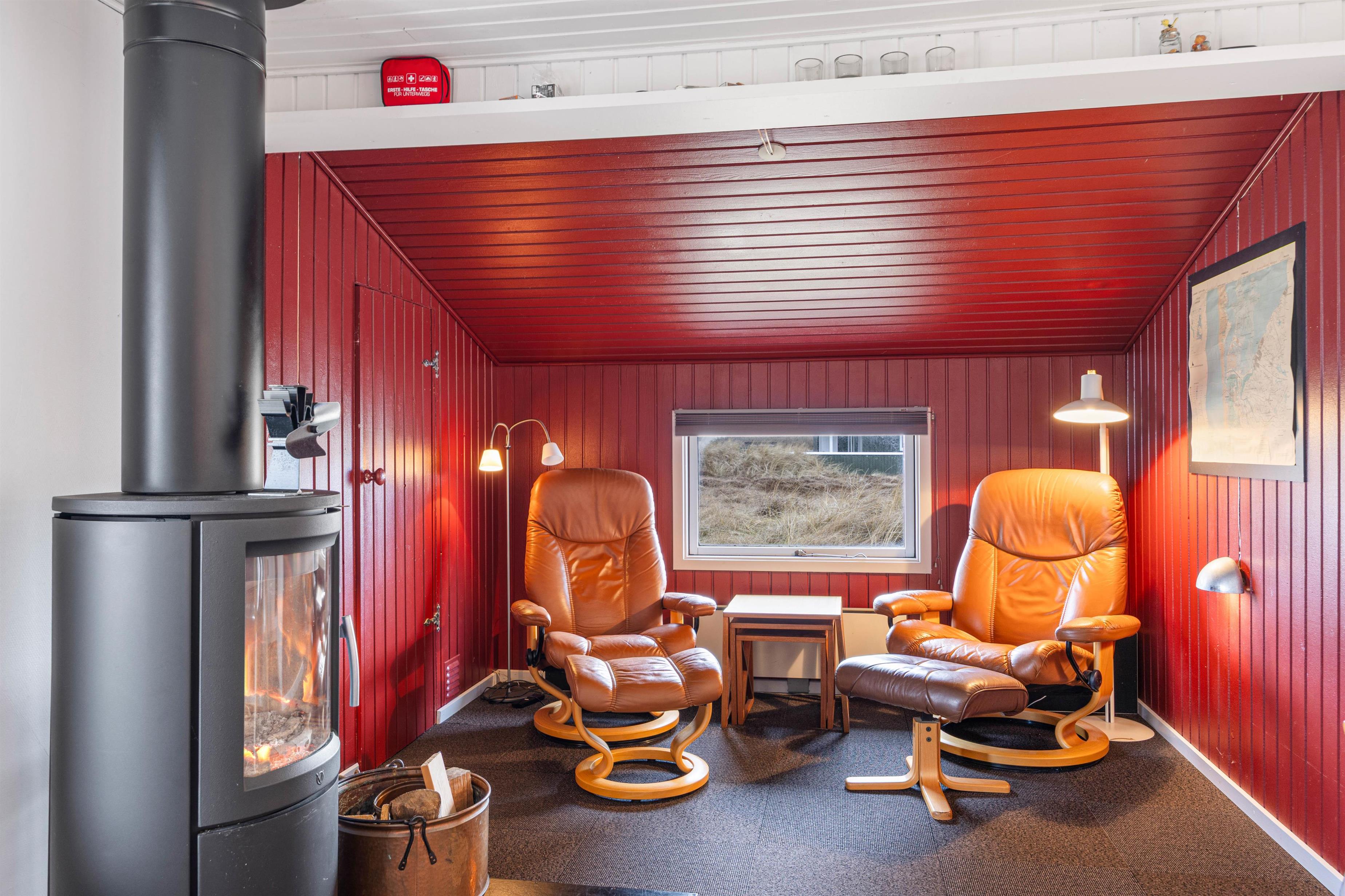 Opholdsrummet fungerer som husets naturlige samlingspunkt, hvor der er plads til at spise, slappe af og være sammen i løbet af dagen. På køligere dage kan brændeovnen tages i brug og skabe en hyggelig stemning, mens varmepumpen sørger for en behagelig og energieffektiv opvarmning året rundt. Der er også Chromecast til film og serier.