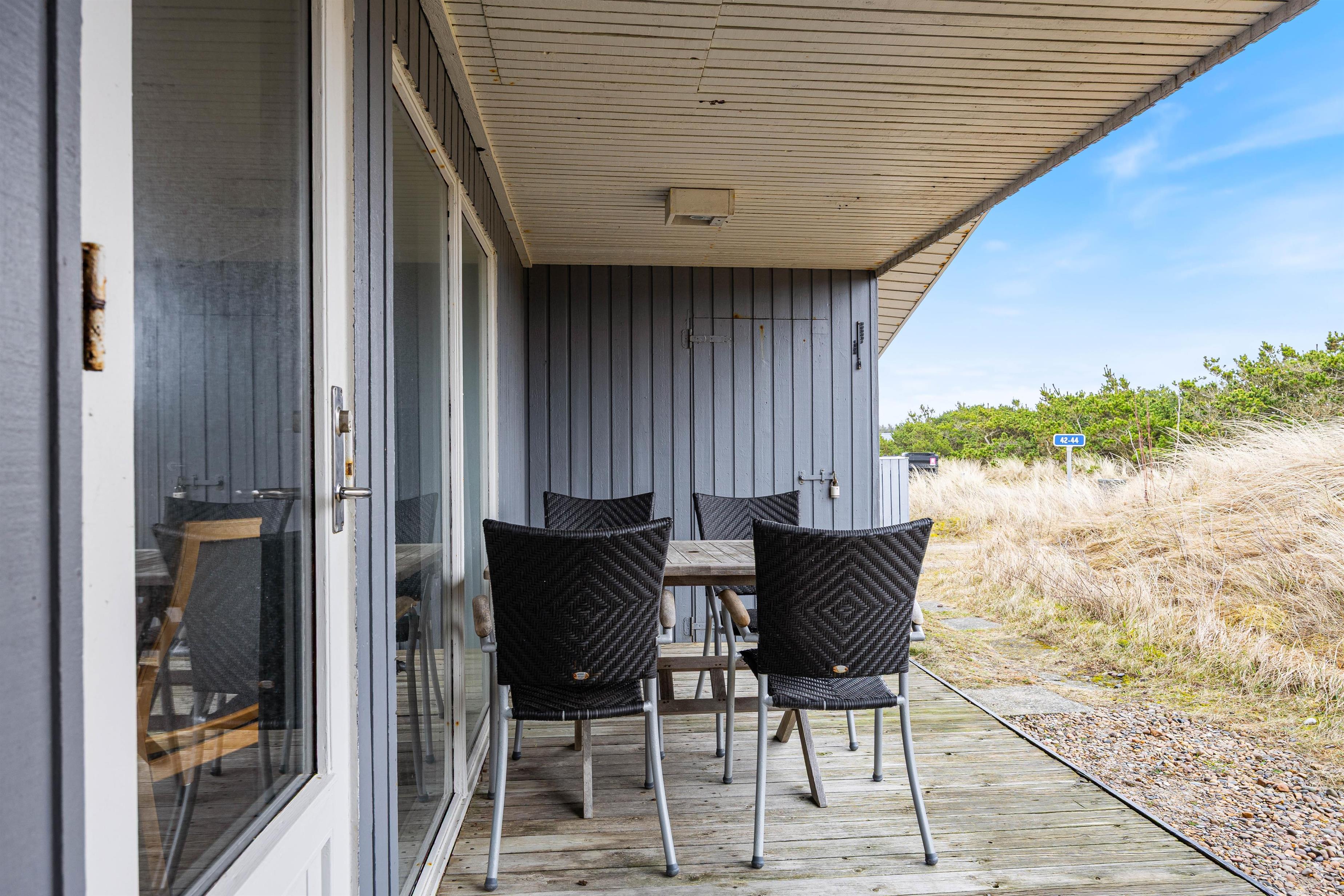 Udearealerne består af en åben, afskærmet og overdækket terrasse, hvilket giver mulighed for at opholde sig udendørs under forskellige vejrforhold. Det gør det muligt at finde læ eller sidde ude, afhængigt af vind og temperatur. Der er desuden en grill til rådighed, som kan bruges til måltider udendørs. Sommerhuset ligger på en naturgrund med typisk vestjysk beplantning og omgivelser.