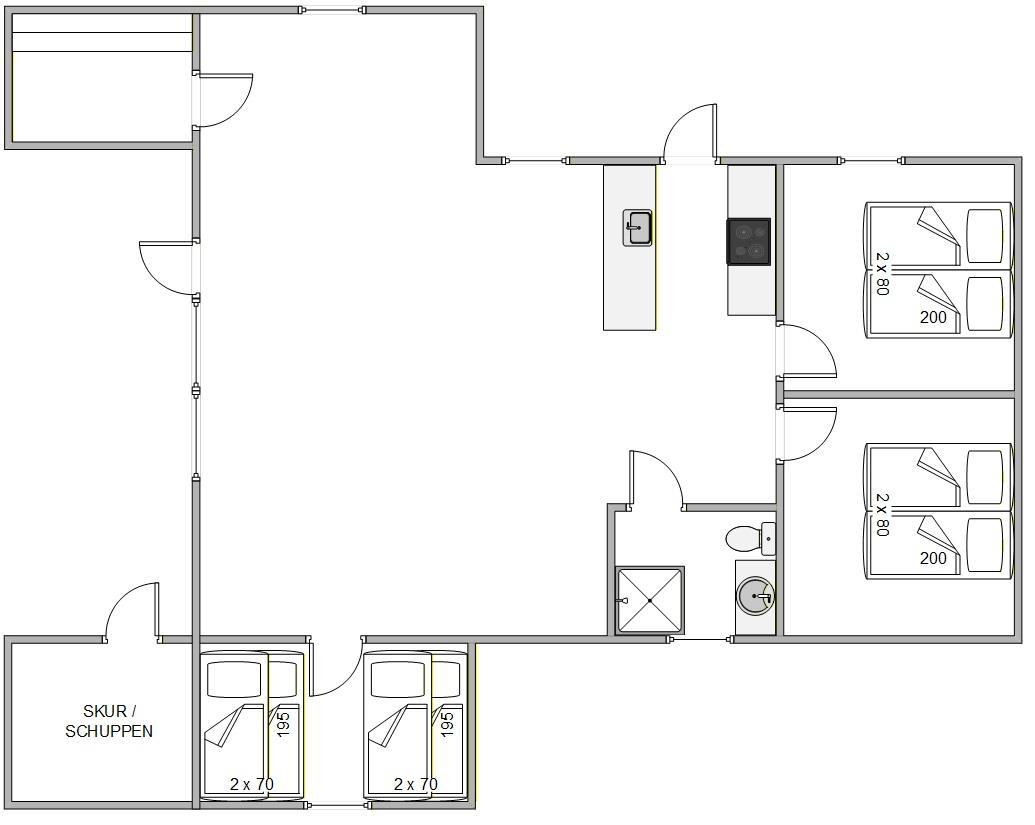 Sommerhuset er 85 m² og har plads til 4 personer. Indretningen er enkel og praktisk. Der er 3 soverum: 2 med dobbeltsenge og 1 med 2 køjesenge, hvilket giver en fleksibel fordeling af sovepladserne – uanset om I er familie eller et mindre selskab.